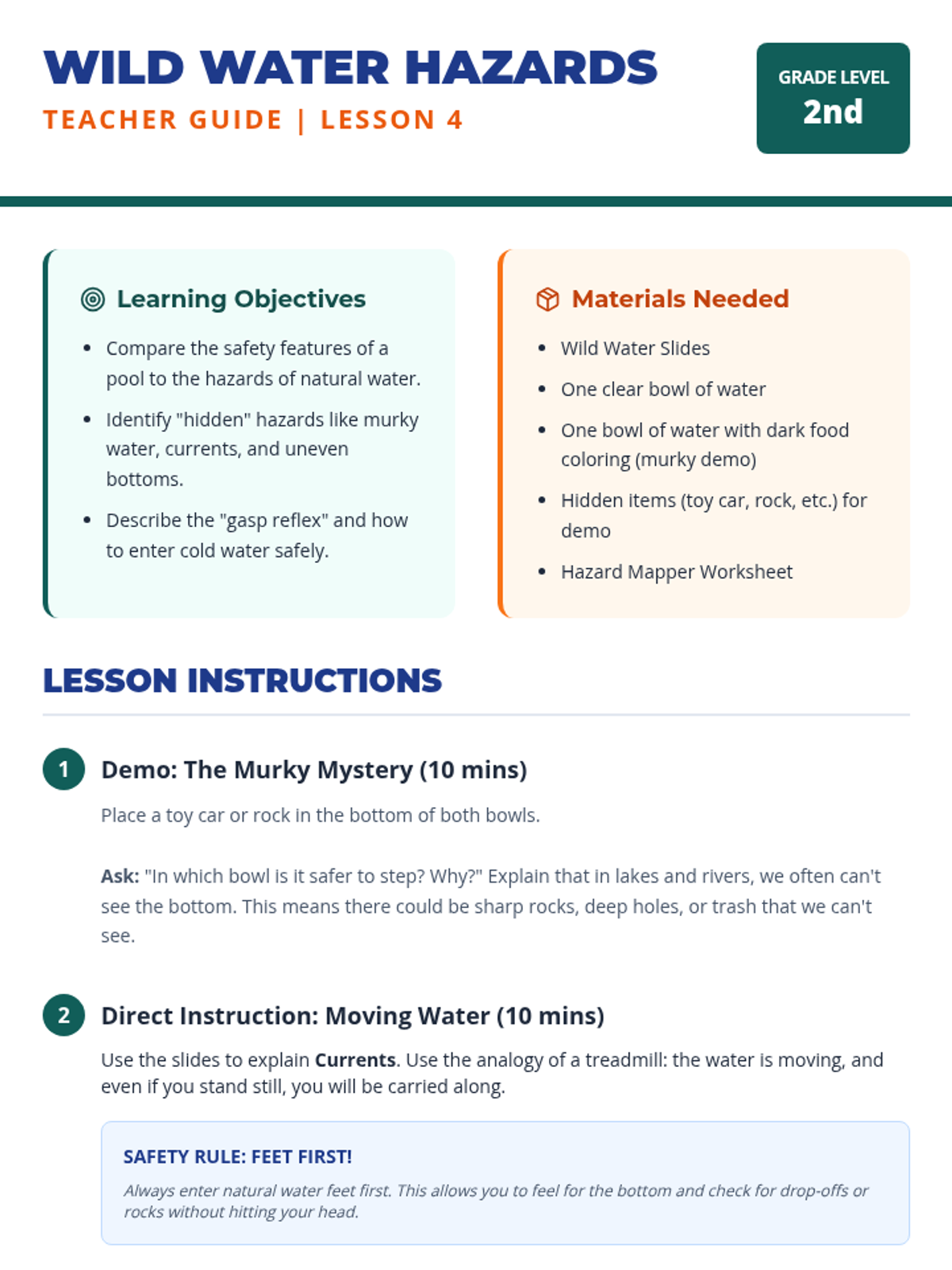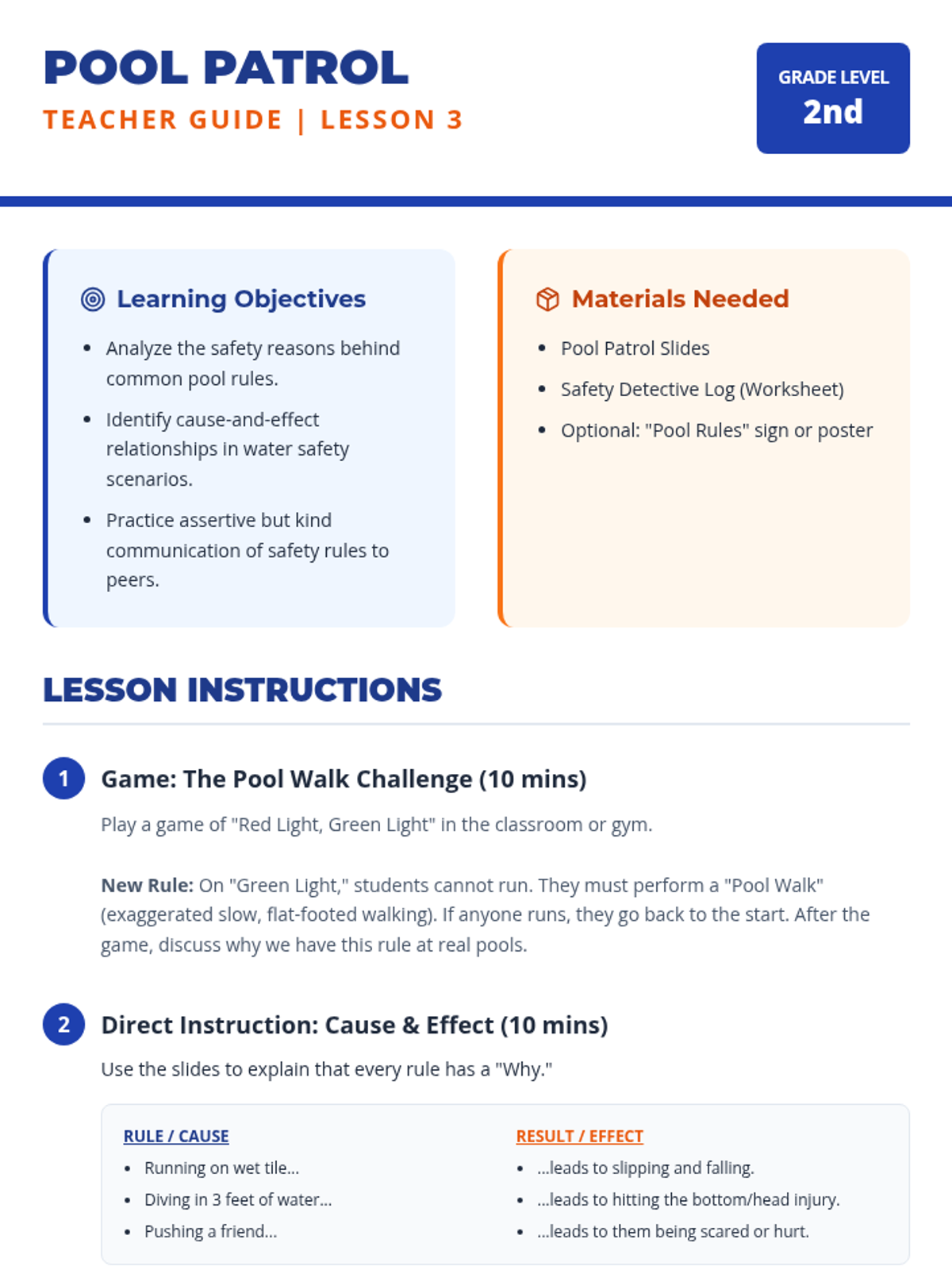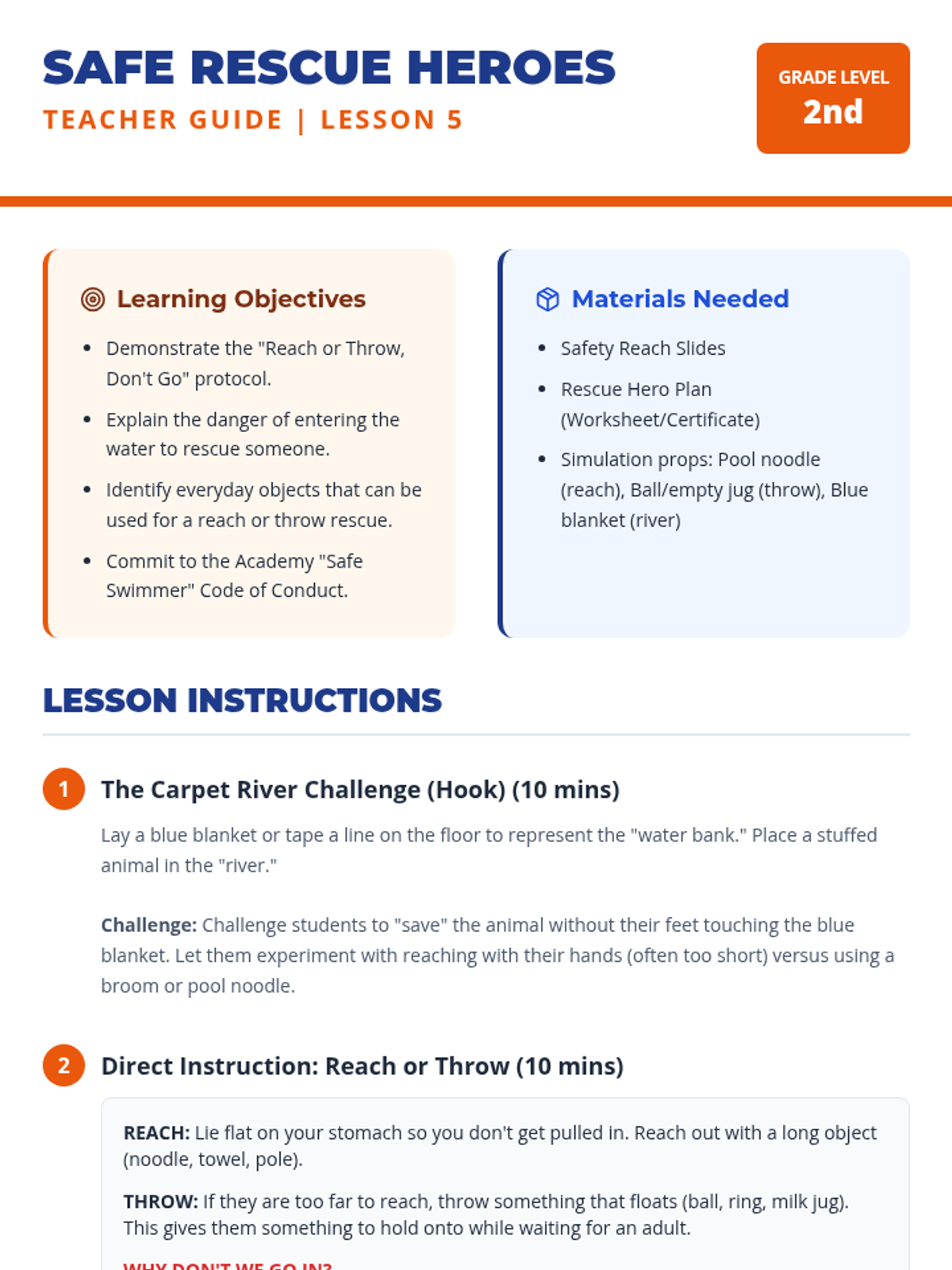 A comprehensive 2nd Grade sequence exploring water safety through the lens of a 'Junior Lifeguard Academy.' Students learn about supervision, flotation equipment, pool behavior, open water hazards, and emergency 'reach or throw' protocols.
