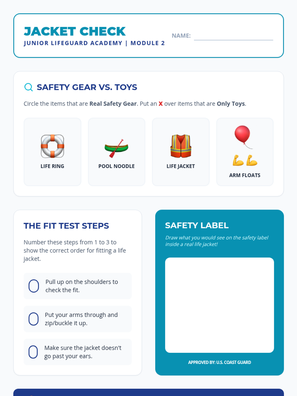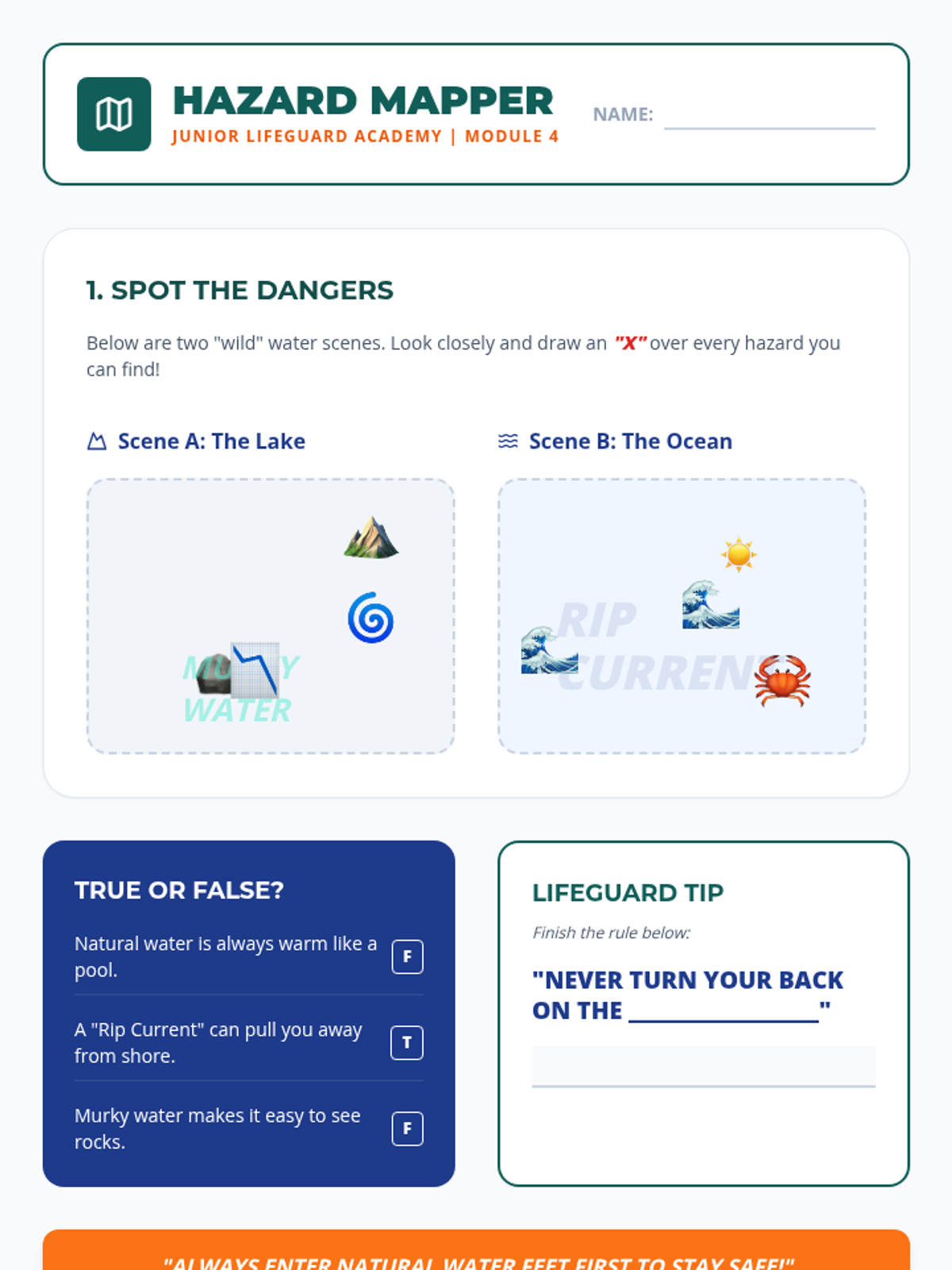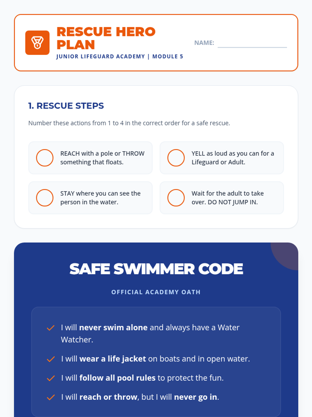 A comprehensive 2nd Grade sequence exploring water safety through the lens of a 'Junior Lifeguard Academy.' Students learn about supervision, flotation equipment, pool behavior, open water hazards, and emergency 'reach or throw' protocols.