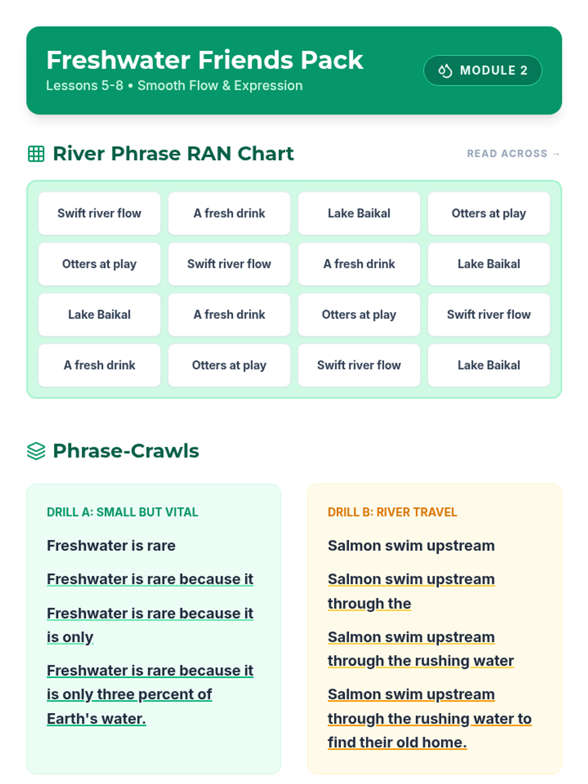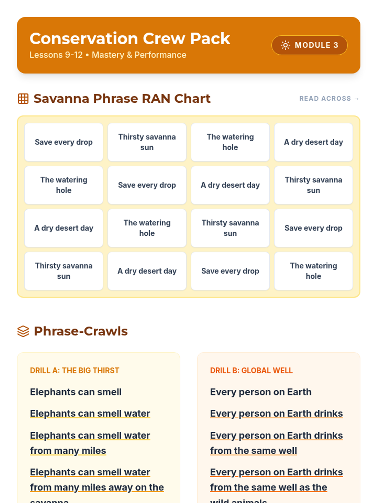 A 12-lesson fluency intervention focusing on water conservation and animals, combining RAN charts, phrase practice, and reader's theater. Designed for 3rd grade students to build automaticity and expression during a 25-minute block.