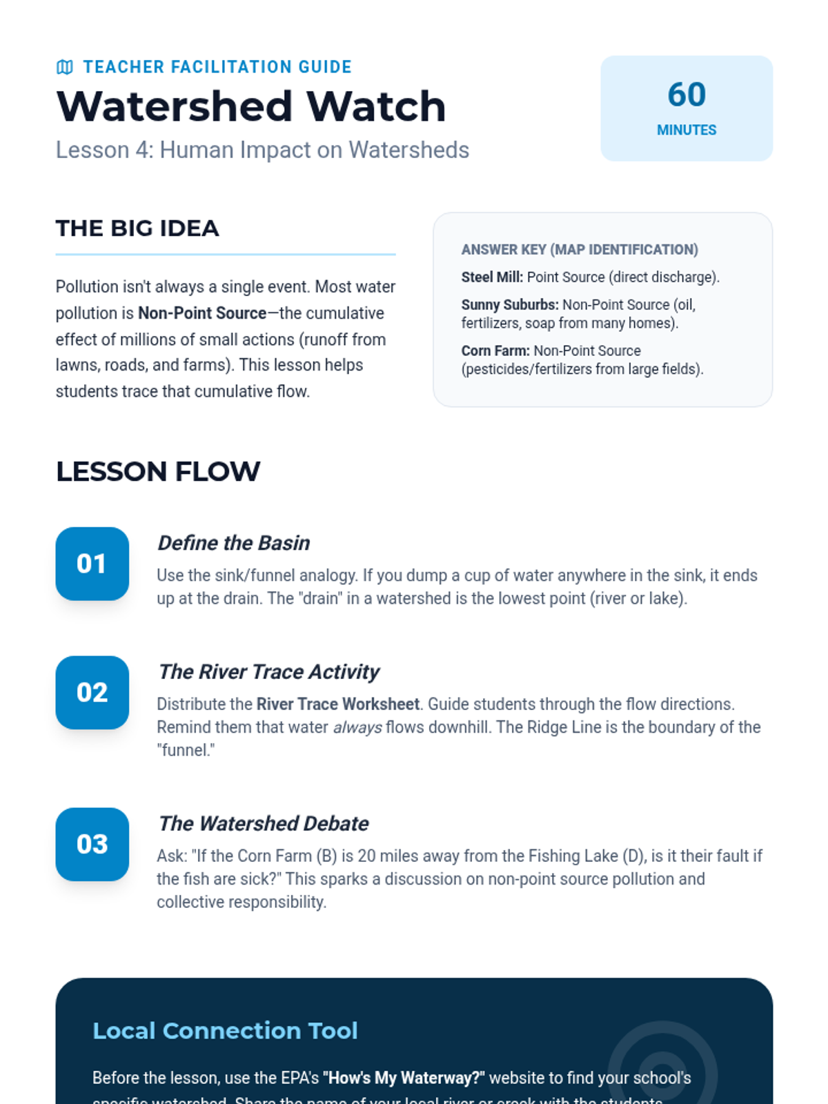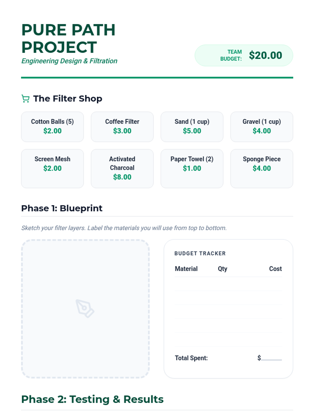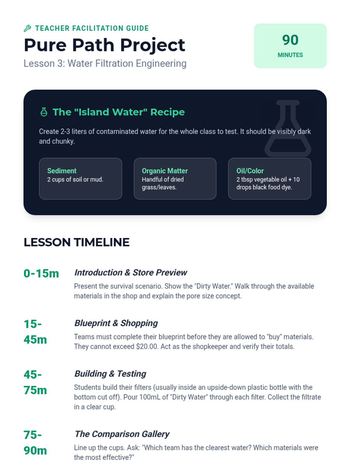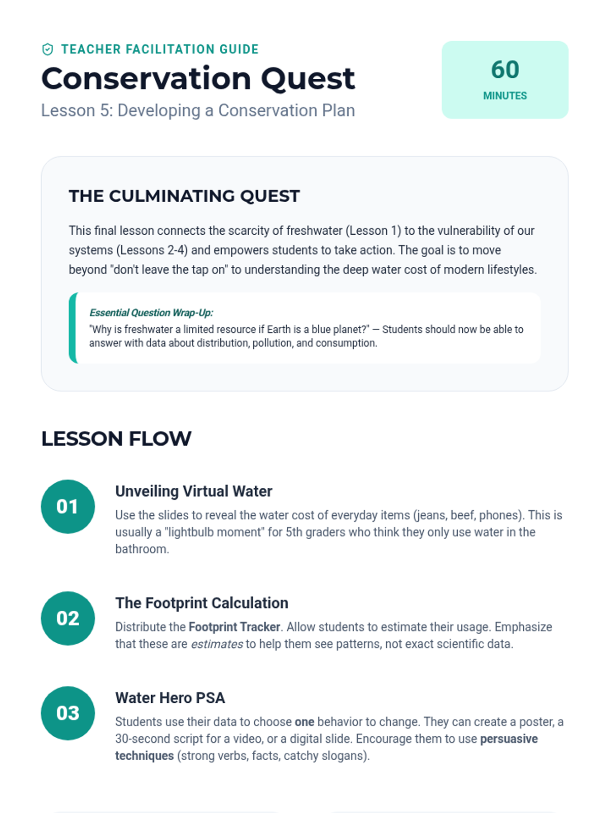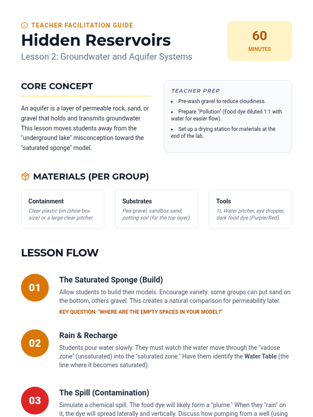 This inquiry-driven sequence focuses on the finite nature of Earth's freshwater and the systems required to manage it. Students explore water distribution, groundwater, engineering filtration, and conservation strategies.
