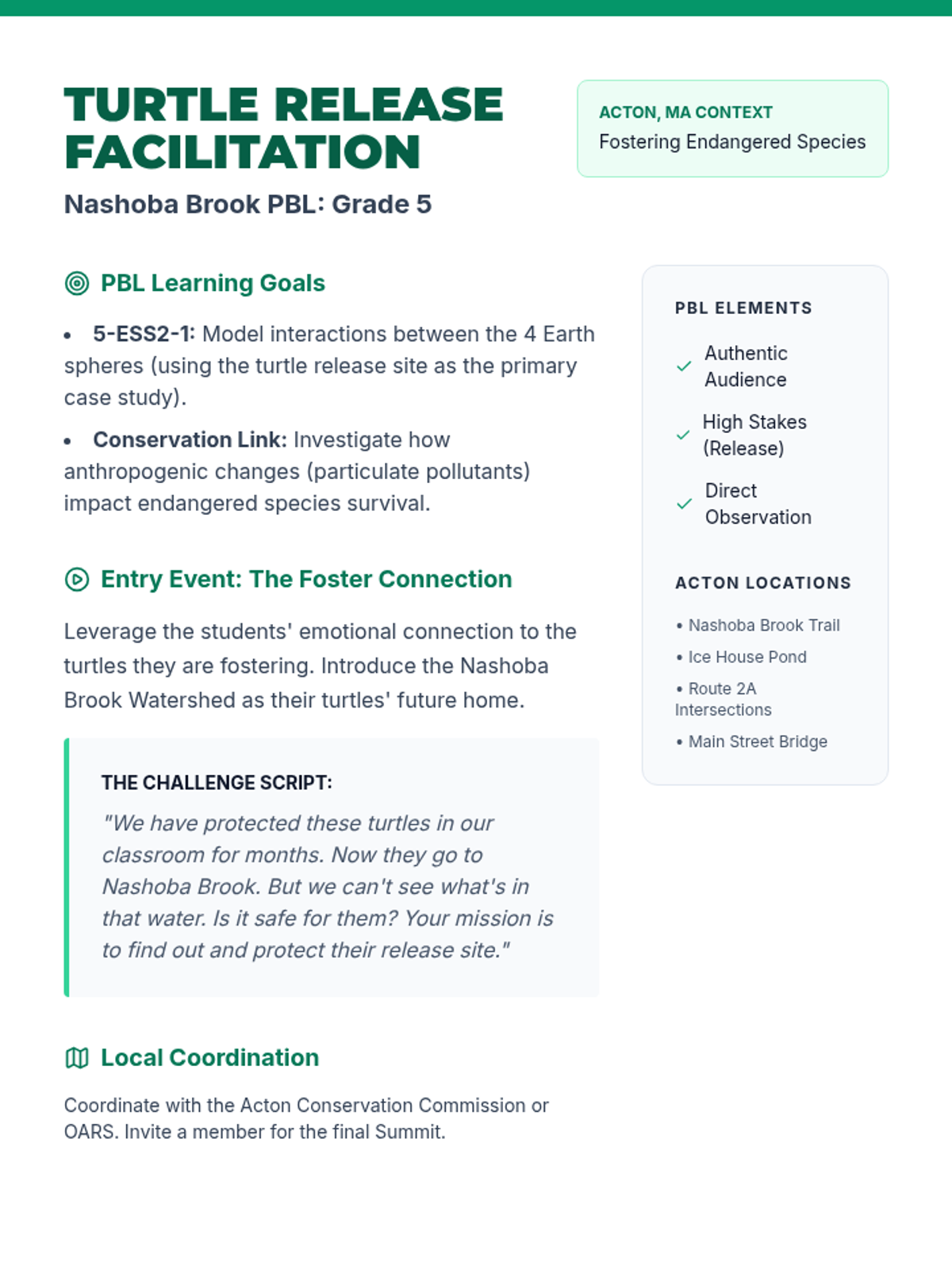 A Gold Standard PBL unit where students investigate Earth's systems and human impact to design a community exhibit for local endangered turtle conservation in the Nashoba Brook watershed. Students explore water distribution, sphere interactions, and engineering design through the lens of protecting their 'headstarted' Blanding's turtles.