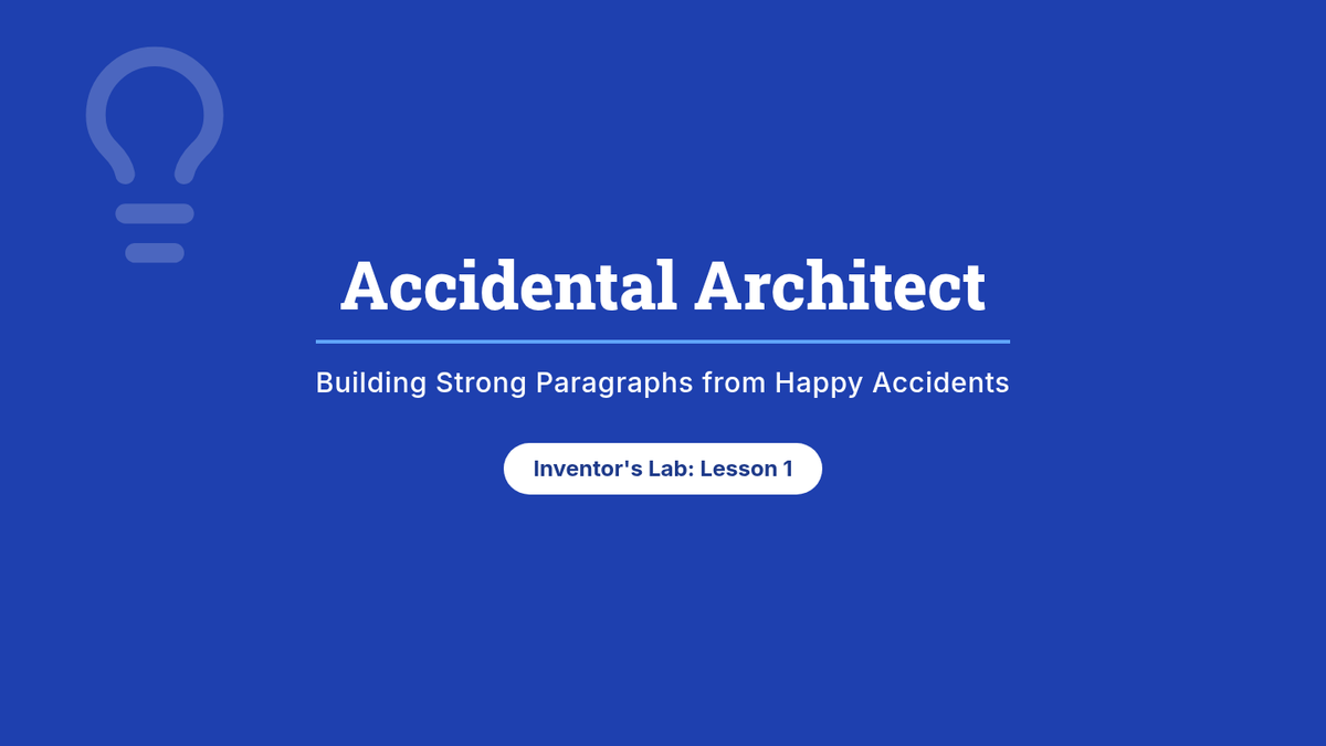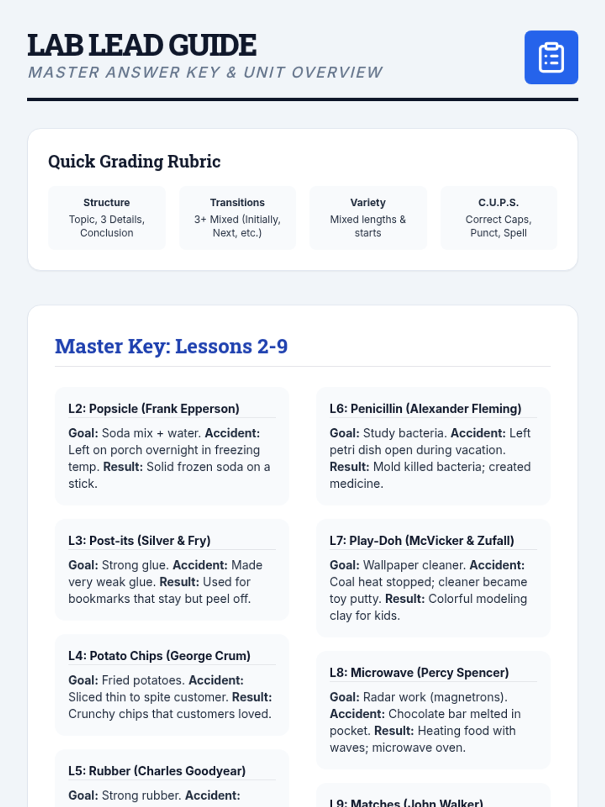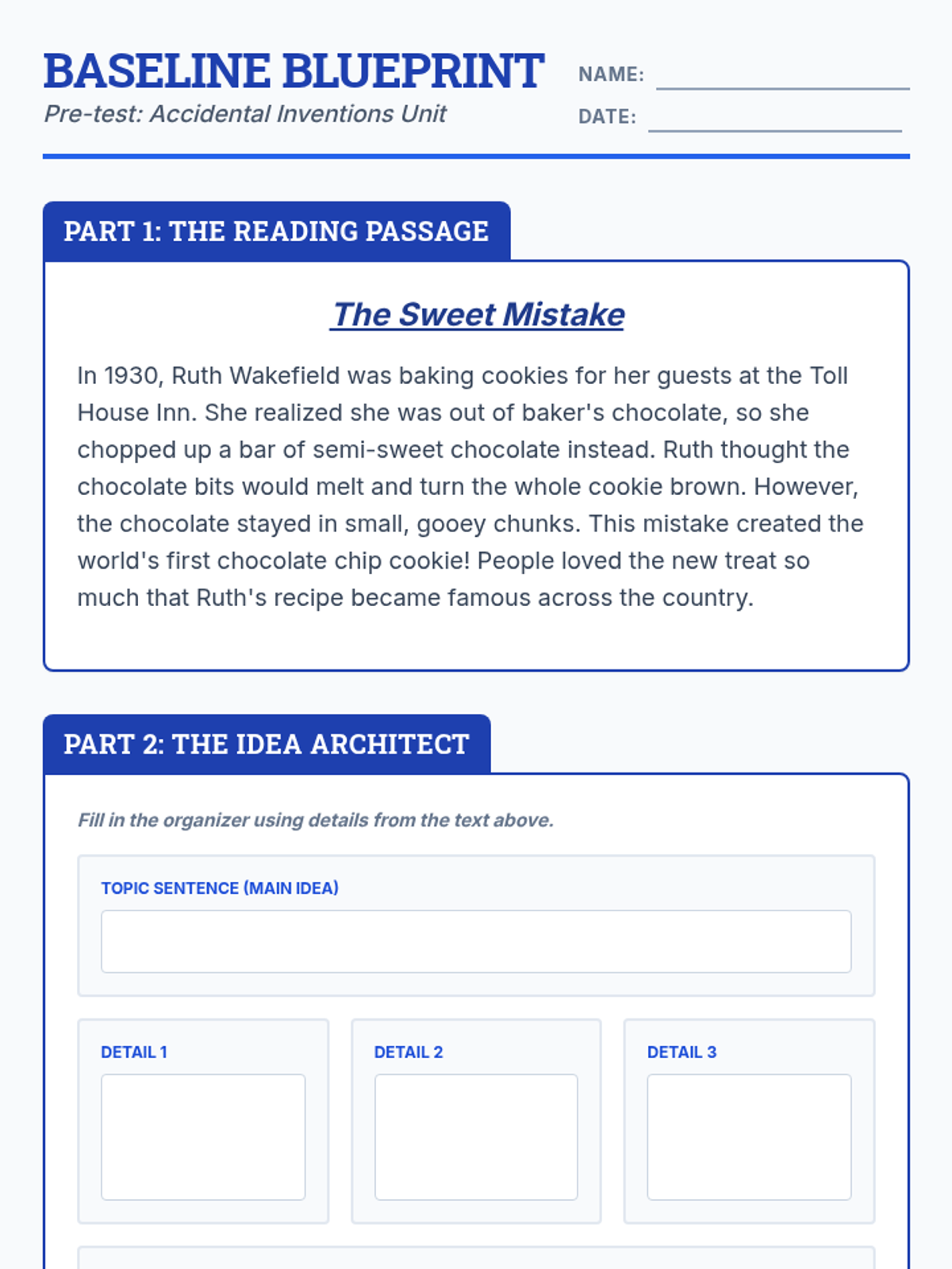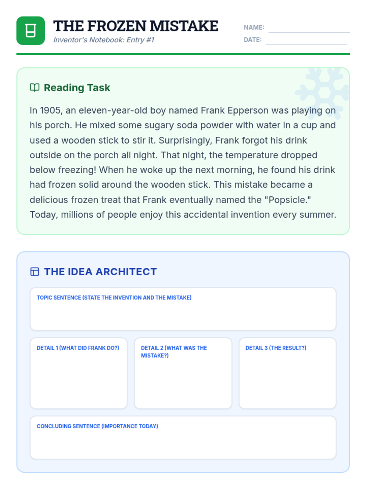 A writing intervention focused on taking notes from informational texts about accidental inventions and transforming them into structured paragraphs with transitions and sentence variety.