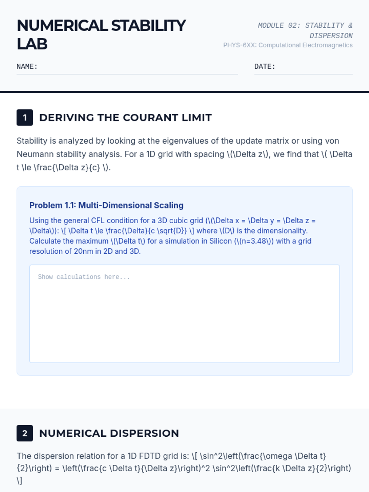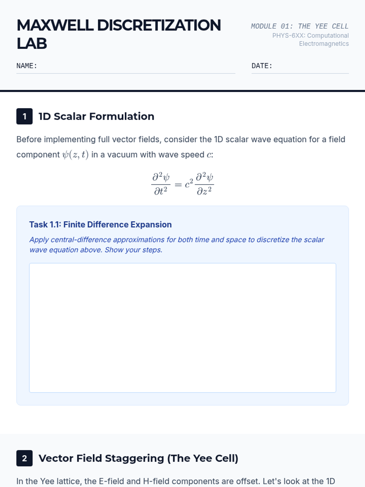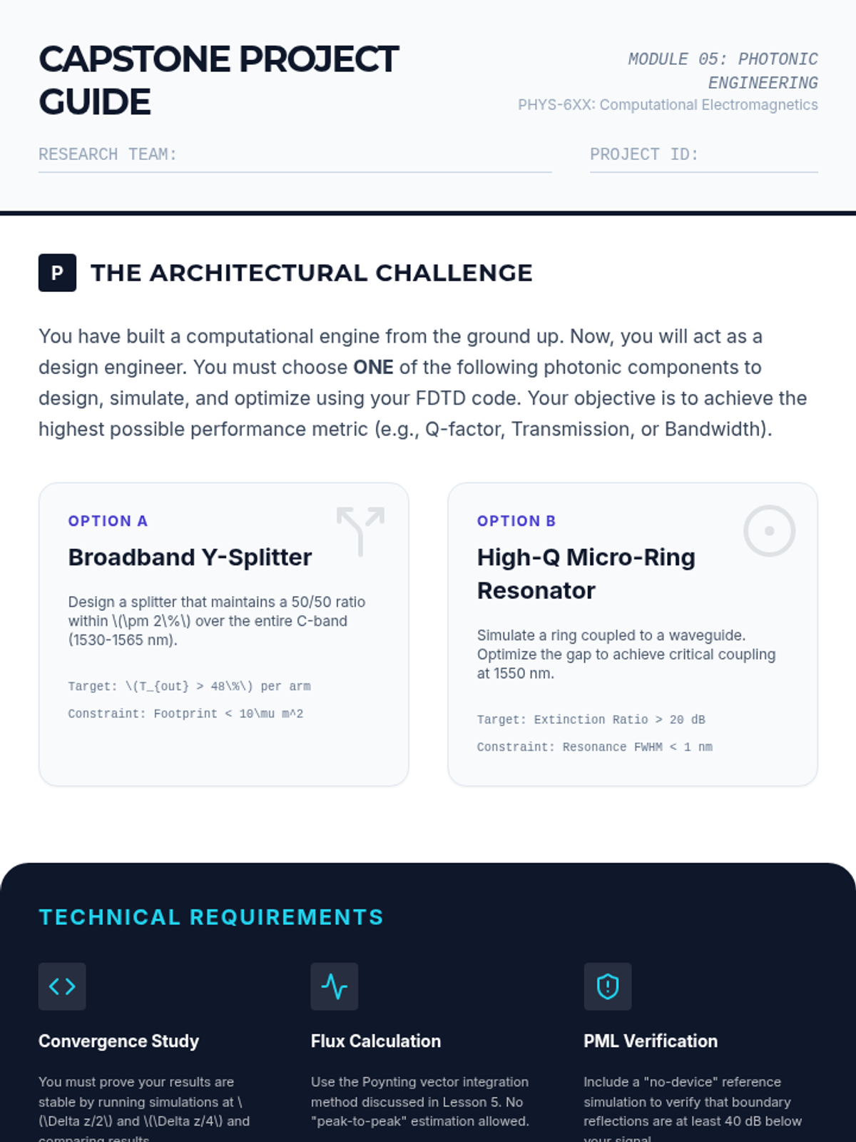 A graduate-level sequence on computational electromagnetics, focusing on the Finite-Difference Time-Domain (FDTD) method. Students will build a simulation engine from scratch to model complex photonic and electromagnetic phenomena.