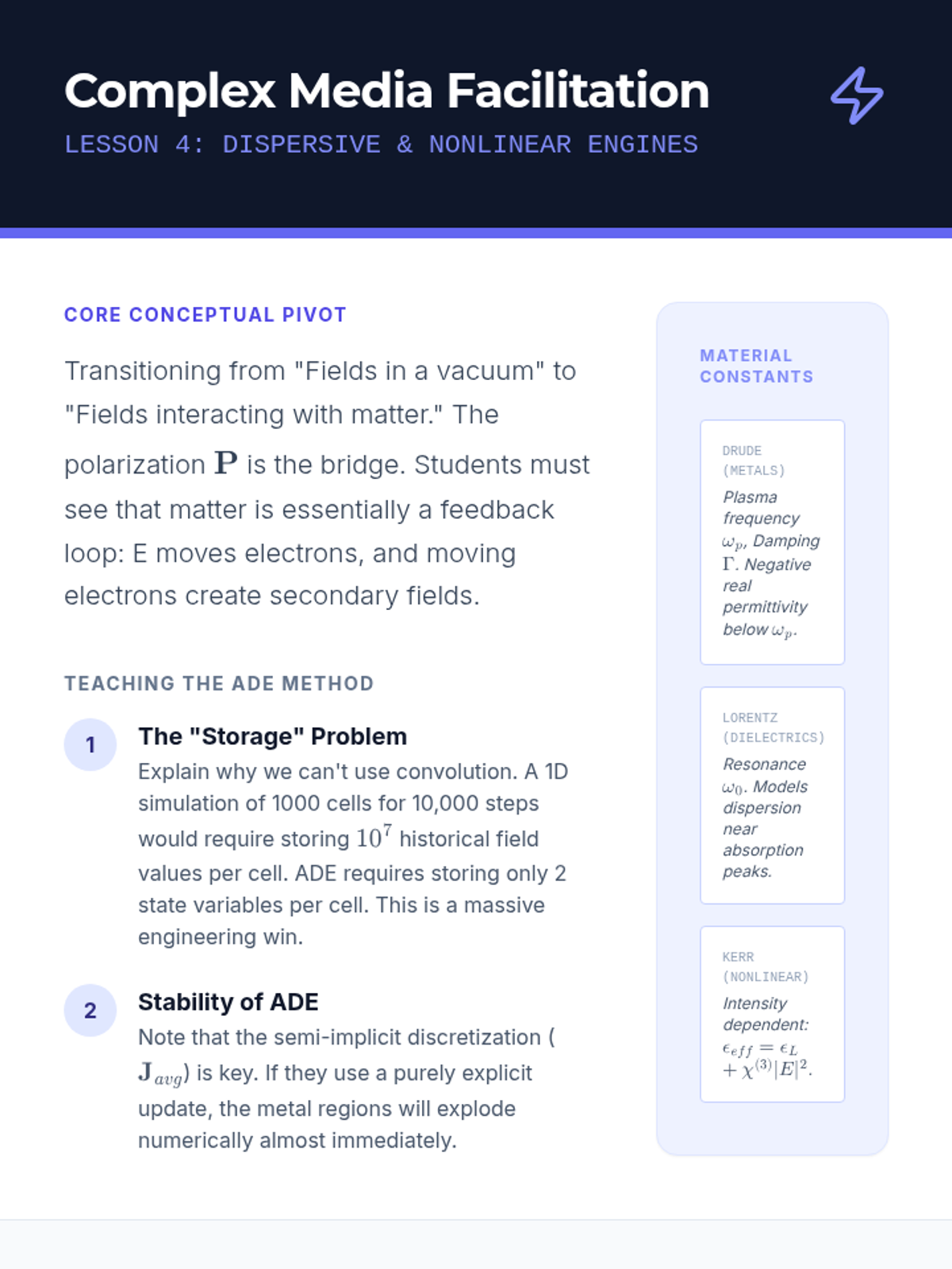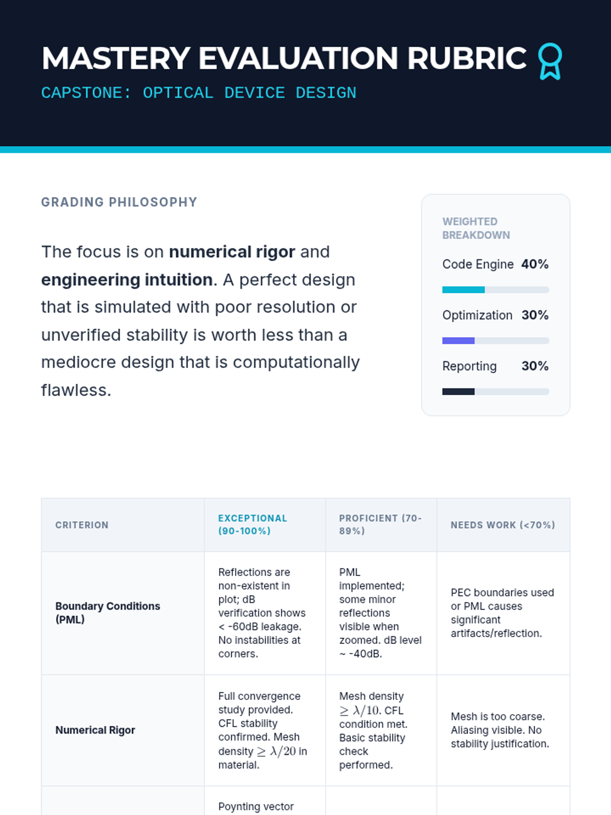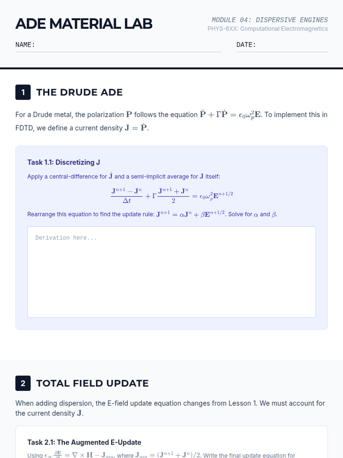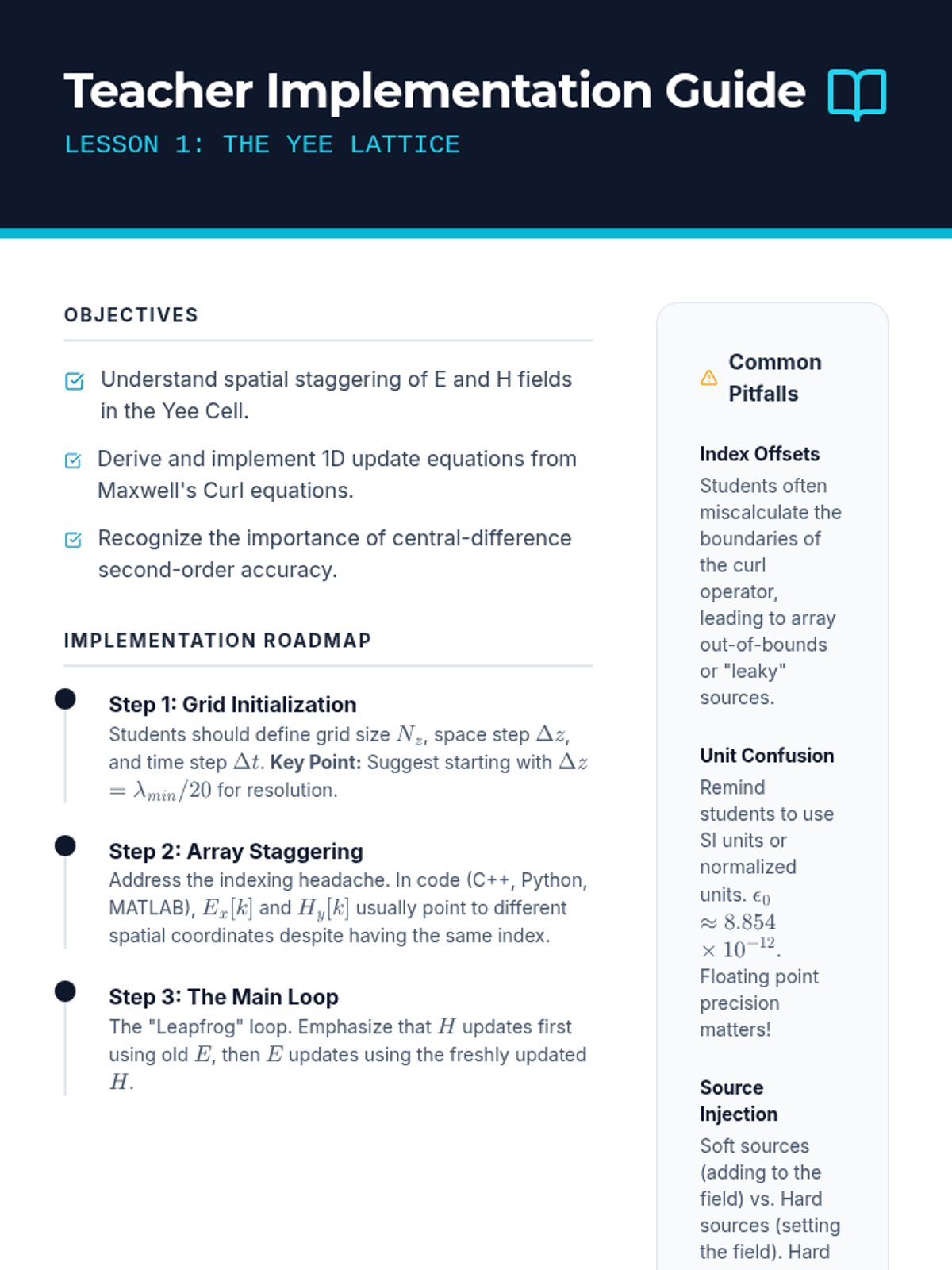 A graduate-level sequence on computational electromagnetics, focusing on the Finite-Difference Time-Domain (FDTD) method. Students will build a simulation engine from scratch to model complex photonic and electromagnetic phenomena.