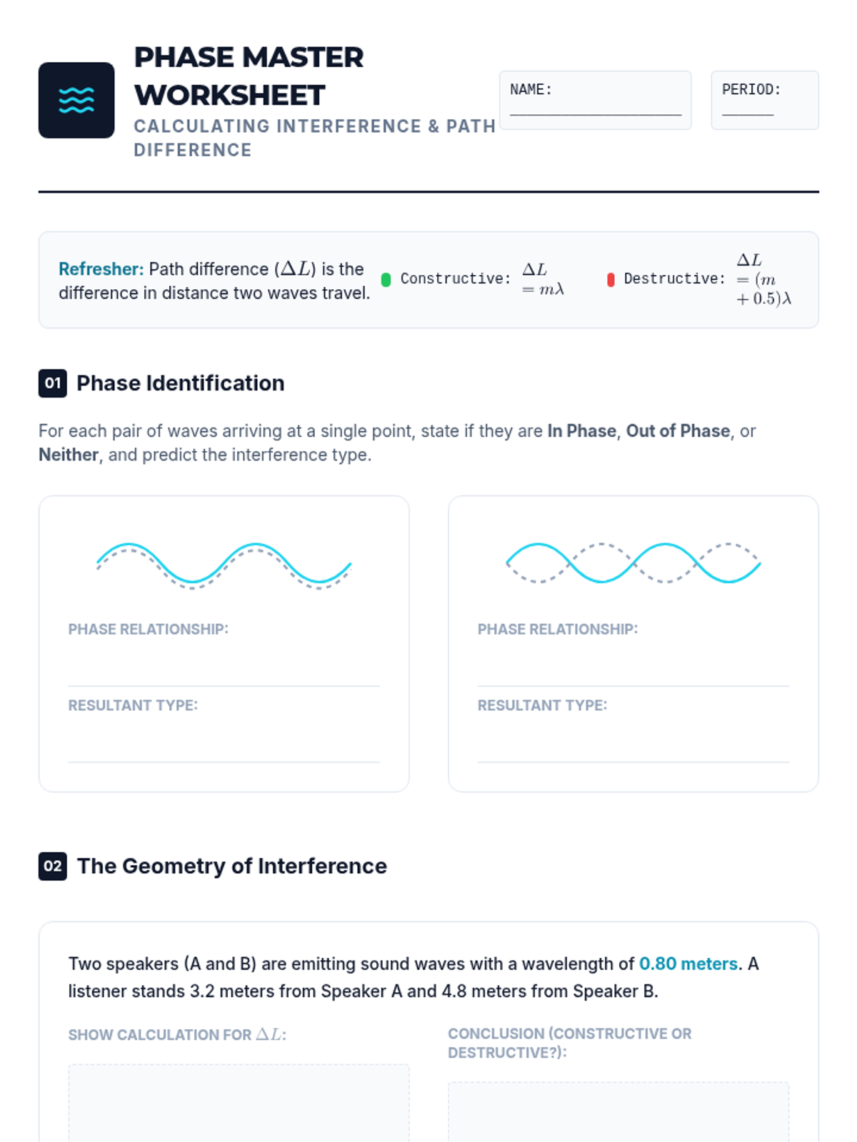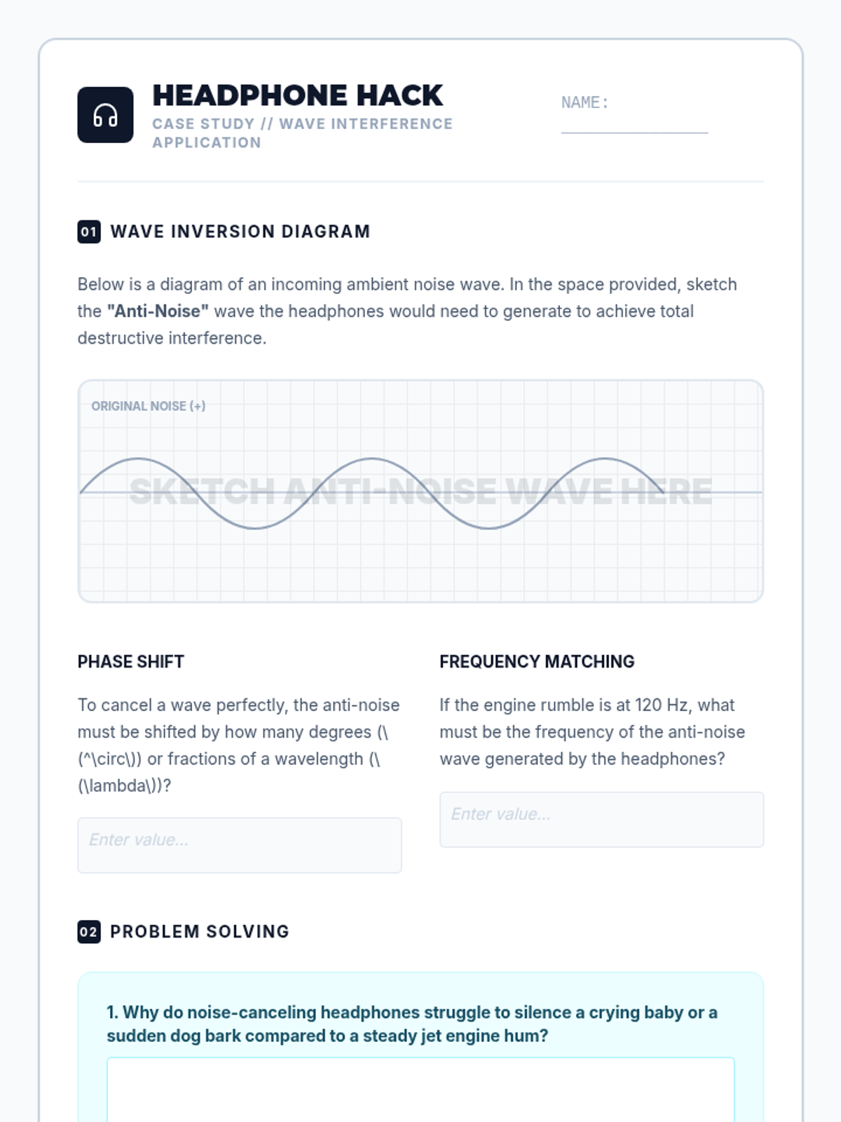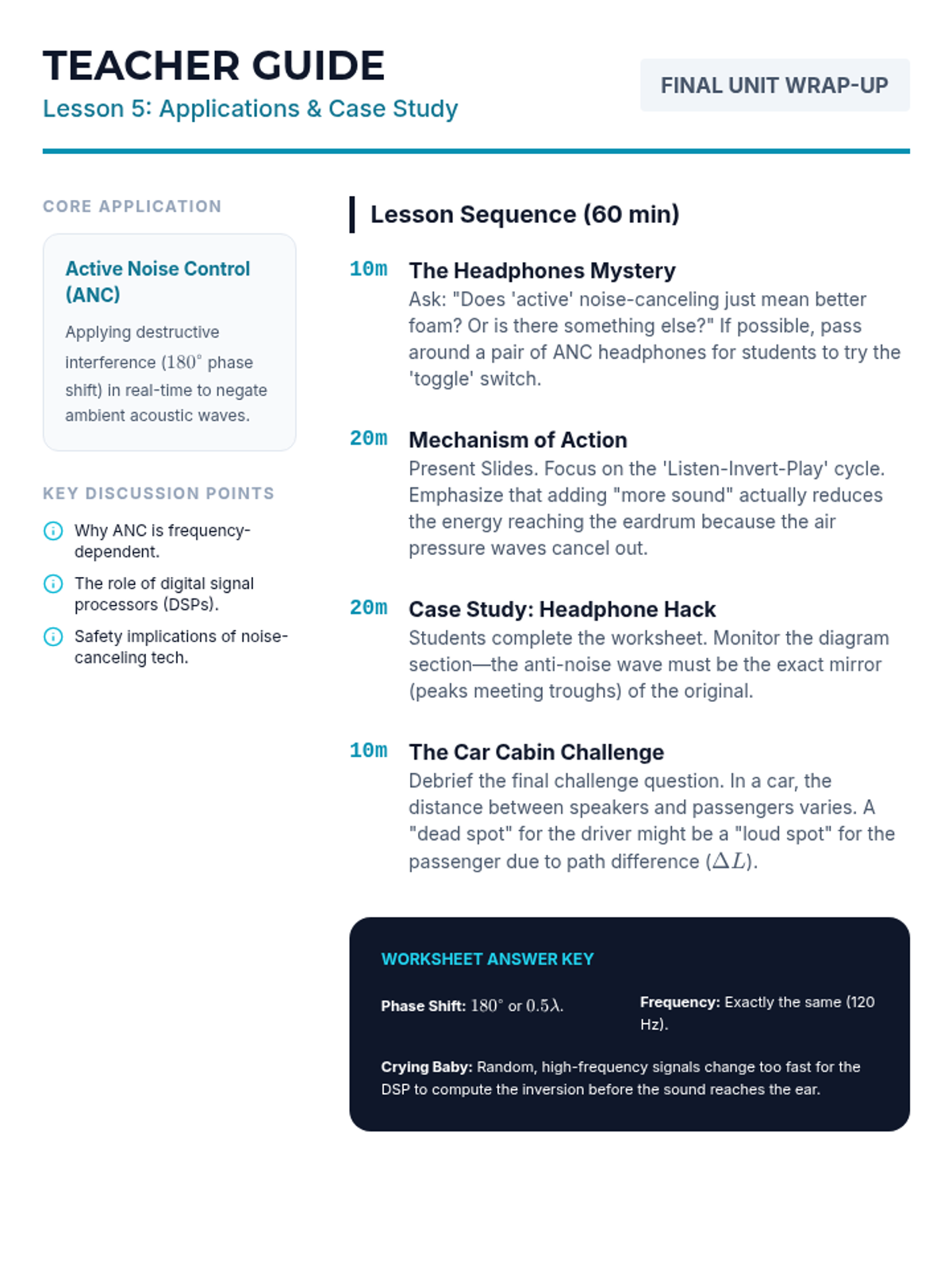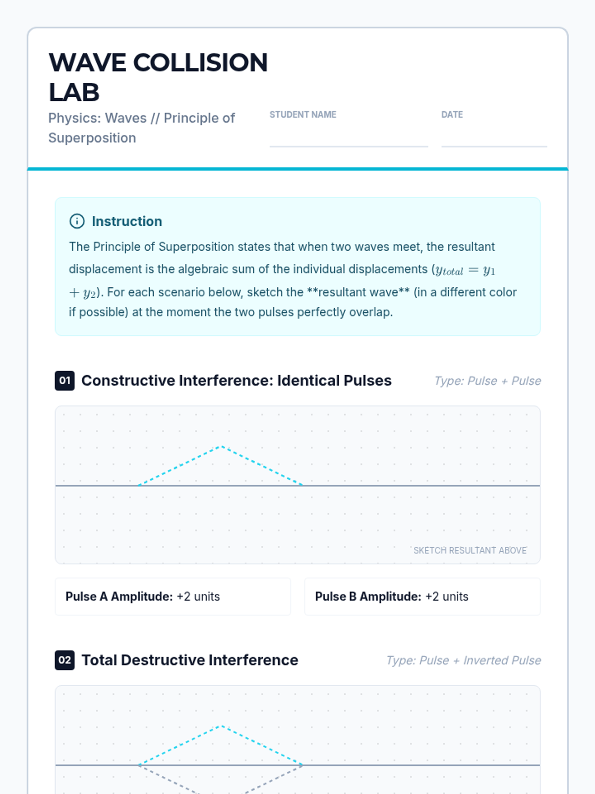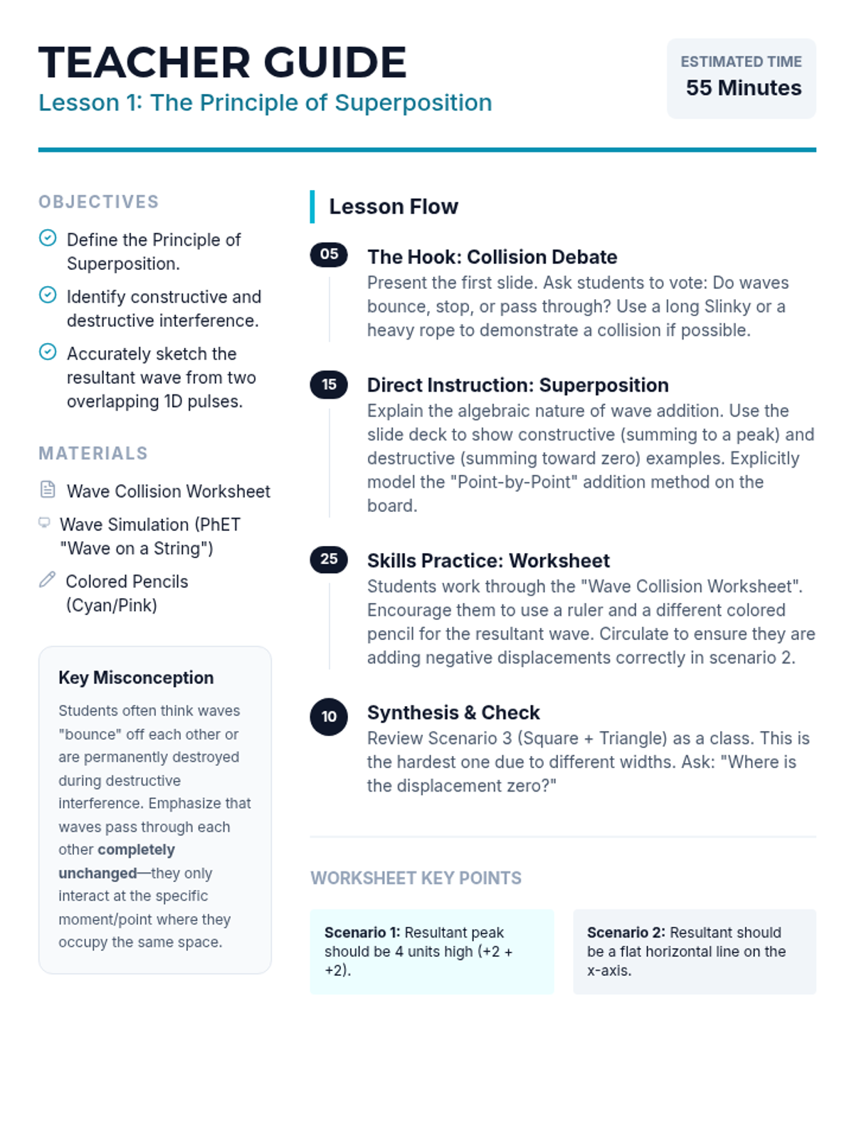 A comprehensive 5-lesson sequence for 11th-grade physics students exploring the wave nature of light and matter through superposition, interference, and diffraction. Students progress from basic 1D pulse addition to complex 2D interference patterns and real-world applications like noise cancellation.