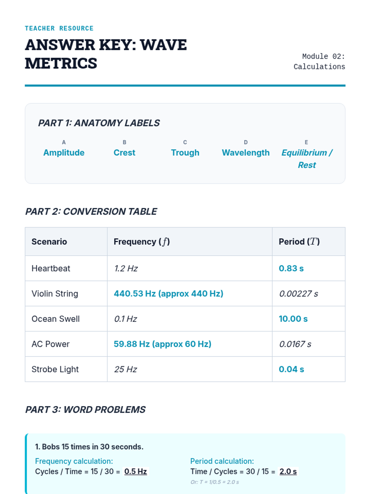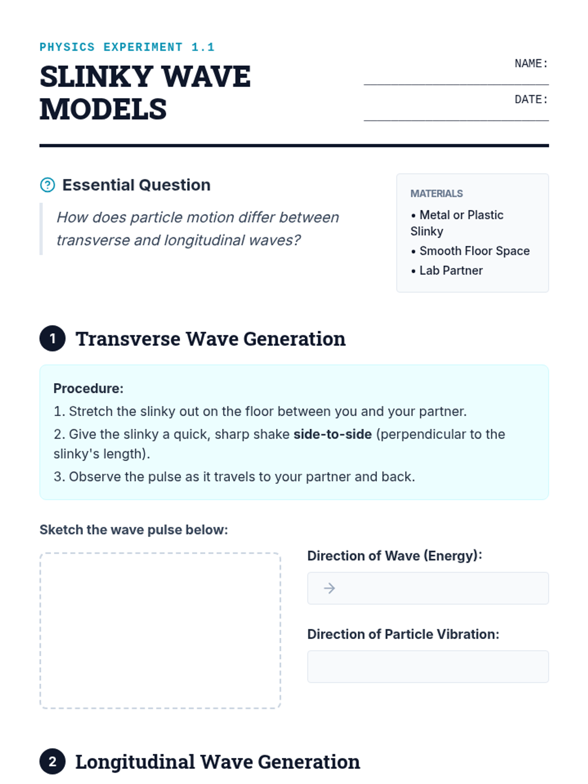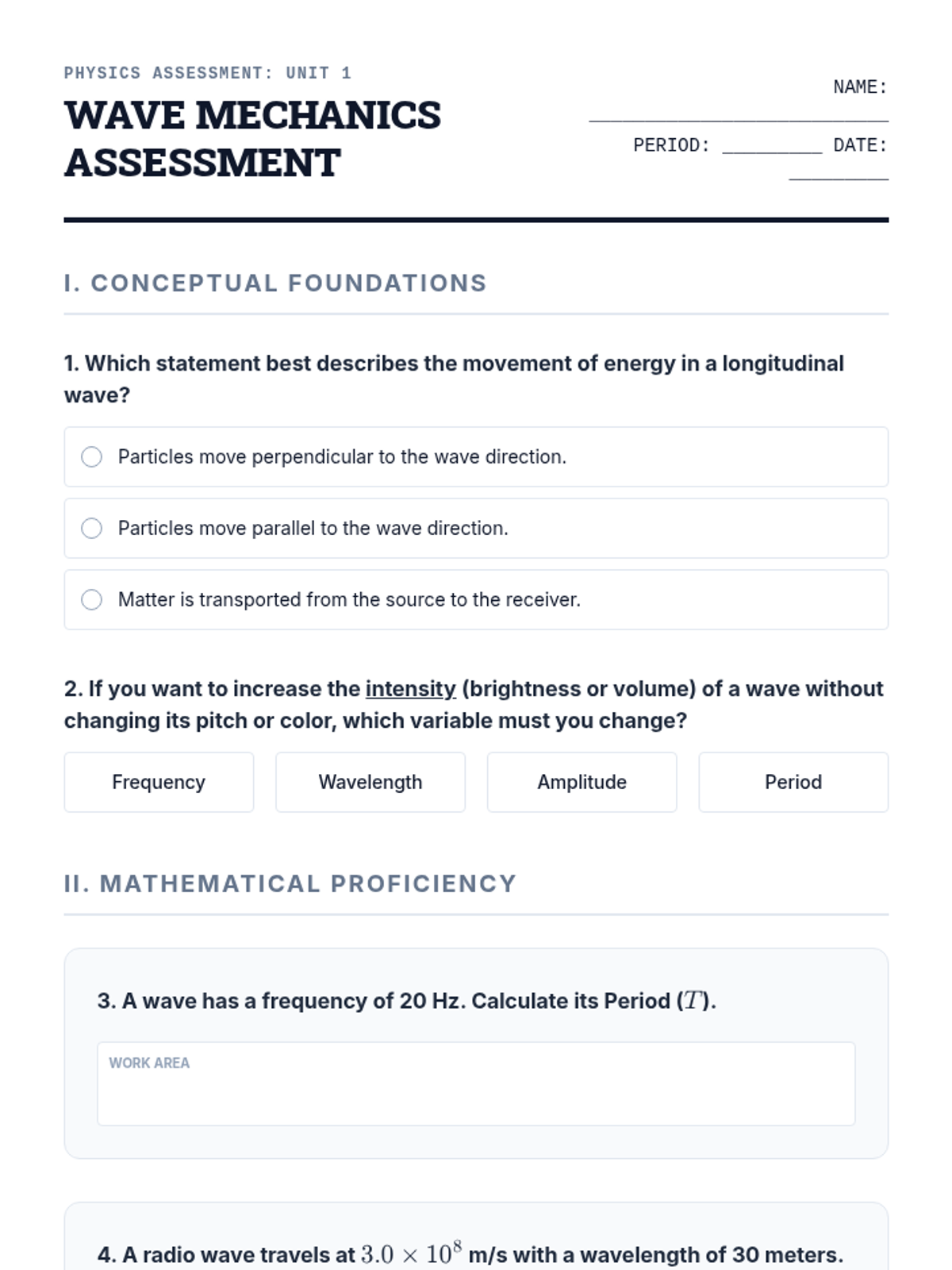 This skill-building sequence establishes the fundamental mathematical and conceptual frameworks for understanding wave mechanics. Students progress from qualitative observation of wave types to quantitative analysis of frequency, wavelength, speed, and energy.
