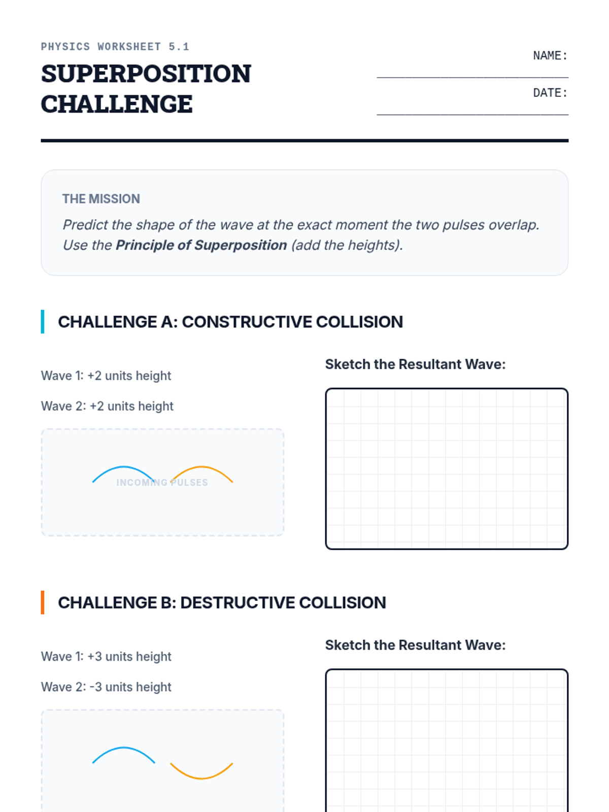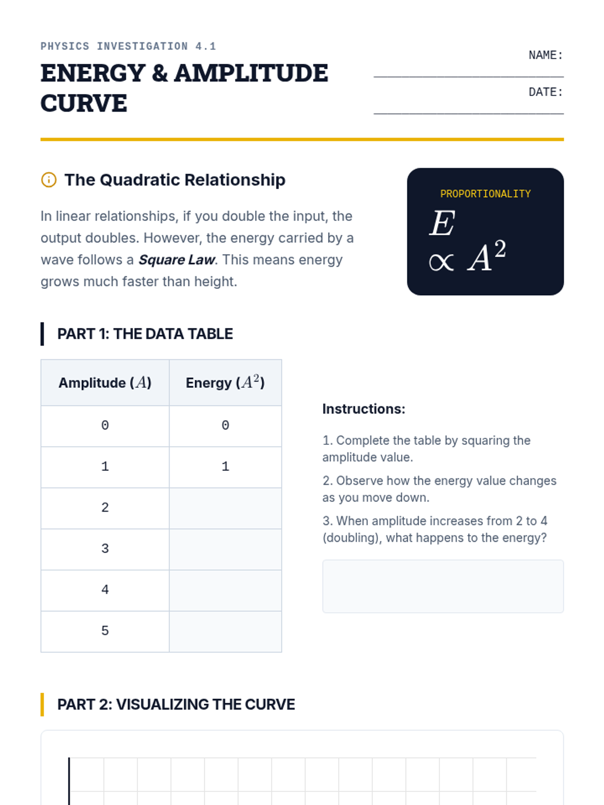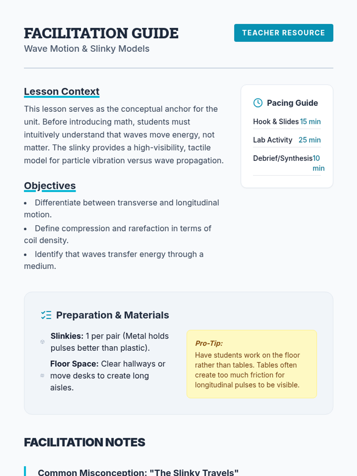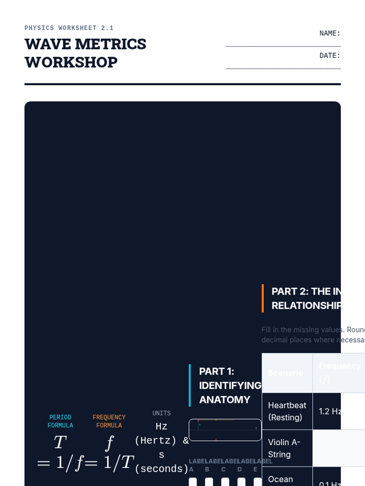 This skill-building sequence establishes the fundamental mathematical and conceptual frameworks for understanding wave mechanics. Students progress from qualitative observation of wave types to quantitative analysis of frequency, wavelength, speed, and energy.