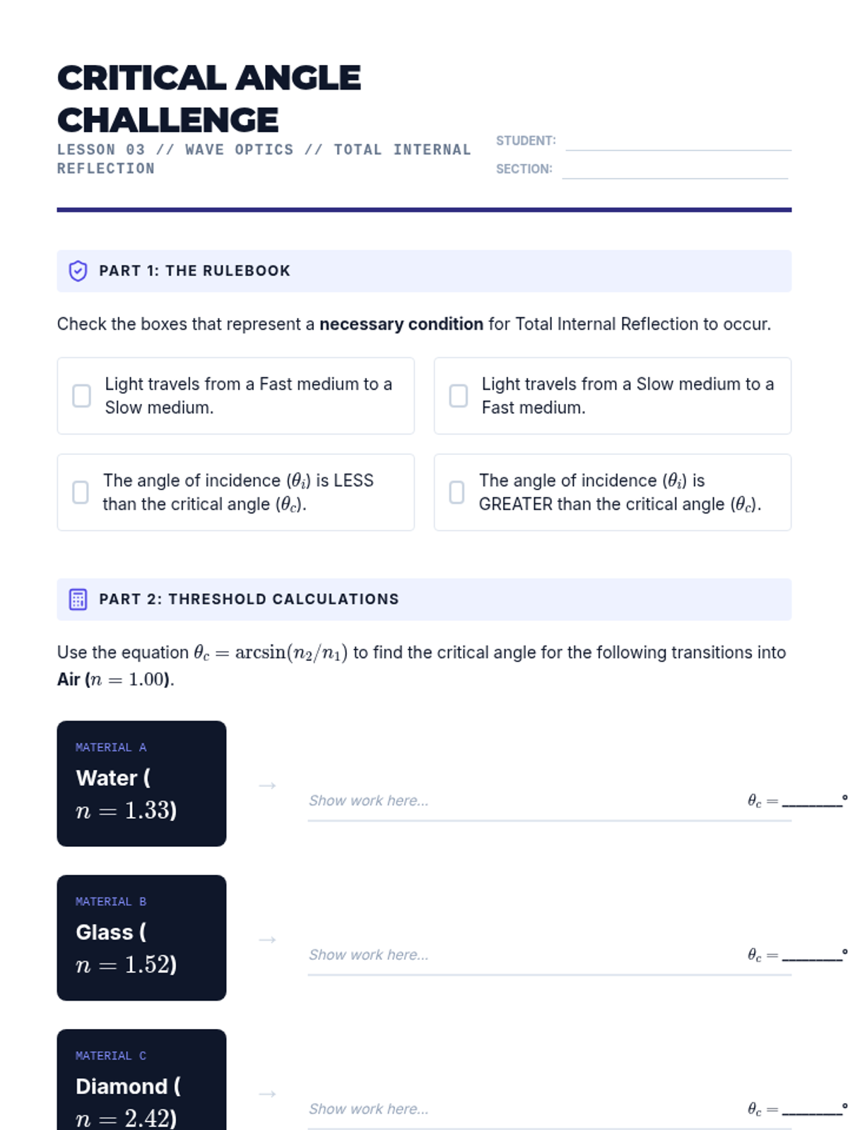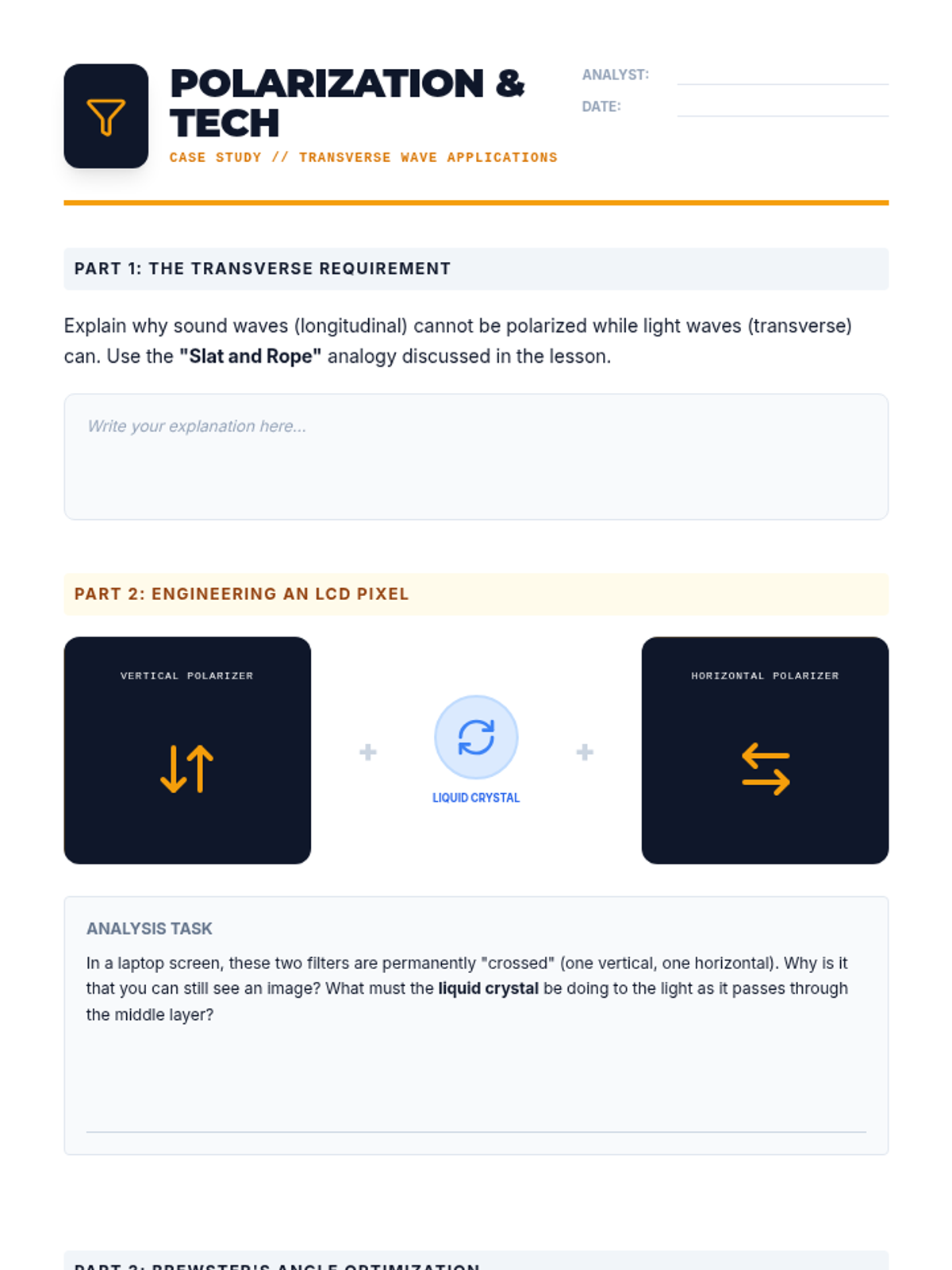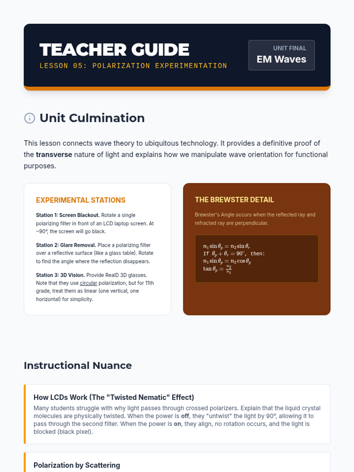 An inquiry-driven physics sequence exploring the wave nature of light through reflection, refraction, diffraction, and polarization, culminating in applications of optical technology.