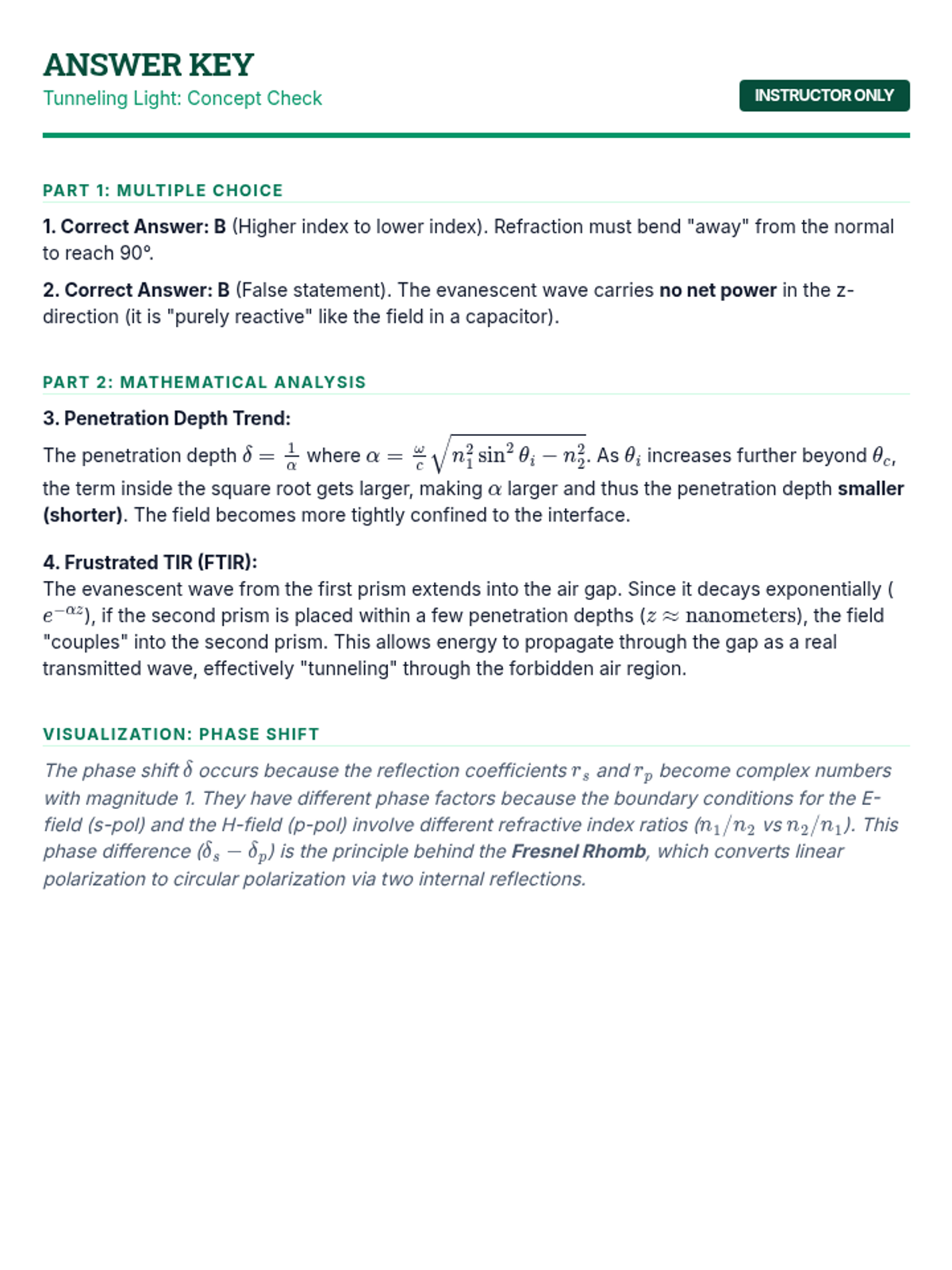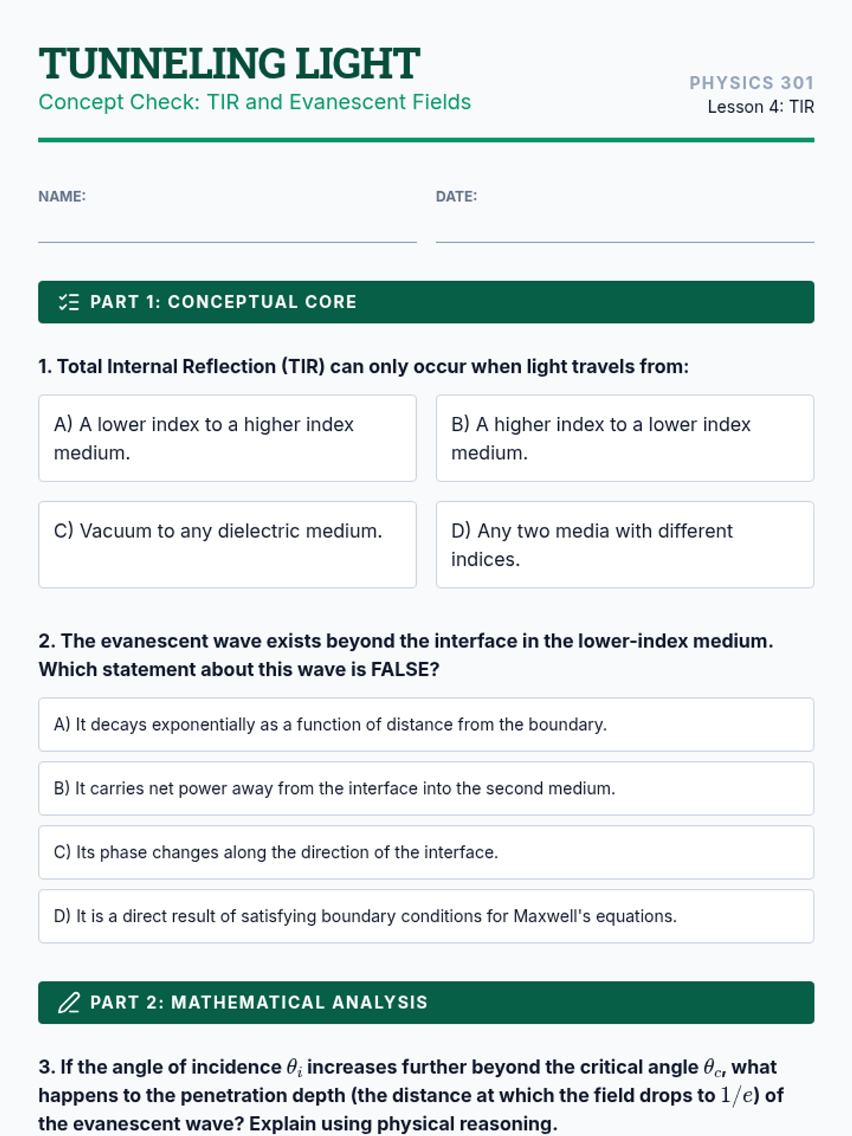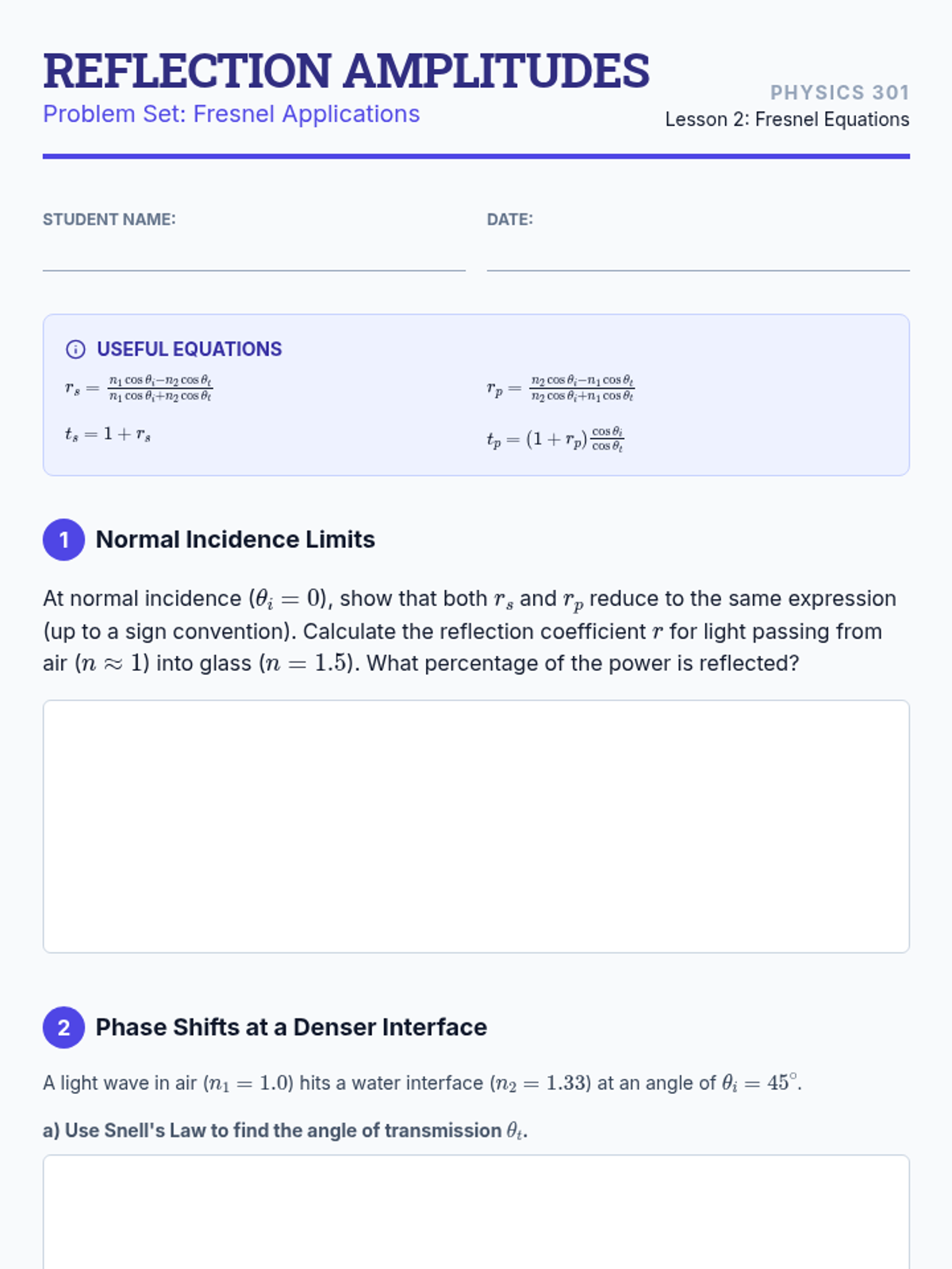This sequence explores the behavior of electromagnetic waves at material interfaces. Students will derive boundary conditions from Maxwell's equations, apply the Fresnel equations to predict reflection and transmission, and investigate phenomena like Brewster's angle, total internal reflection, and fiber optic waveguides.