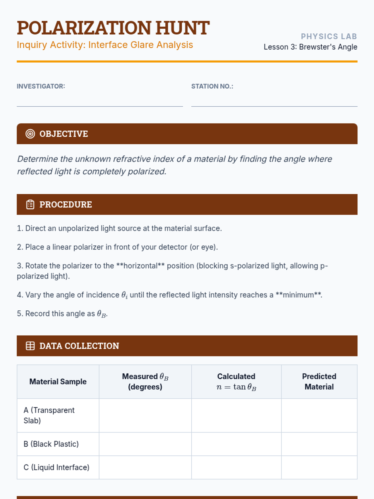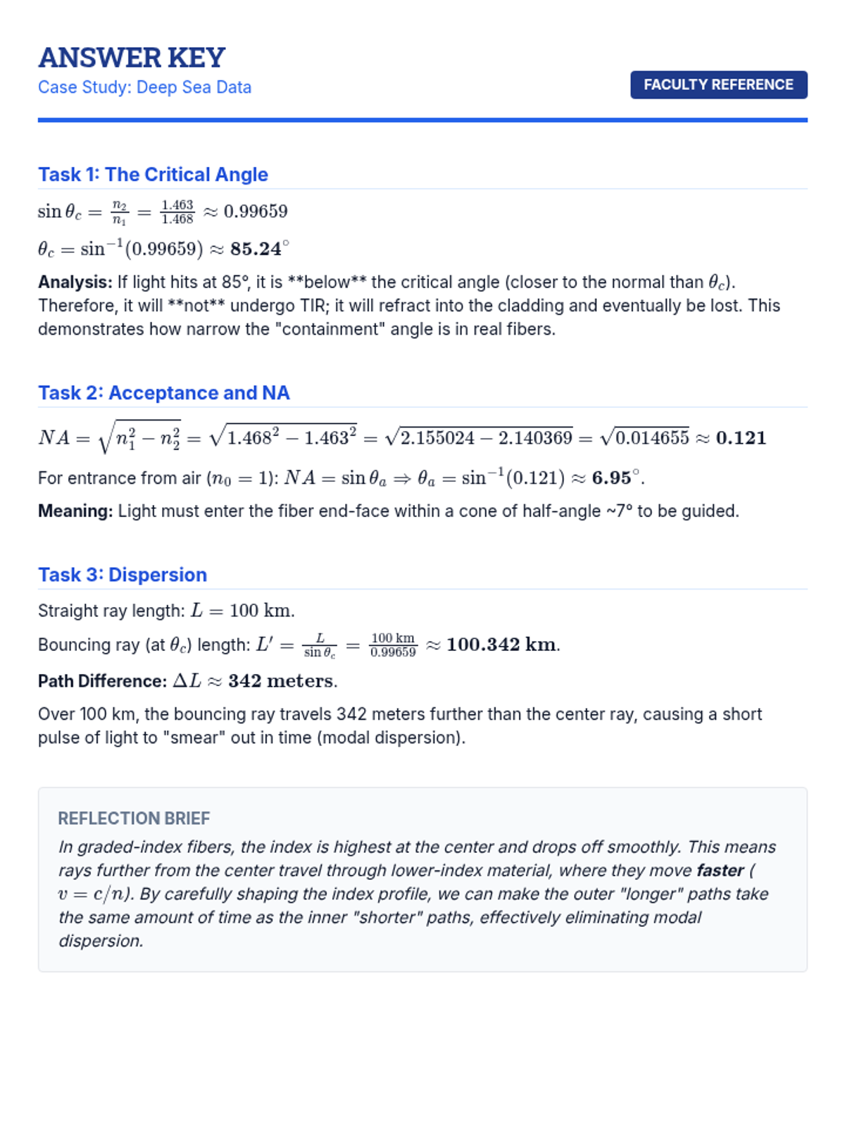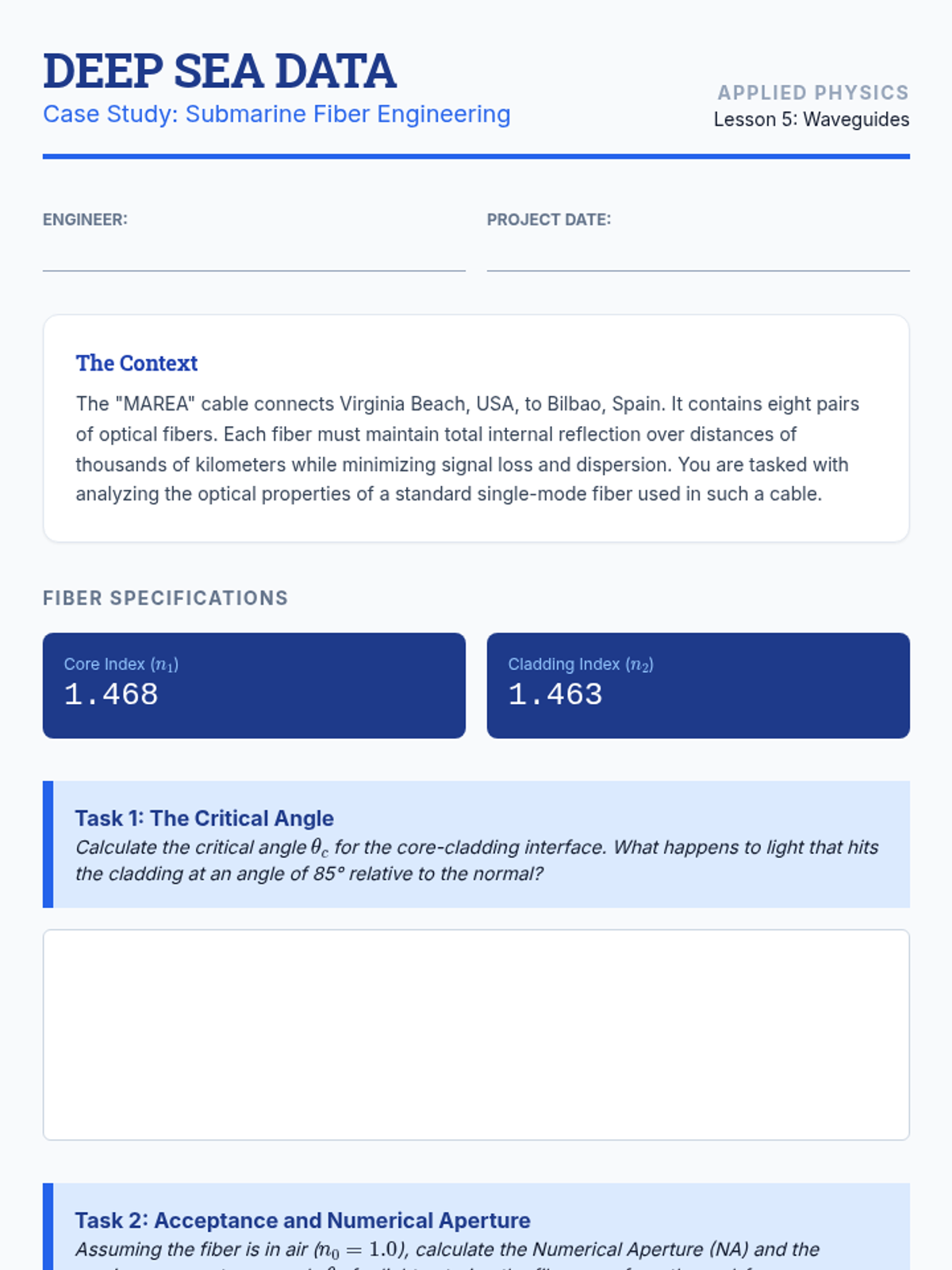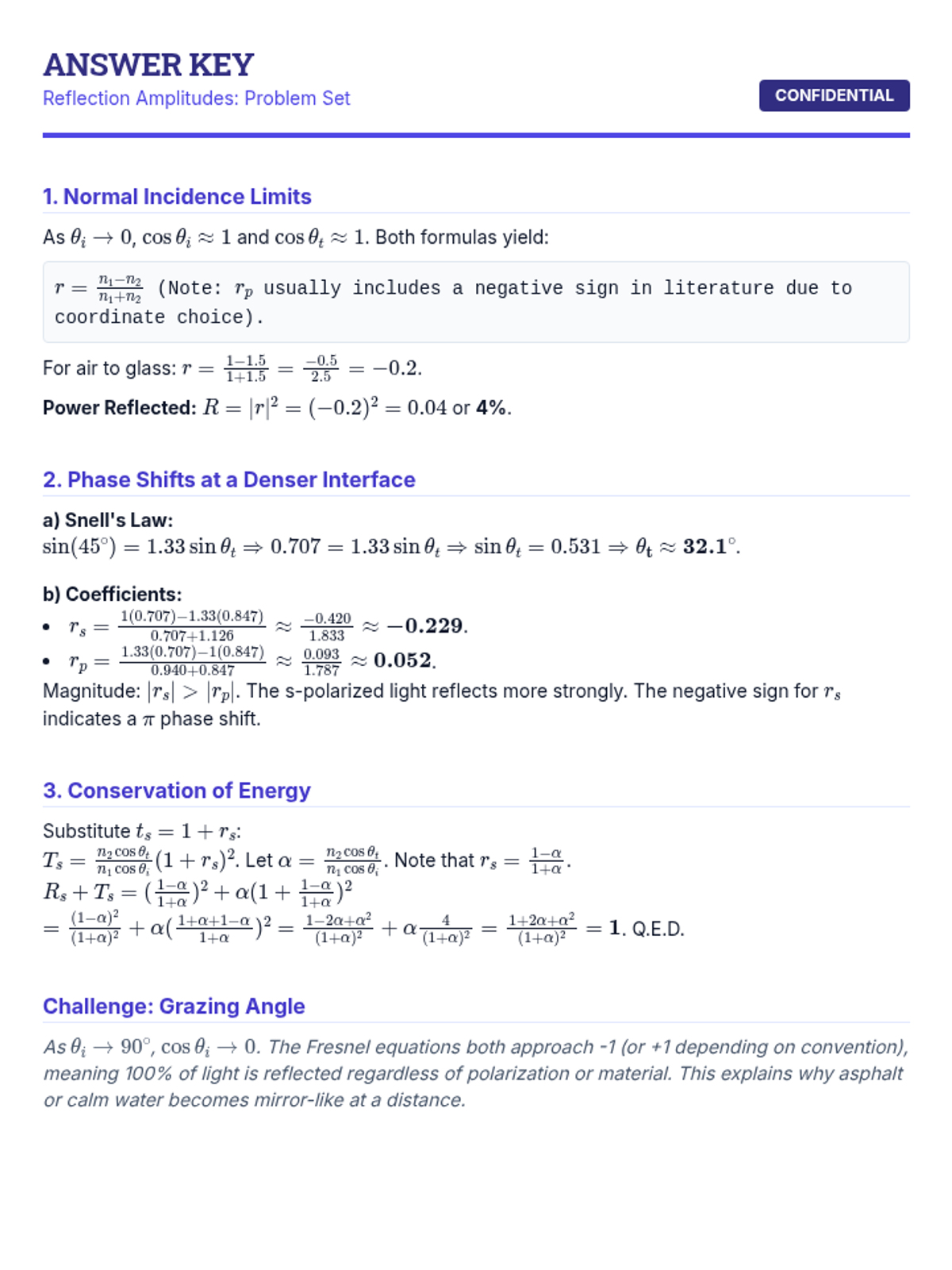 This sequence explores the behavior of electromagnetic waves at material interfaces. Students will derive boundary conditions from Maxwell's equations, apply the Fresnel equations to predict reflection and transmission, and investigate phenomena like Brewster's angle, total internal reflection, and fiber optic waveguides.