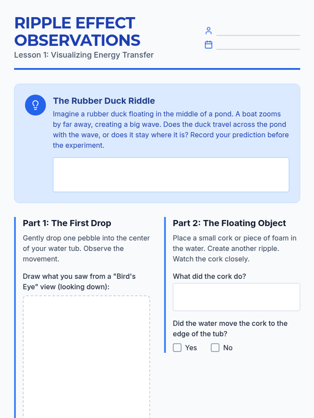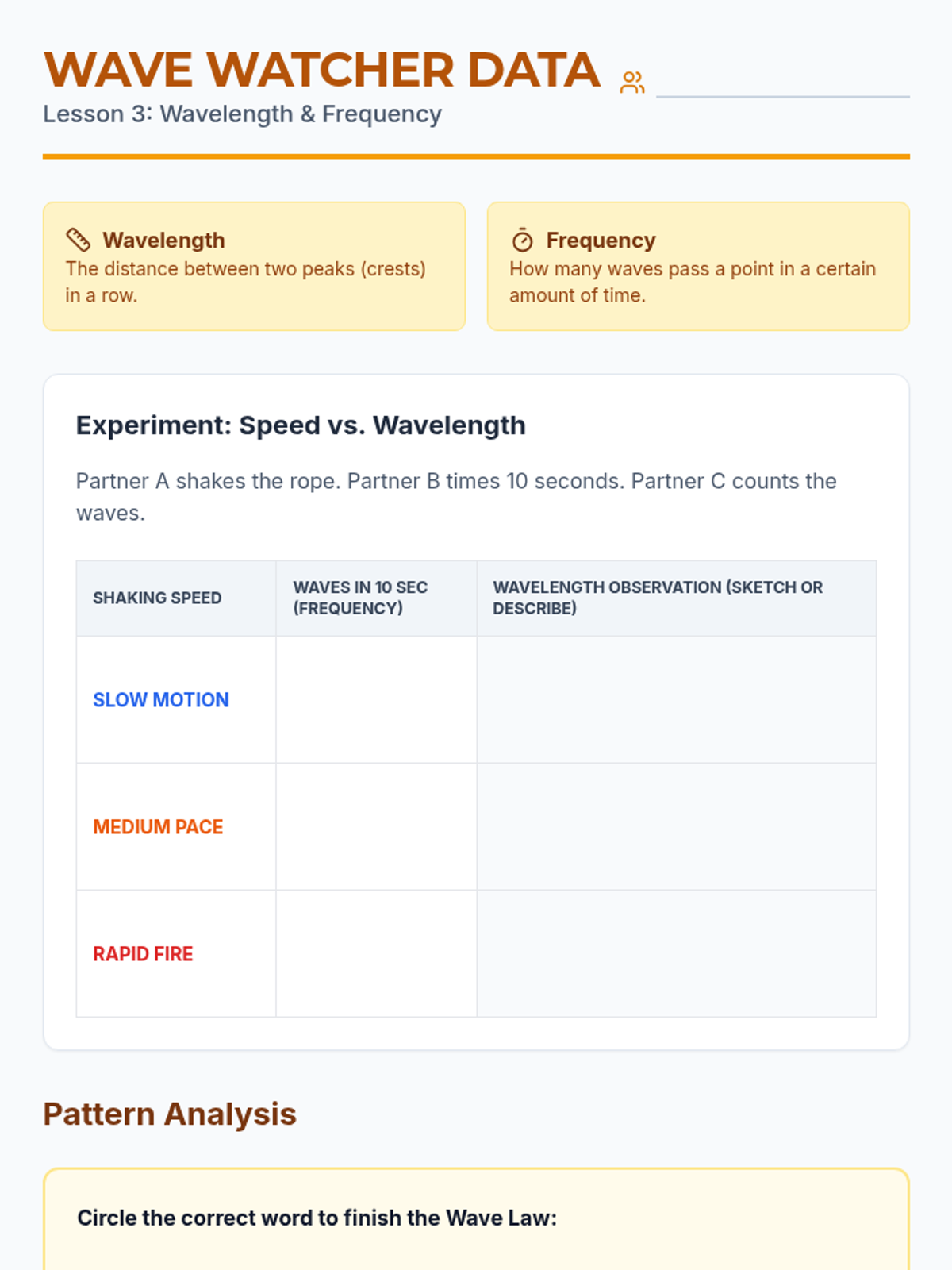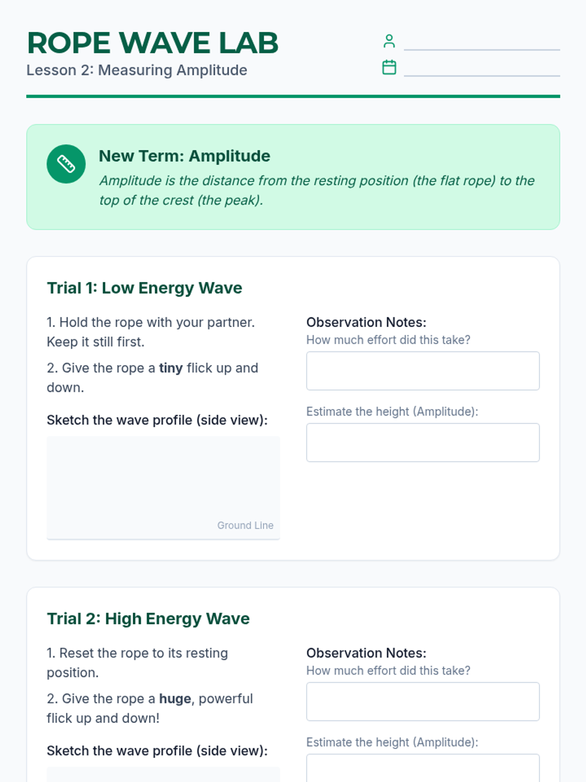 This 4th-grade physics sequence explores the fundamental properties of mechanical waves through hands-on inquiry, physical modeling, and diagramming. Students move from observing ripples in water to measuring amplitude and wavelength with ropes, eventually mastering the graphing and physical modeling of wave energy.