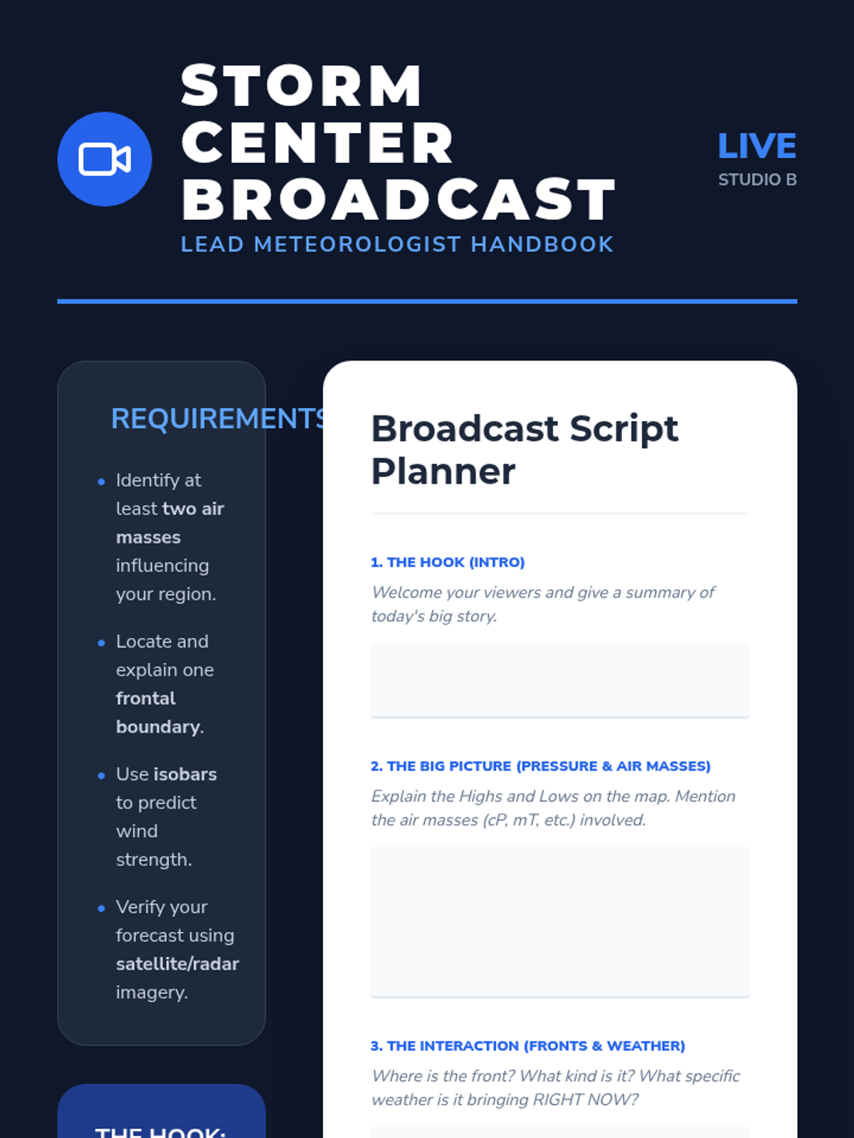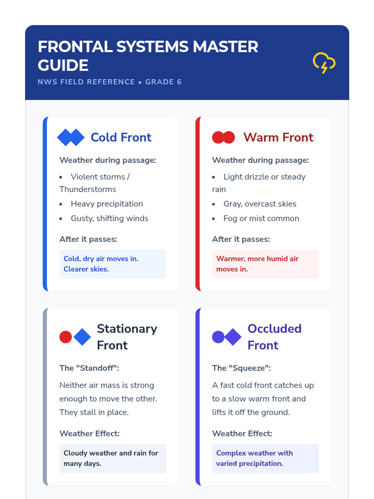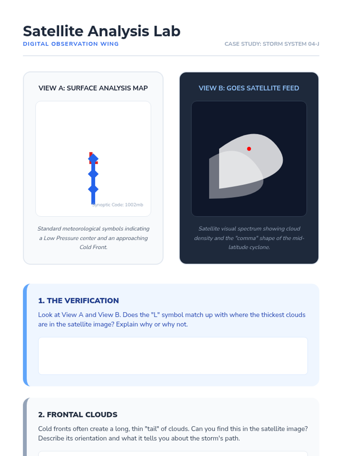 Students become meteorologists by learning to read and interpret synoptic weather charts. They master air masses, frontal boundaries, pressure systems, and satellite imagery to predict future weather patterns, culminating in a broadcast weather forecast project.