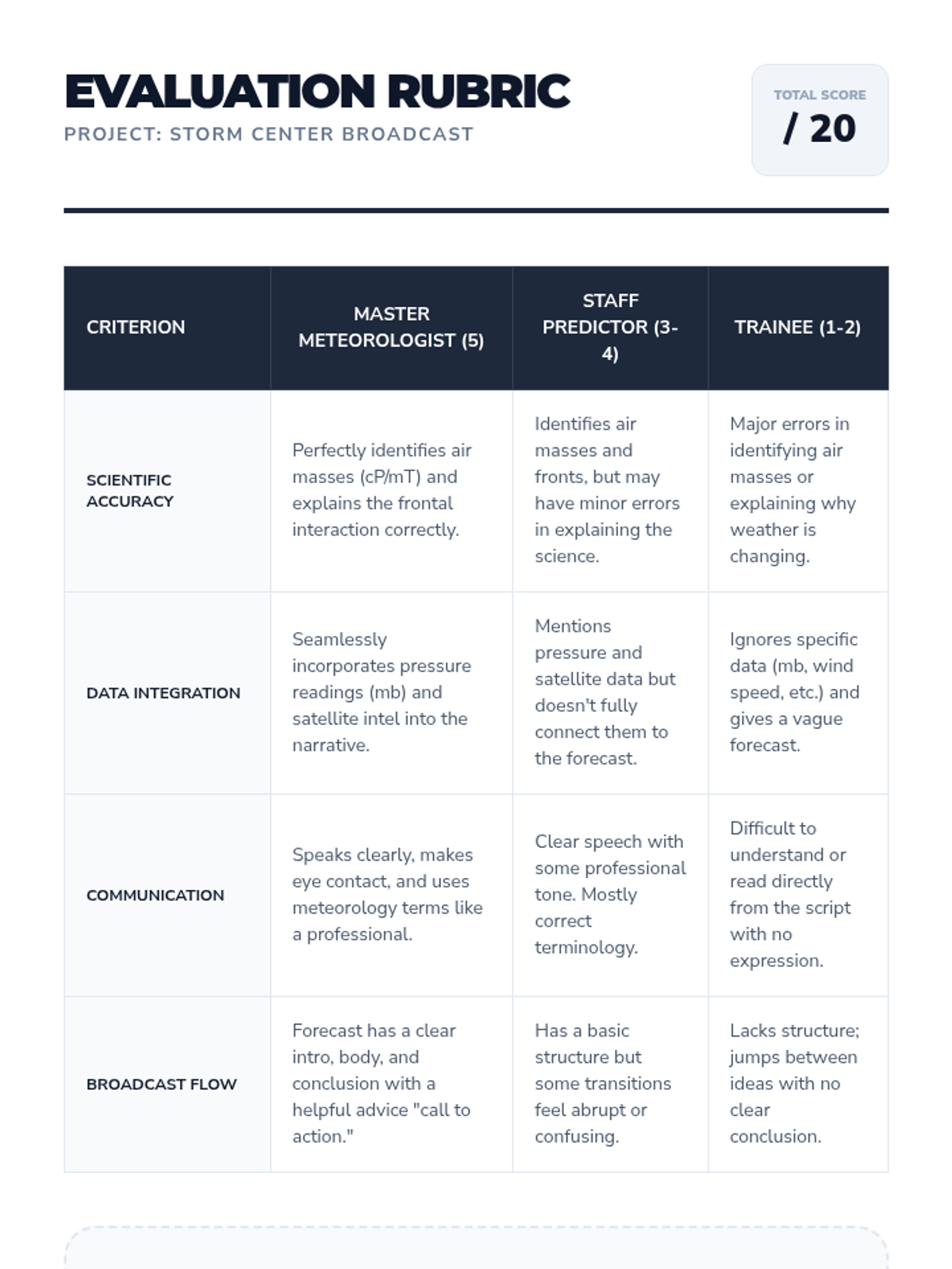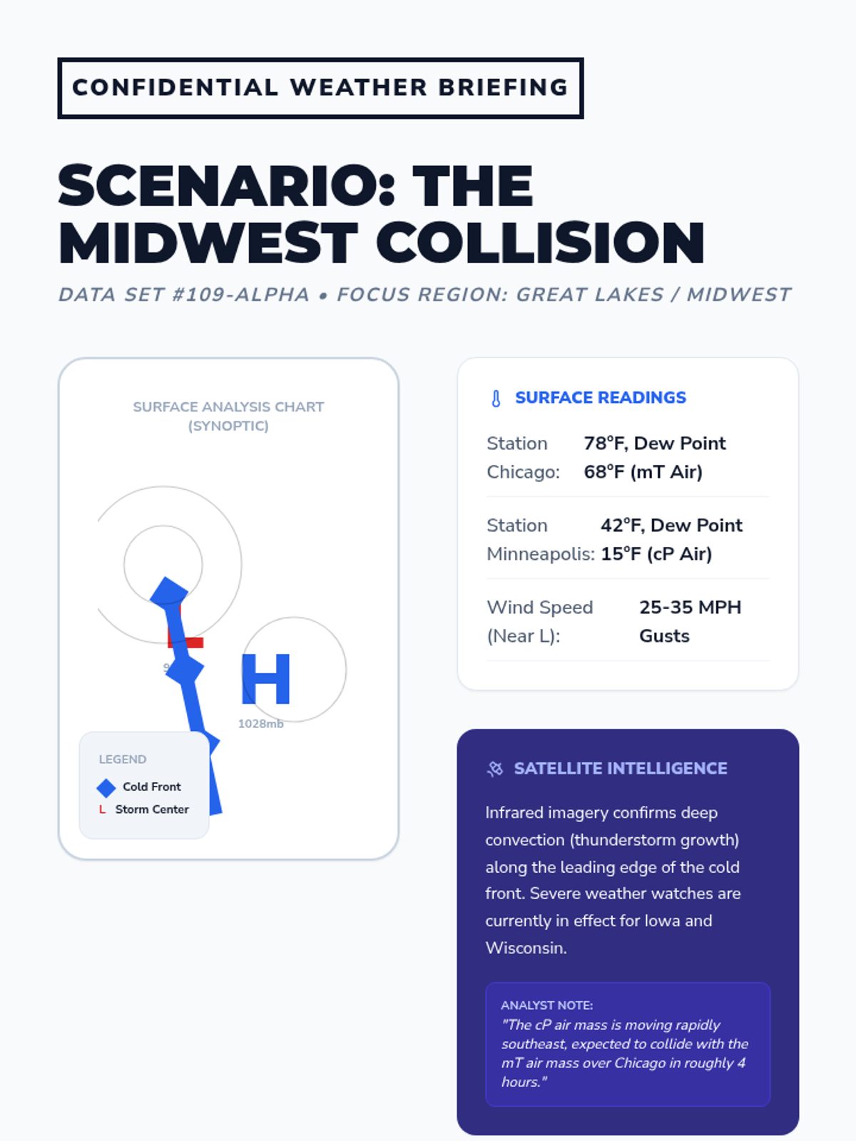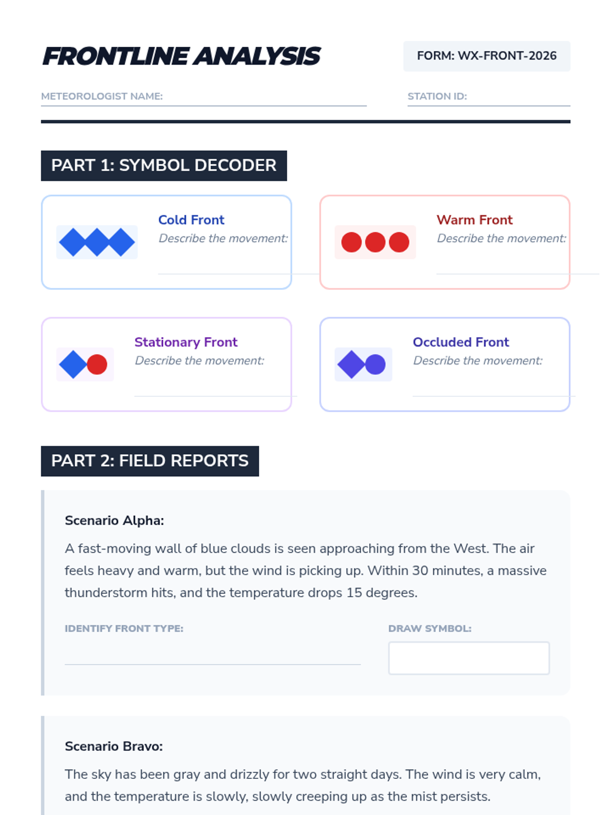 Students become meteorologists by learning to read and interpret synoptic weather charts. They master air masses, frontal boundaries, pressure systems, and satellite imagery to predict future weather patterns, culminating in a broadcast weather forecast project.