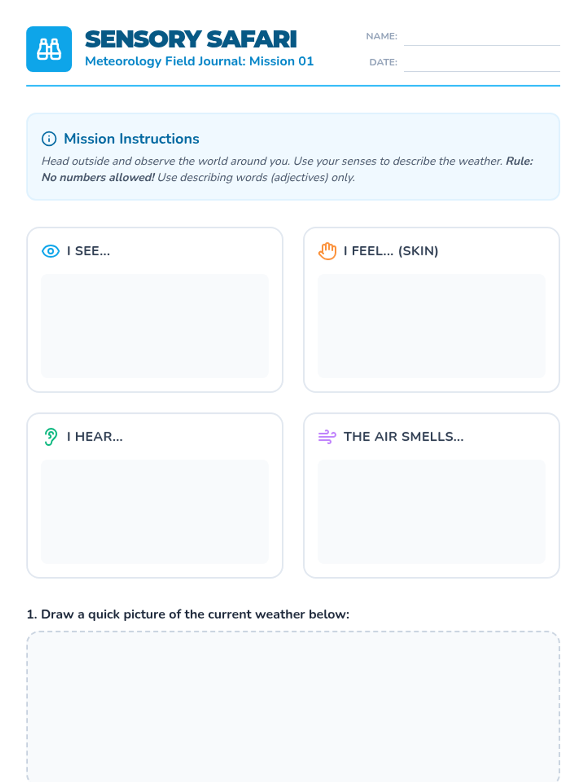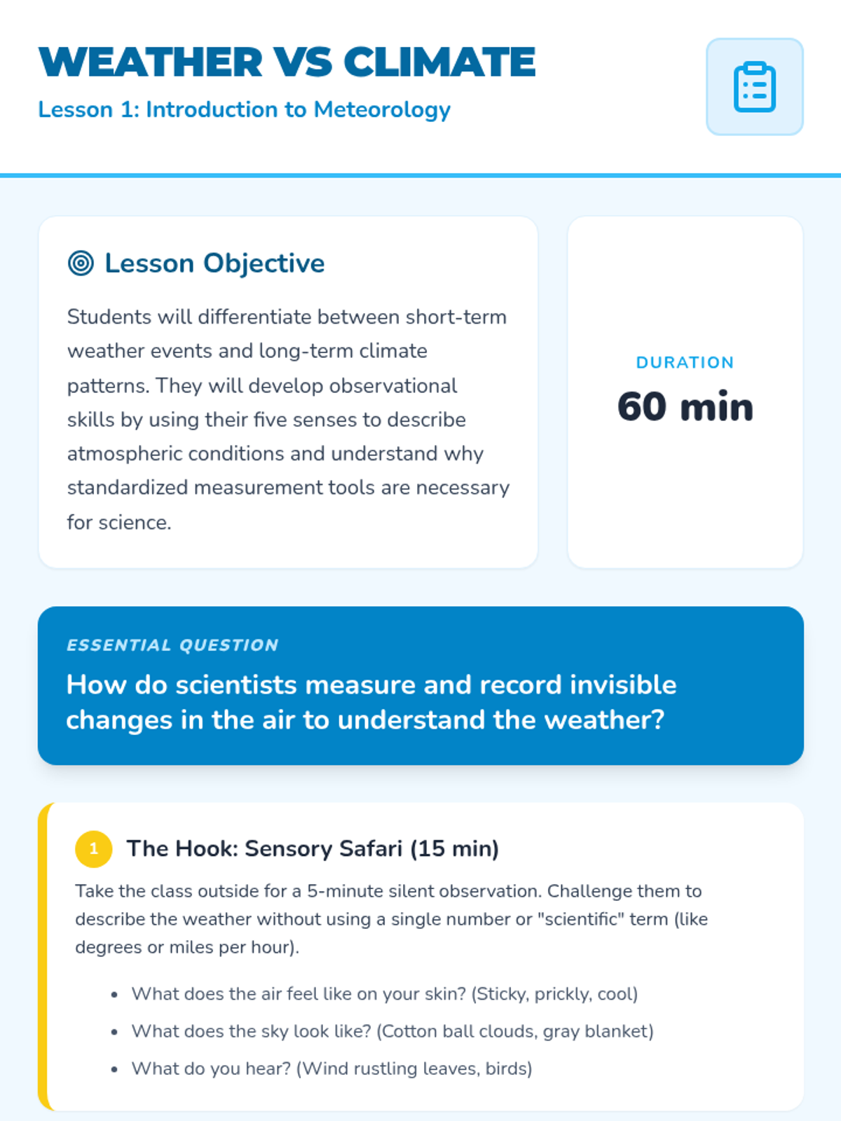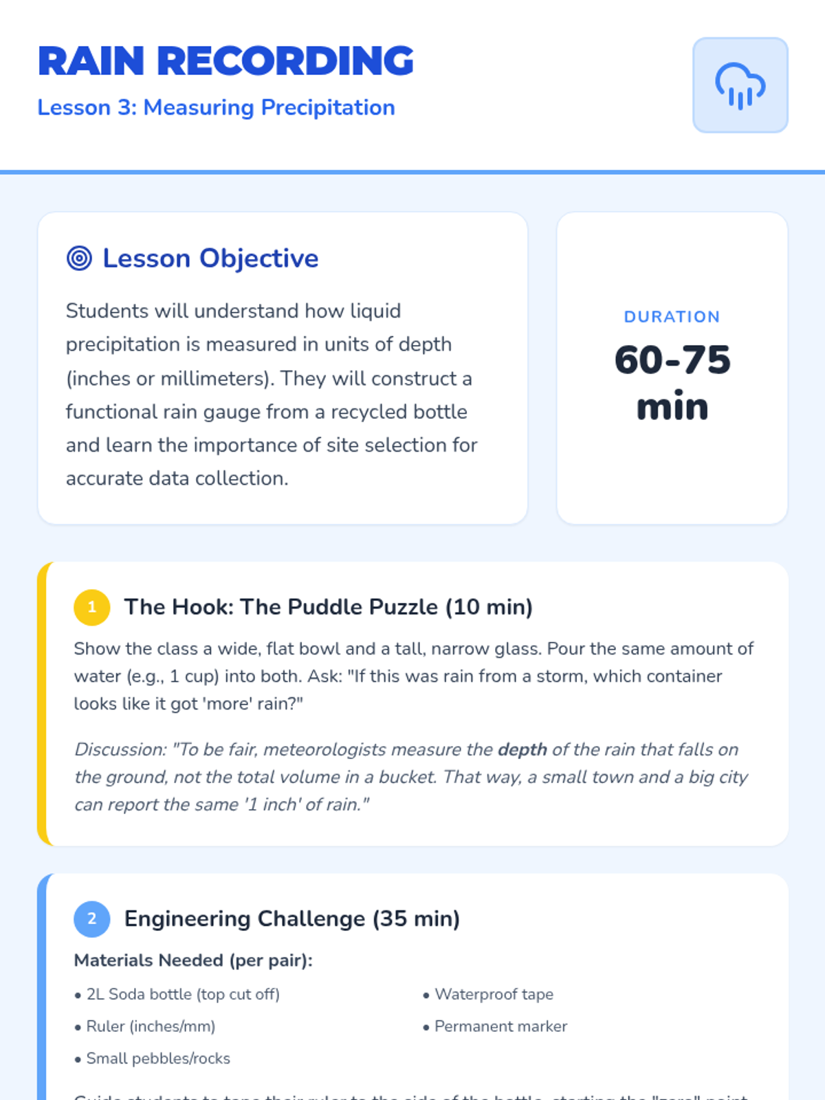 This sequence introduces students to the fundamental practice of meteorological observation, moving them from subjective feelings about weather to objective measurement. Students will explore the scientific method by learning to use specific tools to quantify atmospheric conditions including temperature, precipitation, and wind.