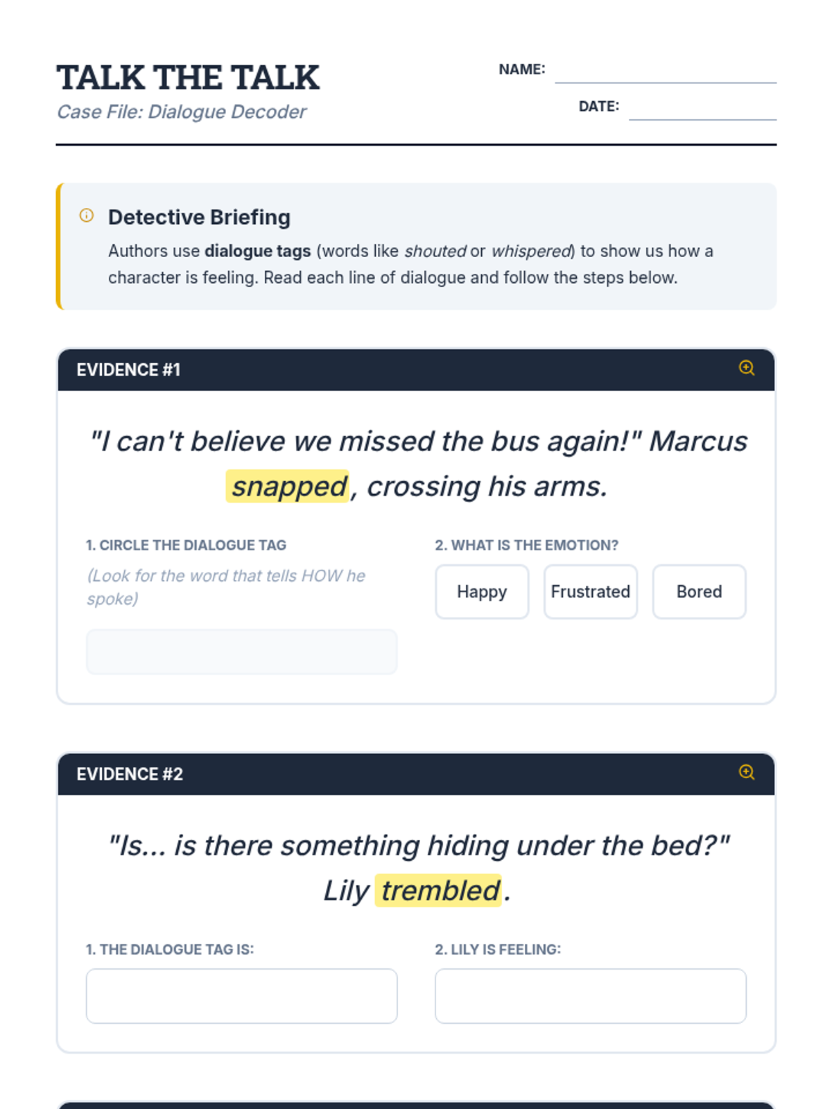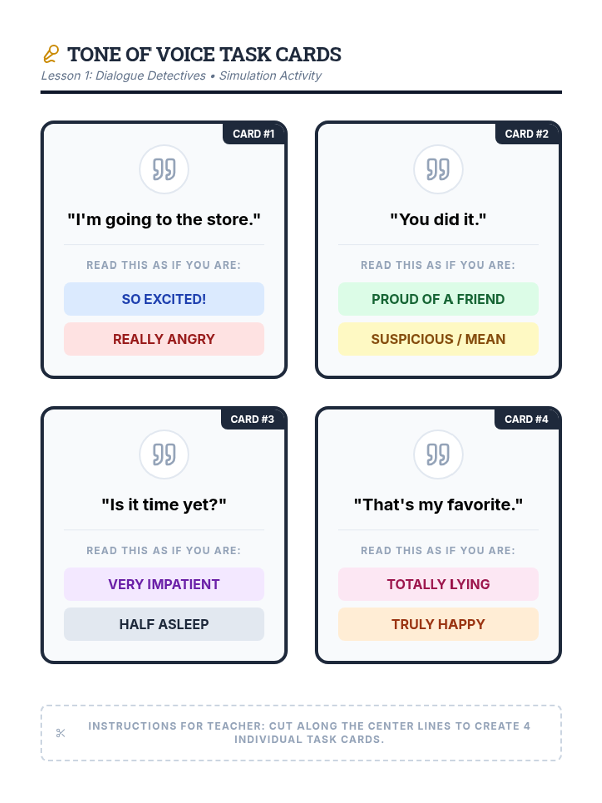 This sequence focuses on character analysis, helping students infer internal traits, motivations, and emotions based on external dialogue and actions. It moves from identifying temporary emotions to predicting long-term behavior based on established character traits.