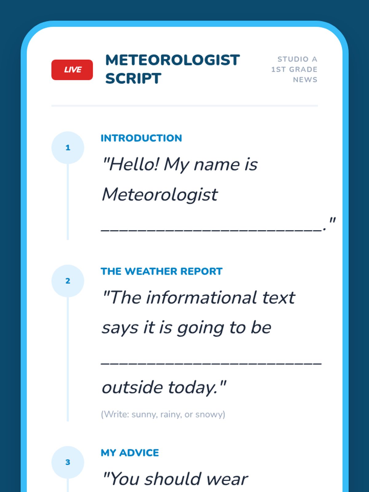 A 1st Grade ELA sequence focusing on read-along informational texts about weather to teach cause-and-effect, sequencing, and practical application of reading.