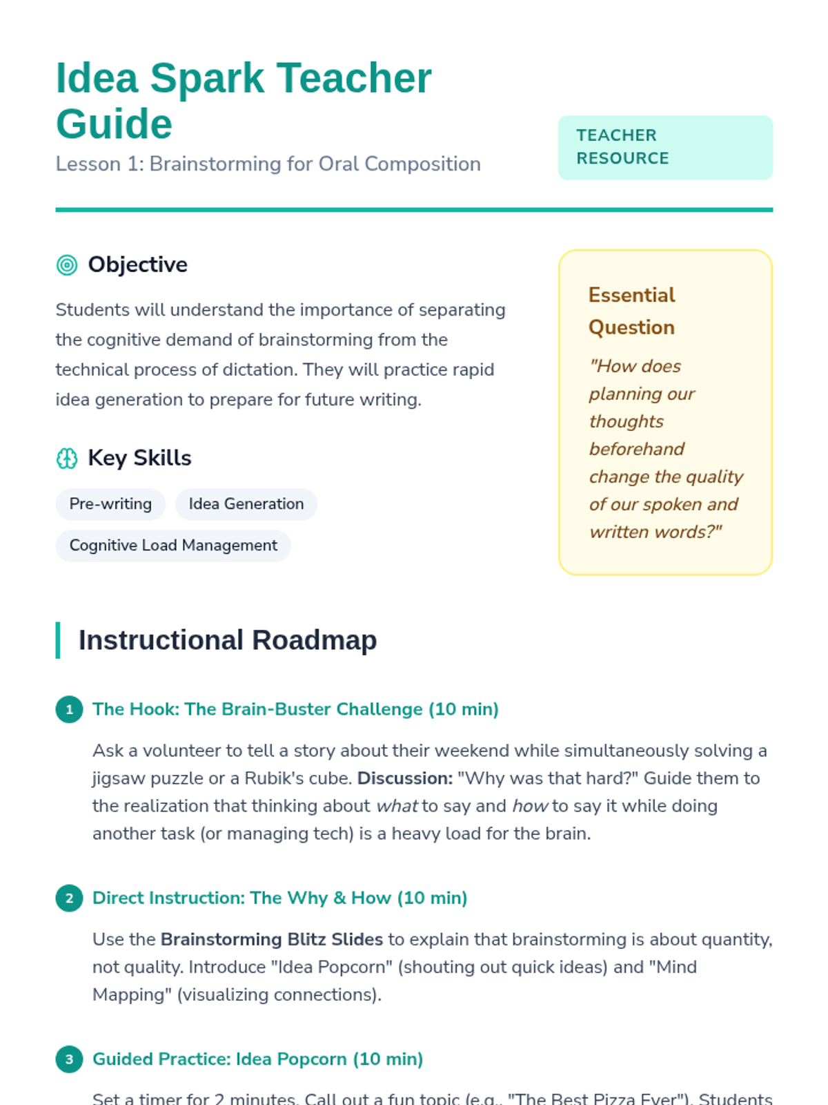 This sequence focuses on the cognitive planning required before activating the microphone, bridging the gap between thought and oral expression. Students explore how to organize their ideas using graphic organizers and bullet points to prevent rambling during dictation.