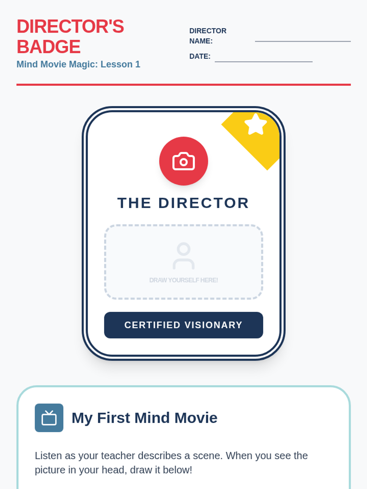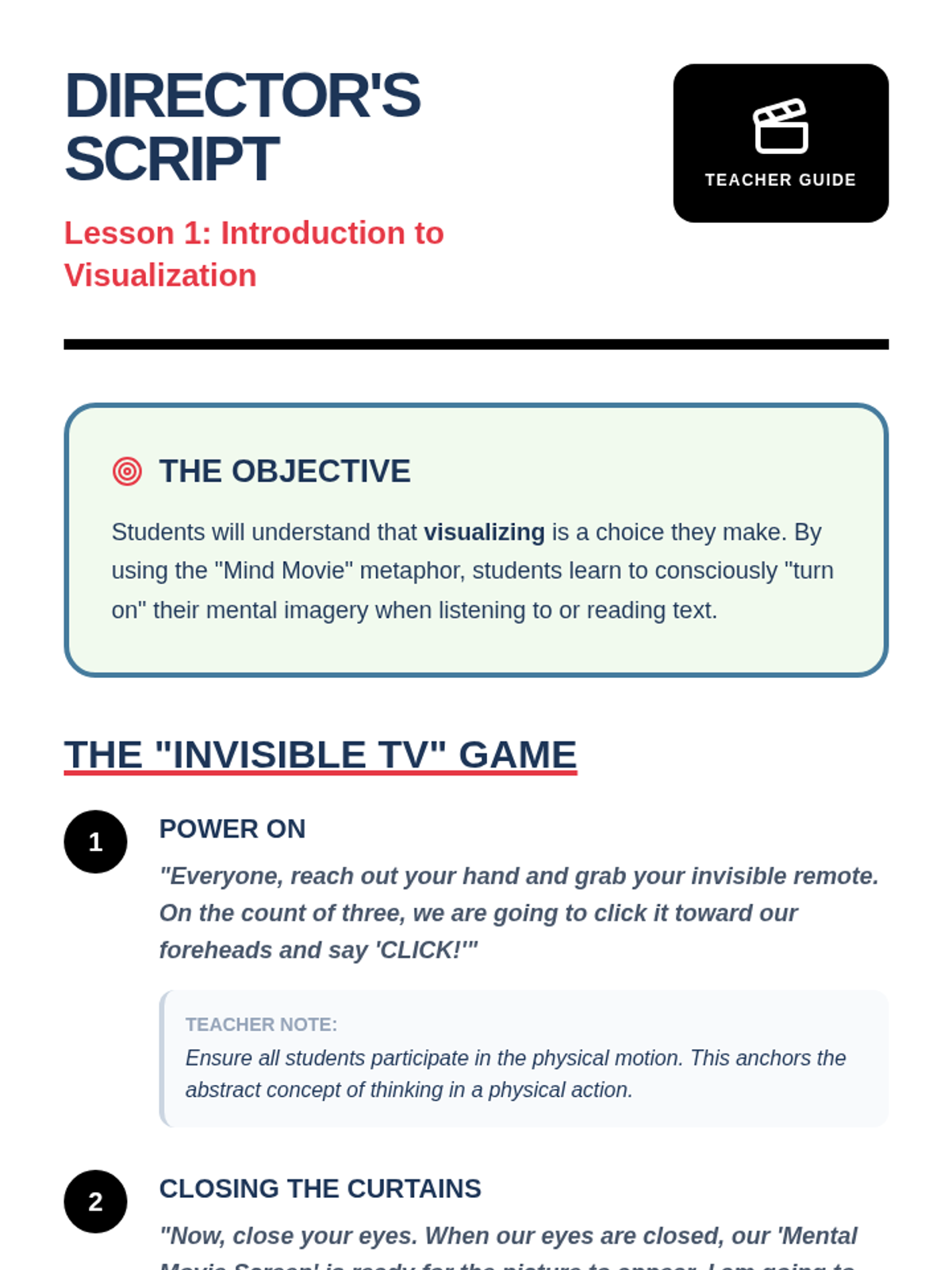 A 1st-grade sequence focused on teaching visualization strategies through the metaphor of a 'Mind Movie'. Students learn to cast characters, build settings, monitor comprehension, and retell stories using mental imagery.