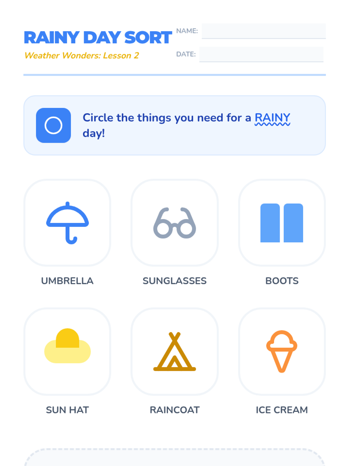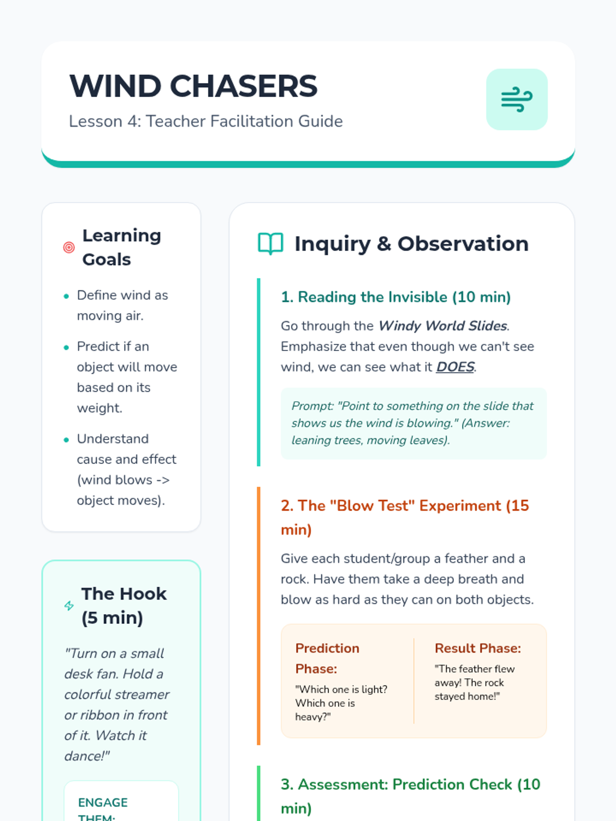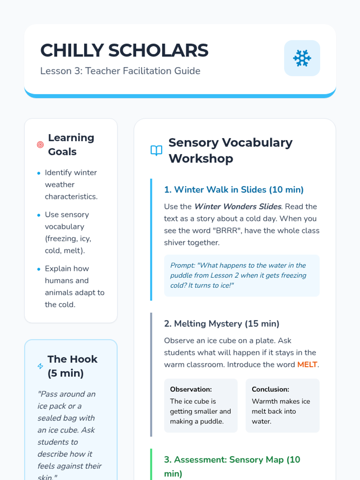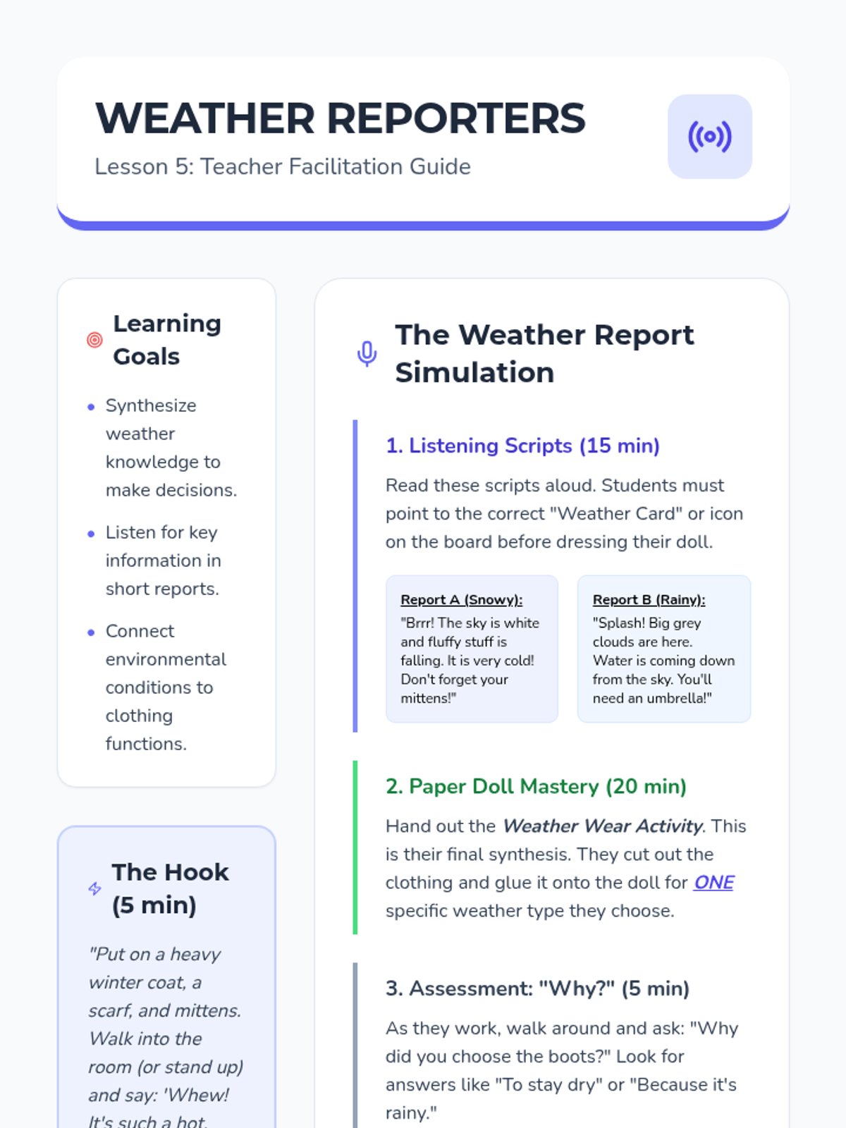 This Pre-K ELA sequence uses read-along informational texts to explore weather patterns and seasonal changes. Students develop observation skills and functional comprehension by connecting atmospheric conditions to daily life, clothing choices, and activities.