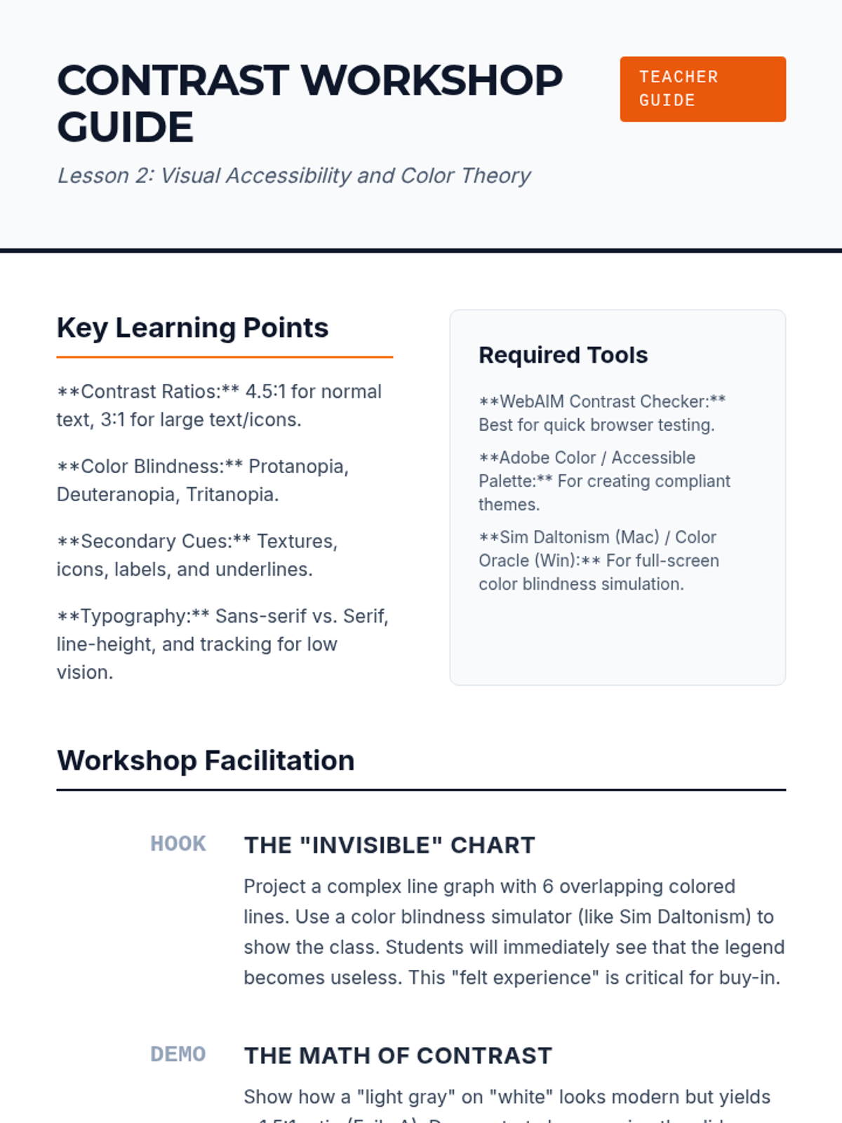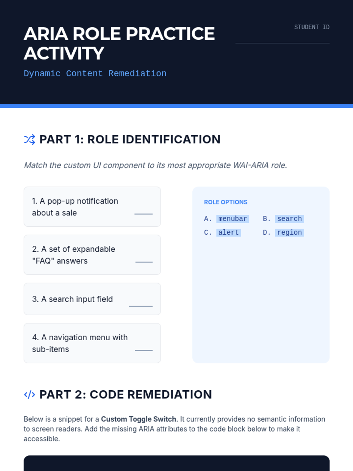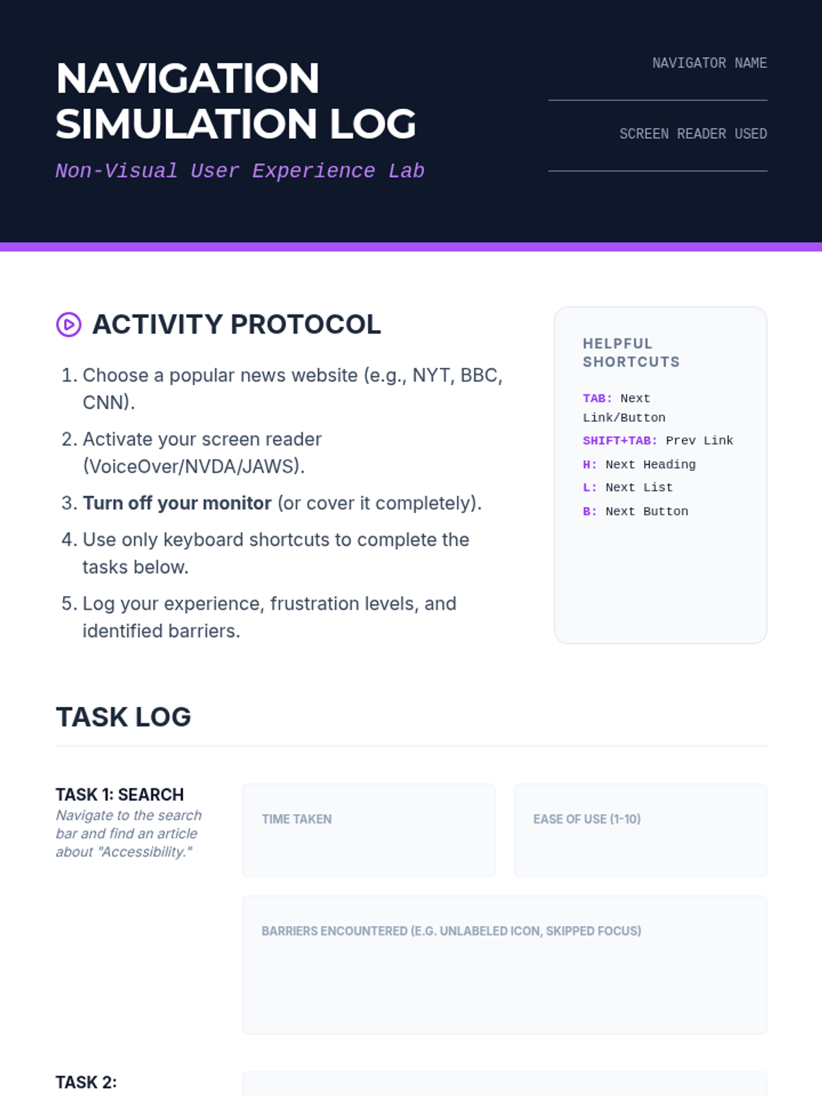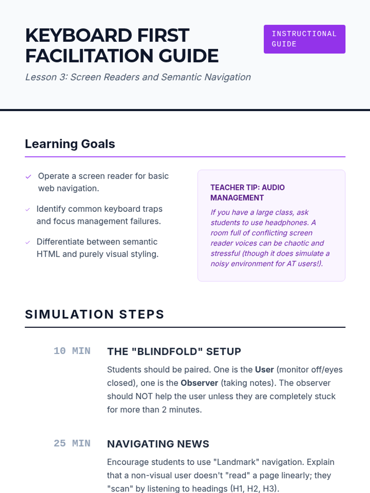 This sequence introduces undergraduate students to the critical role of keyboard navigation in assistive technology, specifically focusing on screen reader interaction. Students will analyze semantic navigation, table traversal, and focus traps to understand how to design and audit for digital accessibility.