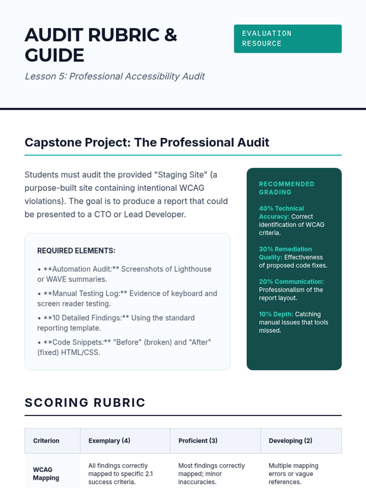 A comprehensive graduate-level sequence on web accessibility, covering WCAG standards, legal compliance, technical implementation of ARIA, and professional auditing techniques.