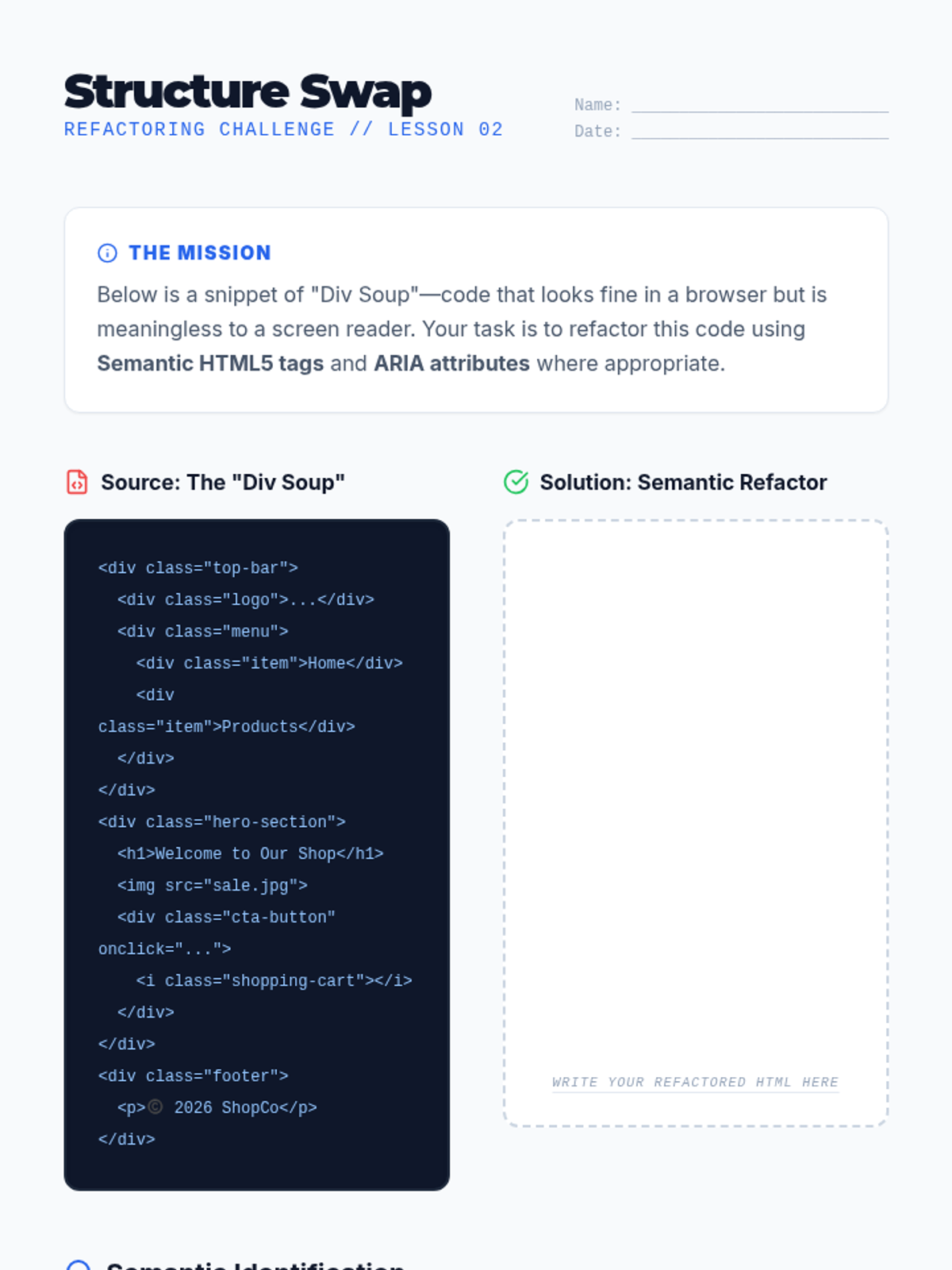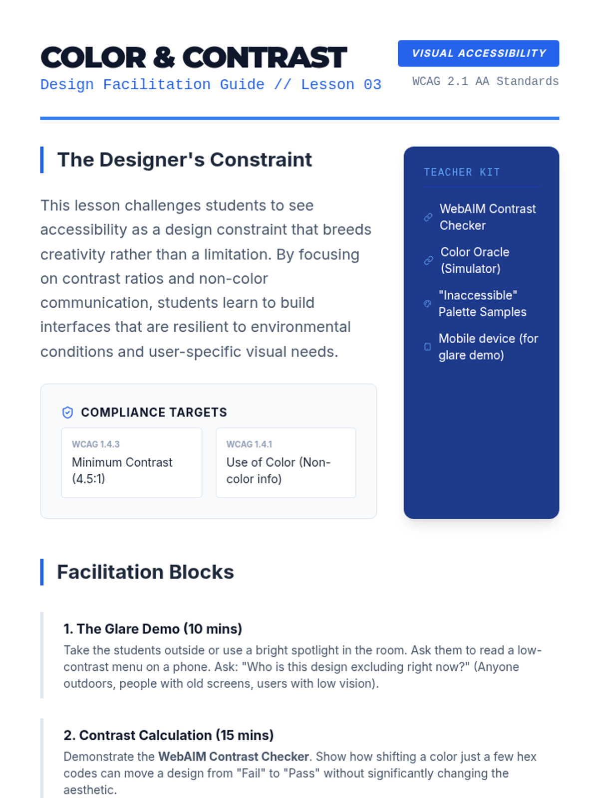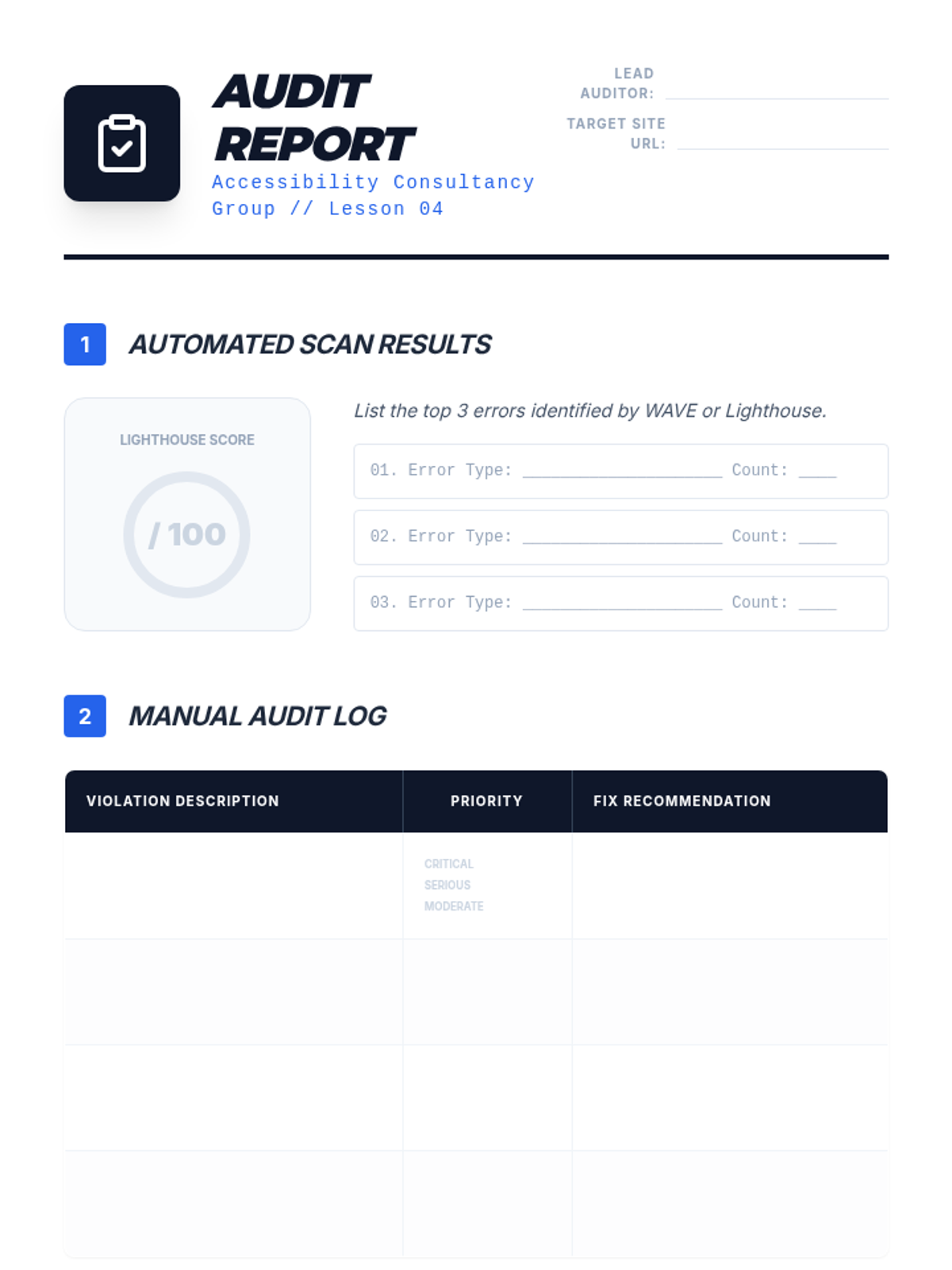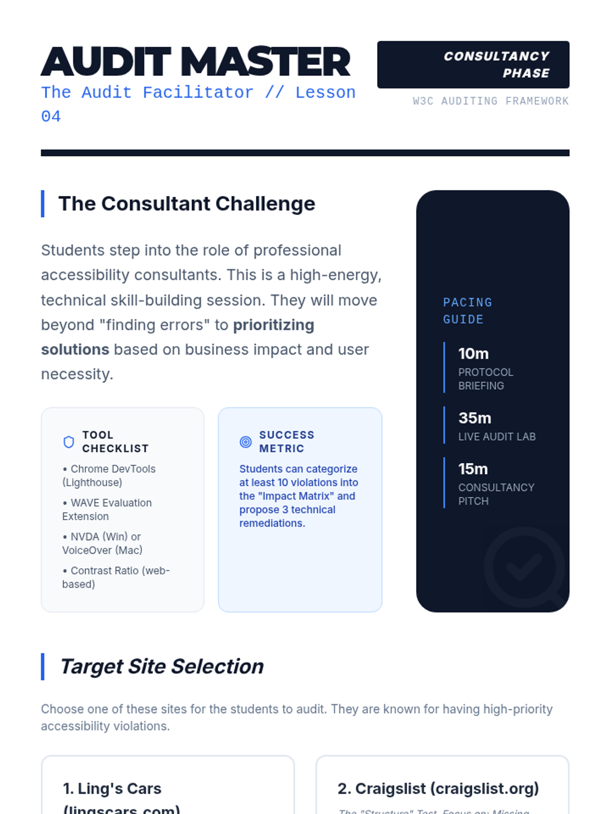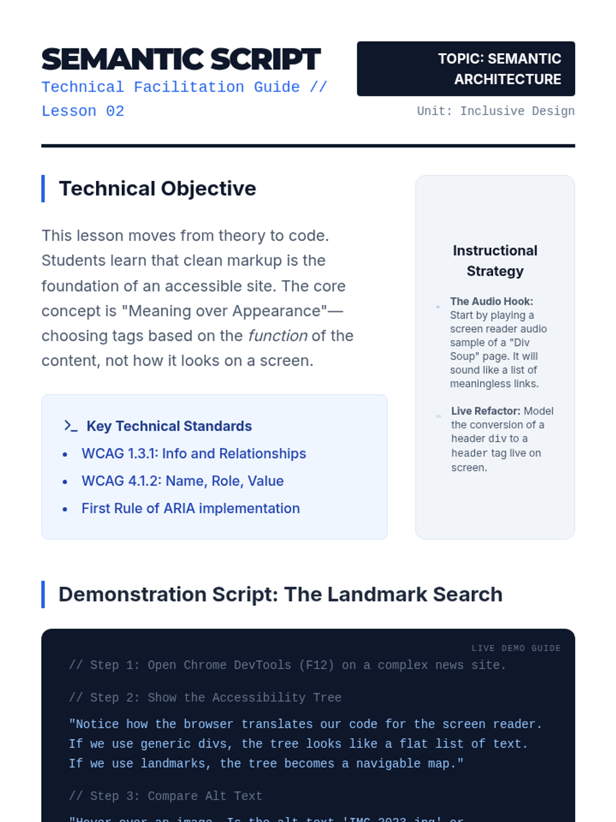 A comprehensive unit on web accessibility focusing on WCAG standards, semantic HTML, ARIA roles, and inclusive design principles. Students move from empathy-building simulations to conducting professional accessibility audits and remediating code to meet international standards.