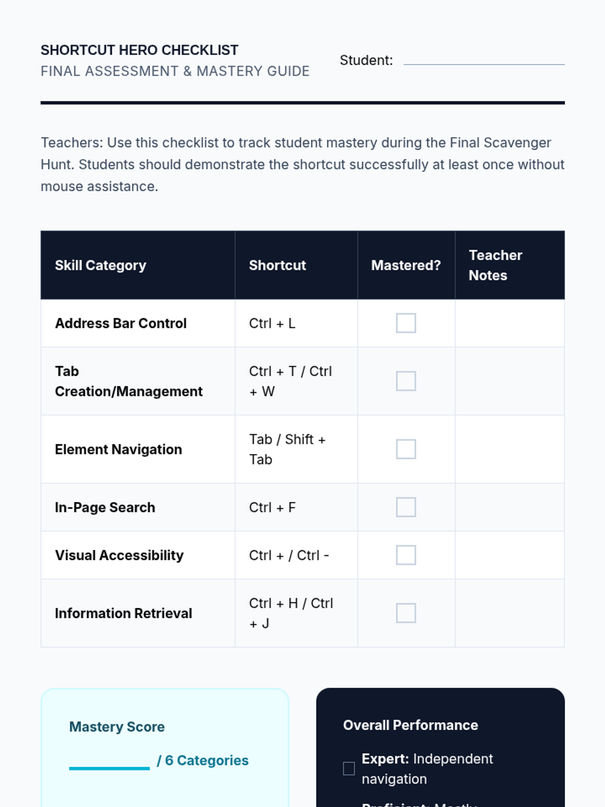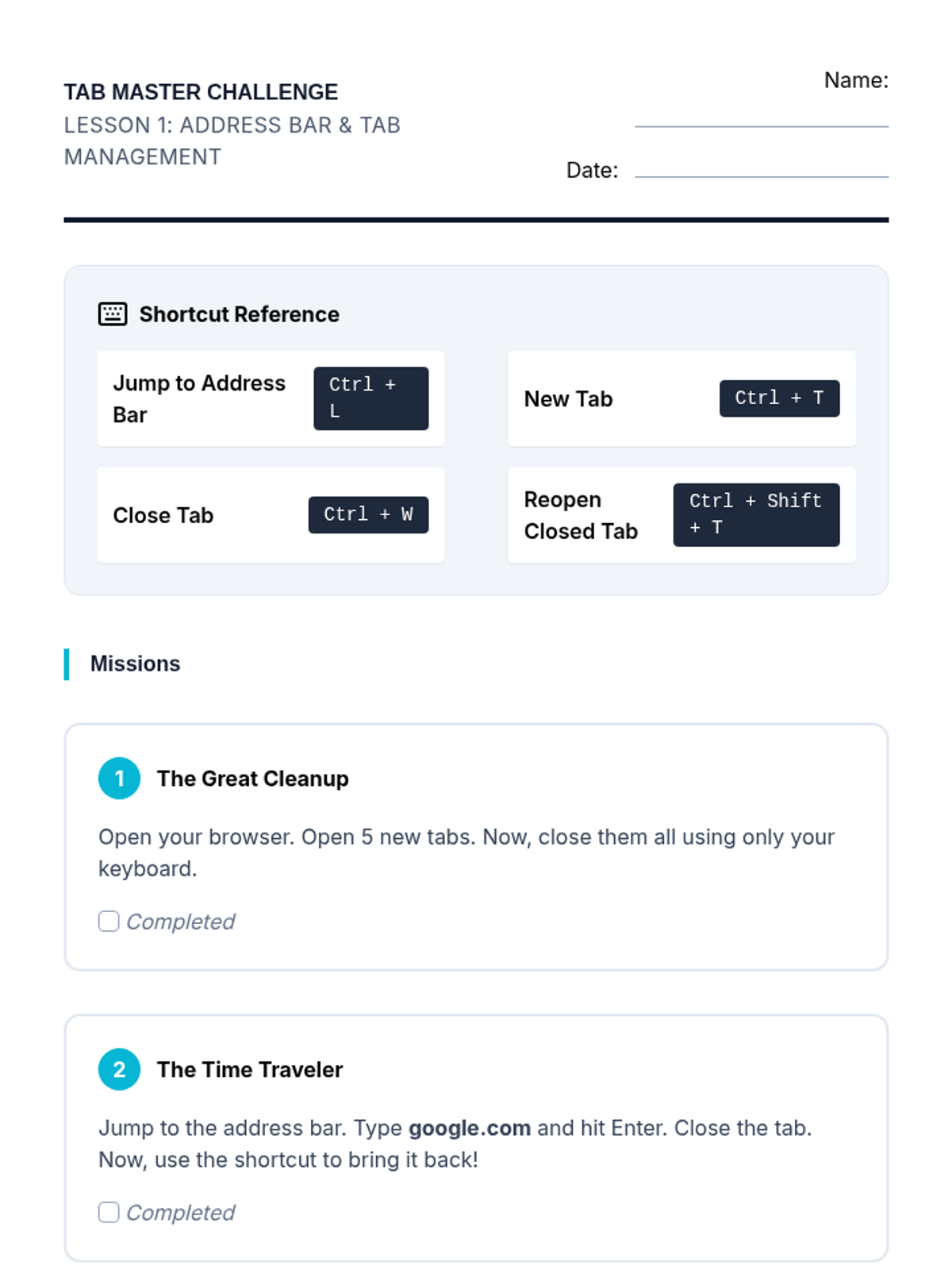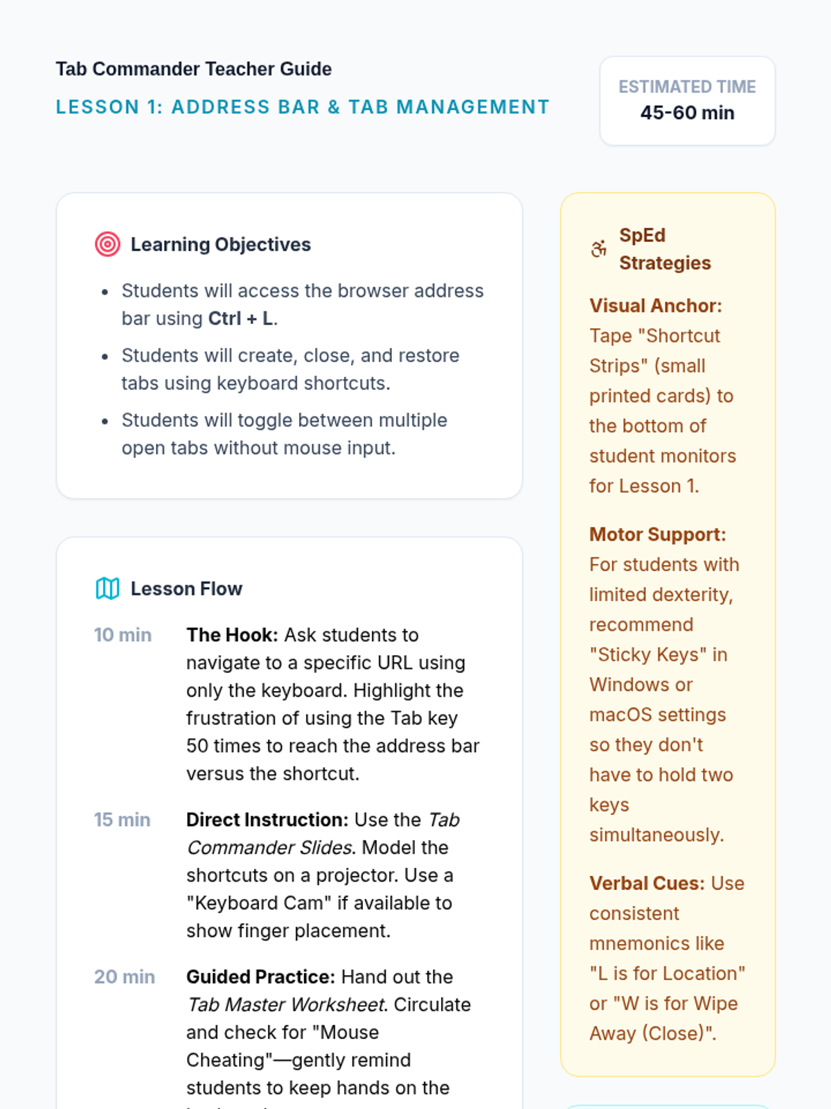 This sequence teaches 8th-grade students with diverse learning needs how to navigate the internet efficiently using keyboard shortcuts. It focuses on accessibility, speed, and independence for students who may have motor impairments or use screen readers.