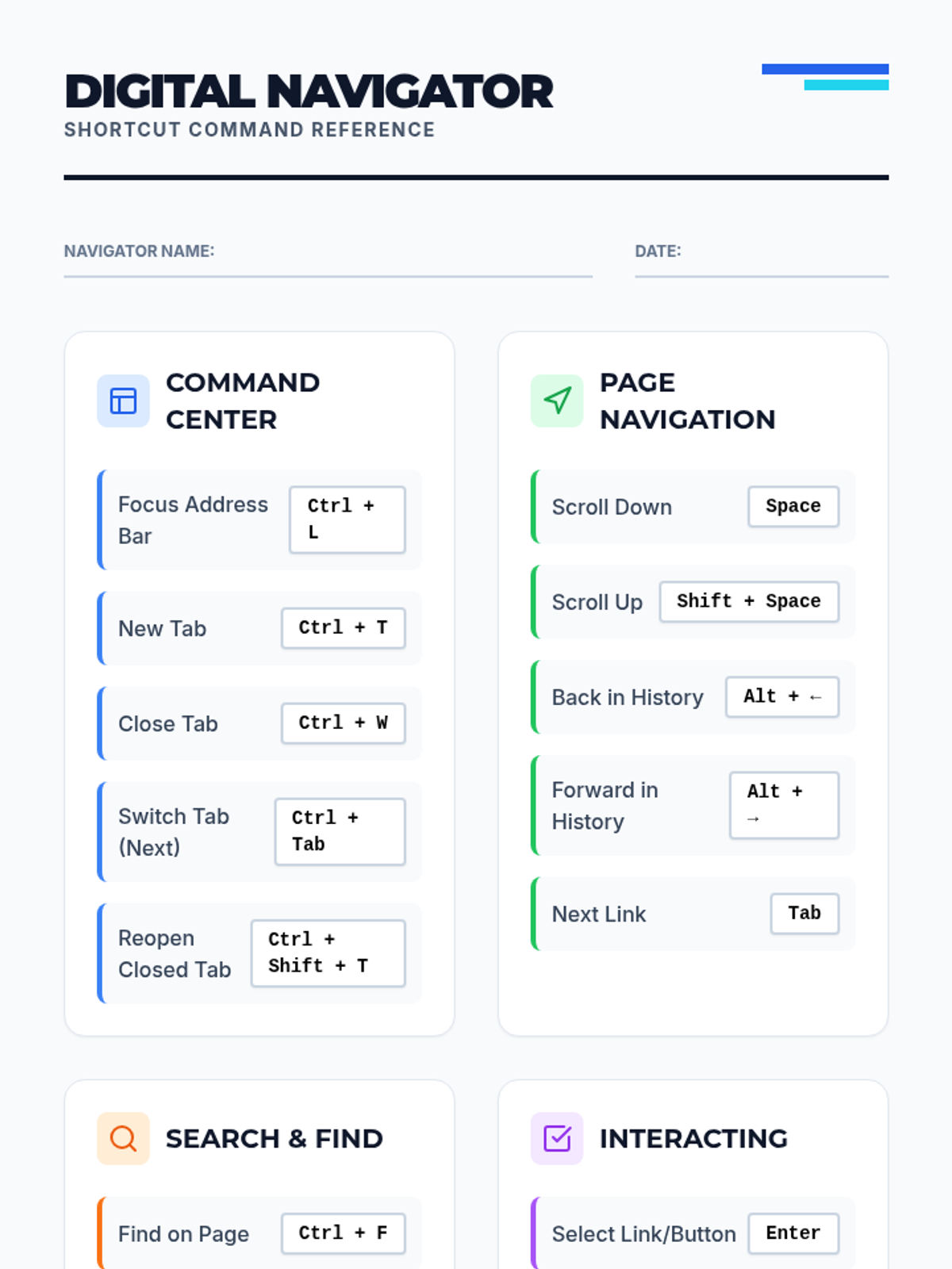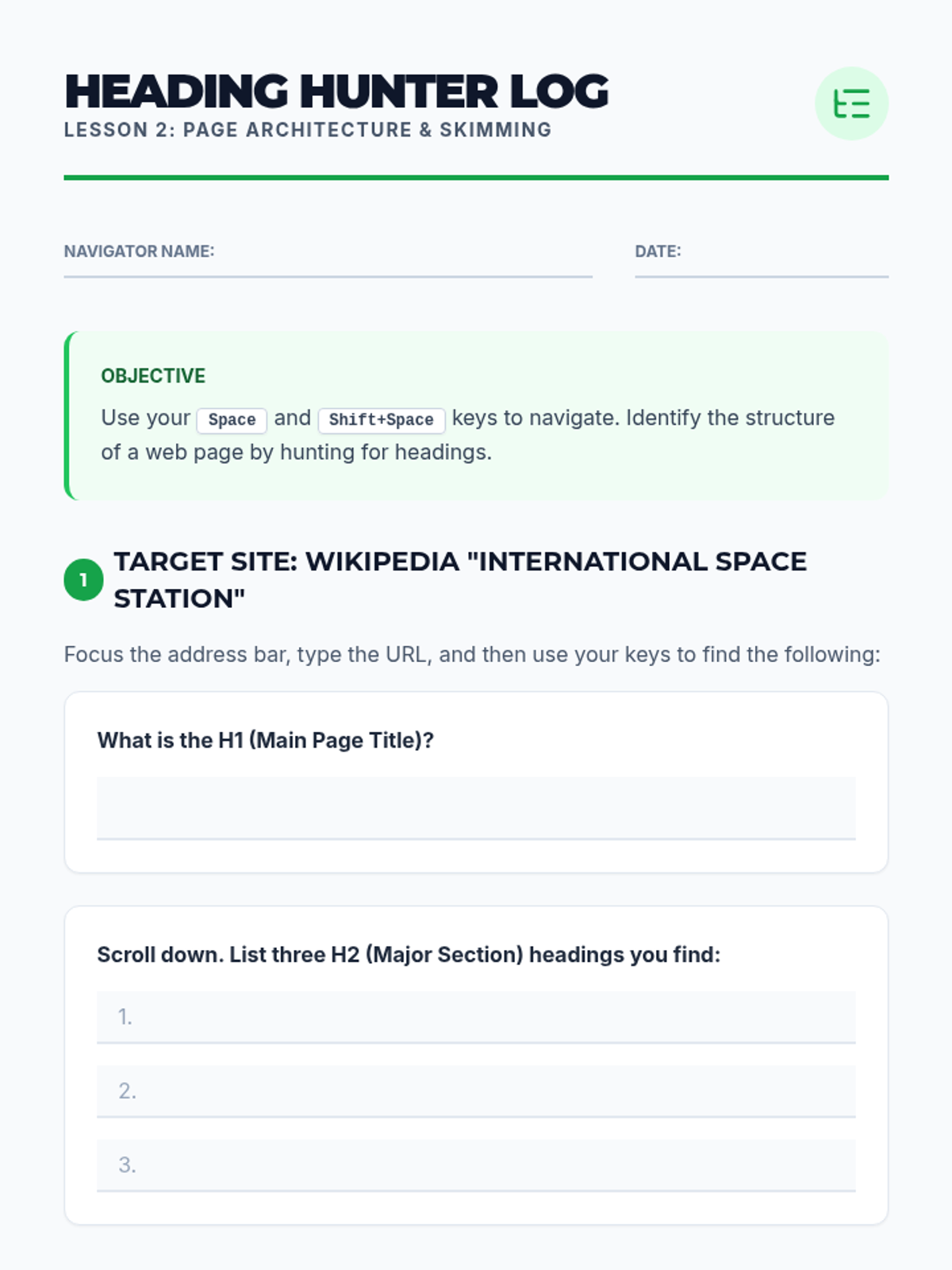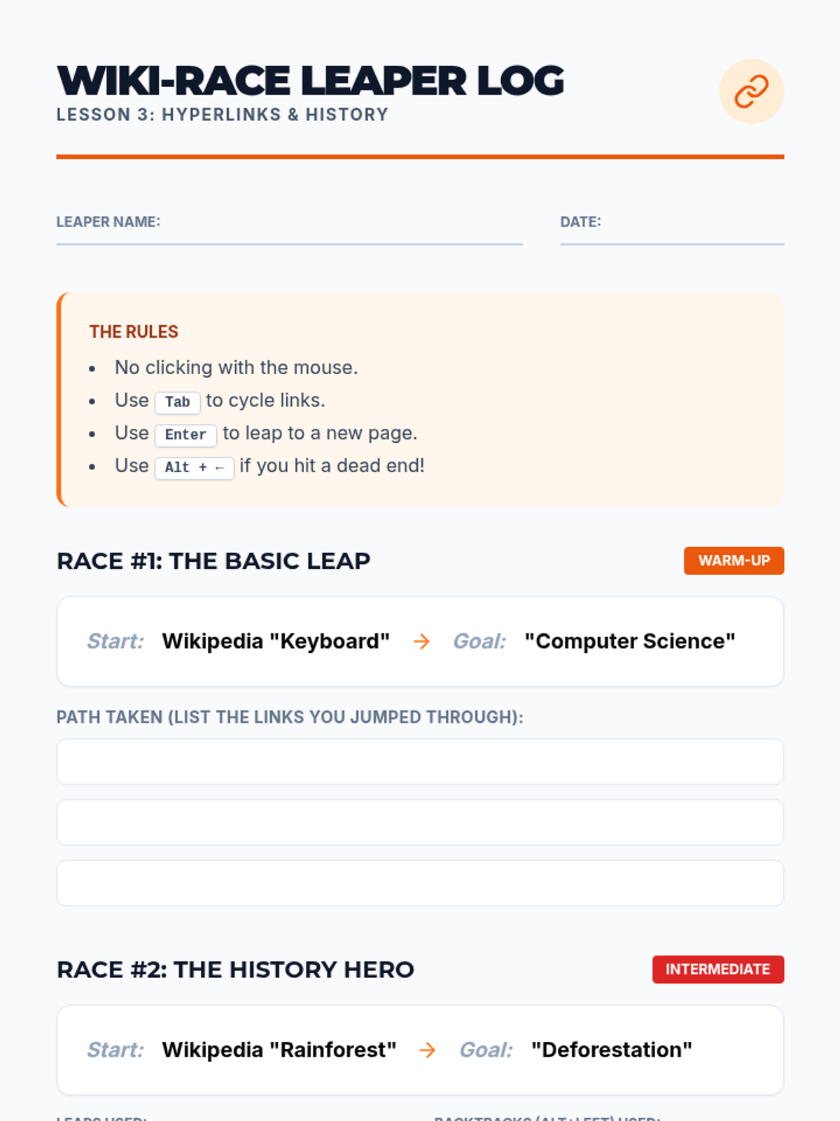 A comprehensive sequence teaching 9th-grade students how to navigate the web using only keyboard shortcuts, focusing on browser interface, content skimming, hyperlink usage, and form completion.