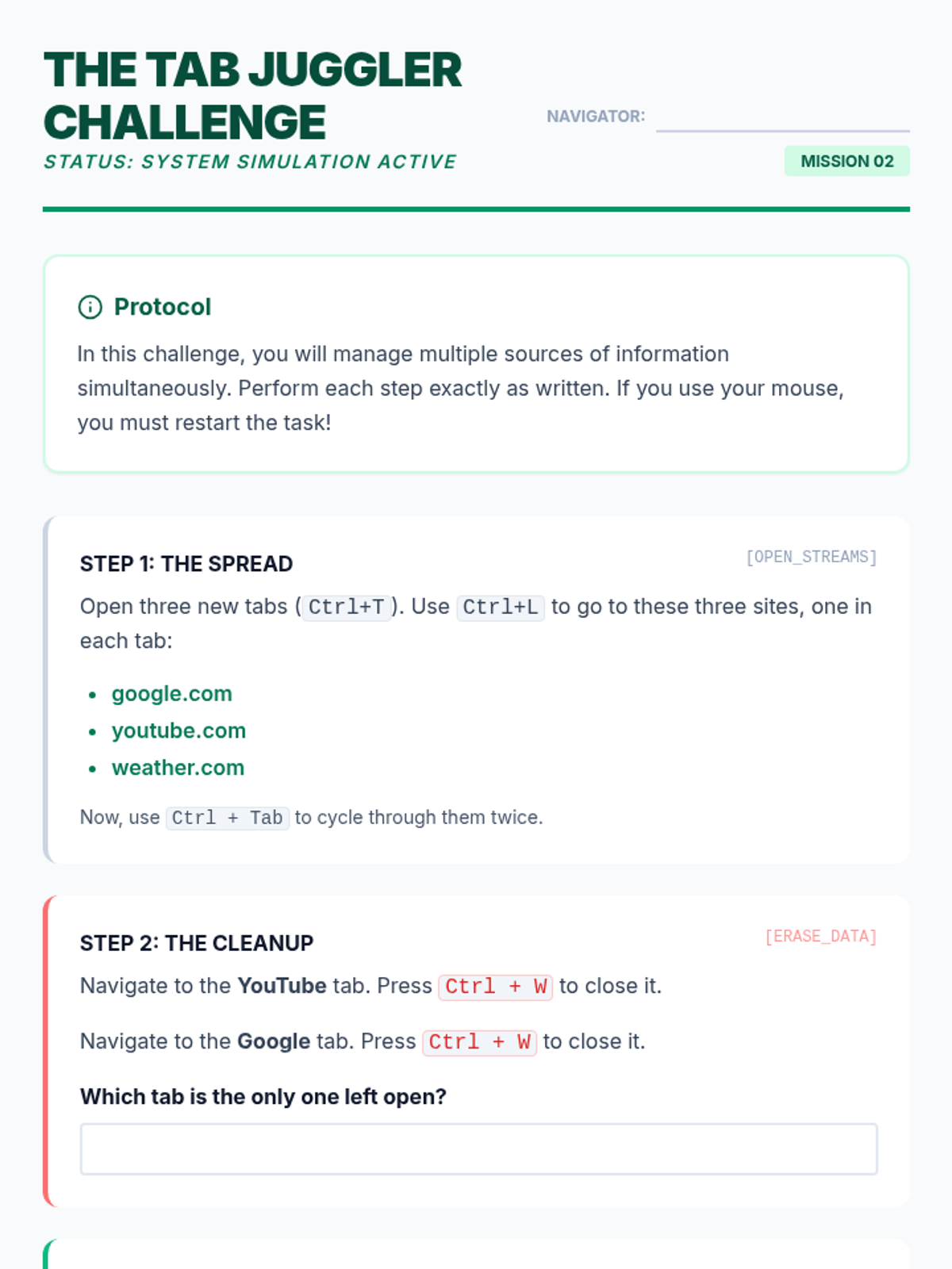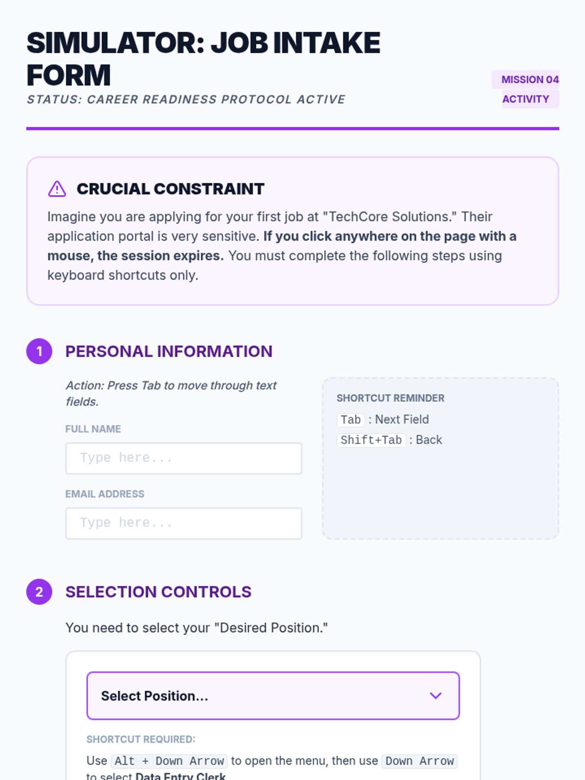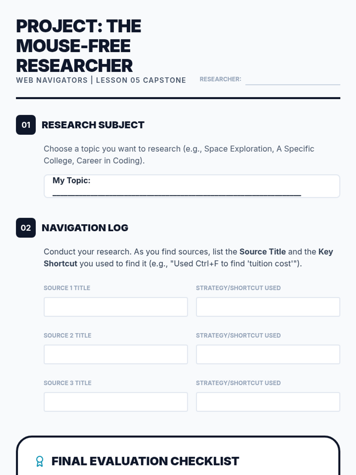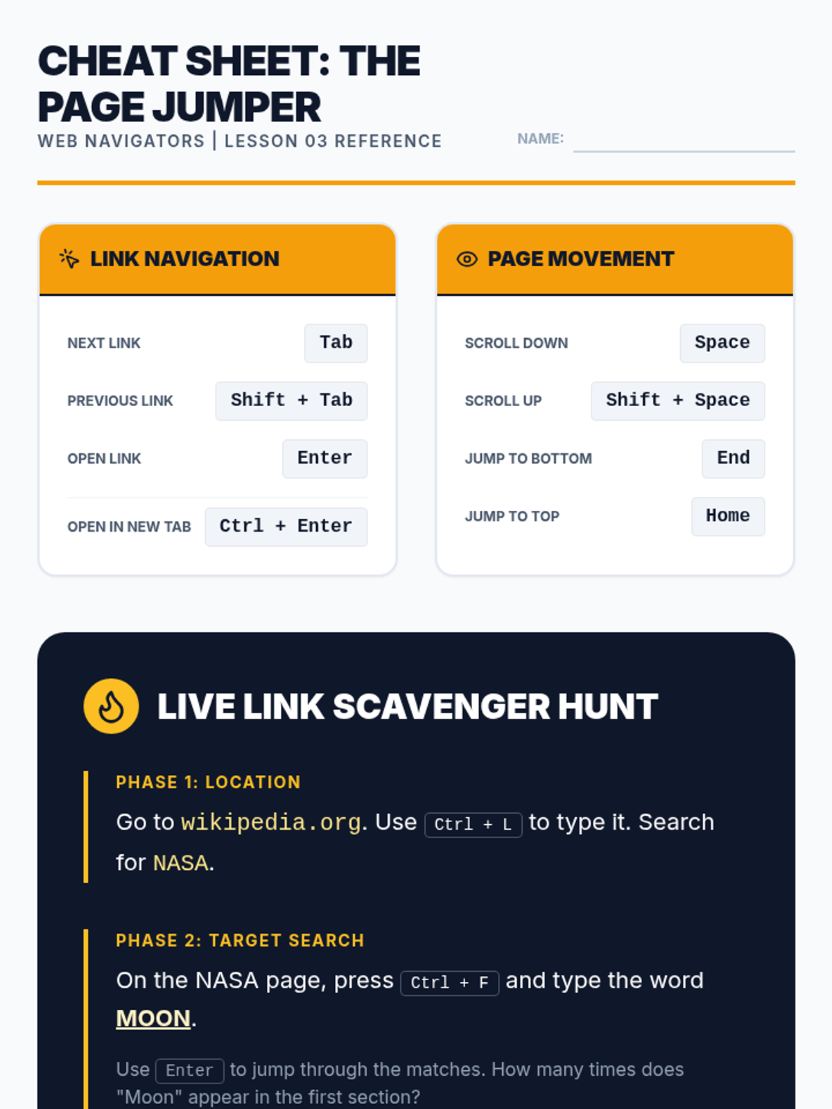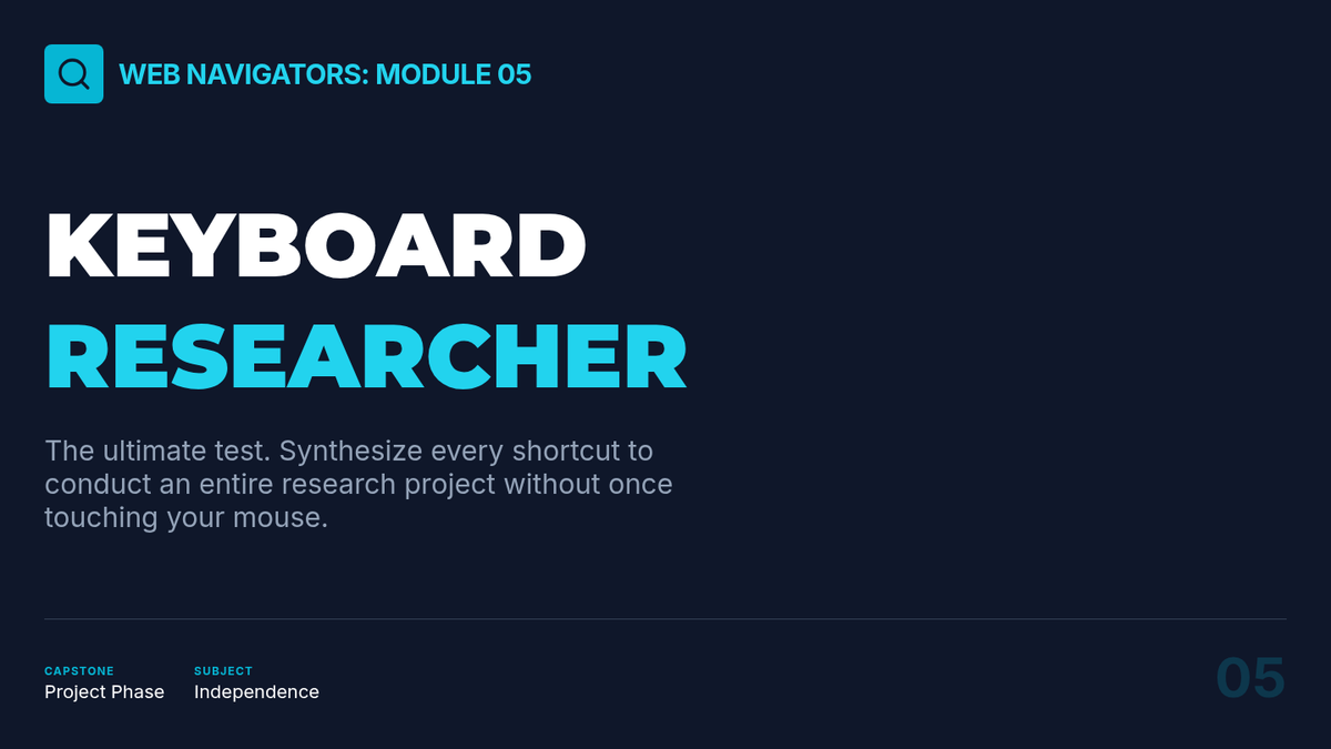 A comprehensive sequence for 12th-grade students on mastering web browser navigation using keyboard shortcuts. This unit covers address bar manipulation, tab management, link navigation, form interaction, and integrated research workflows to build independence and efficiency in digital environments.