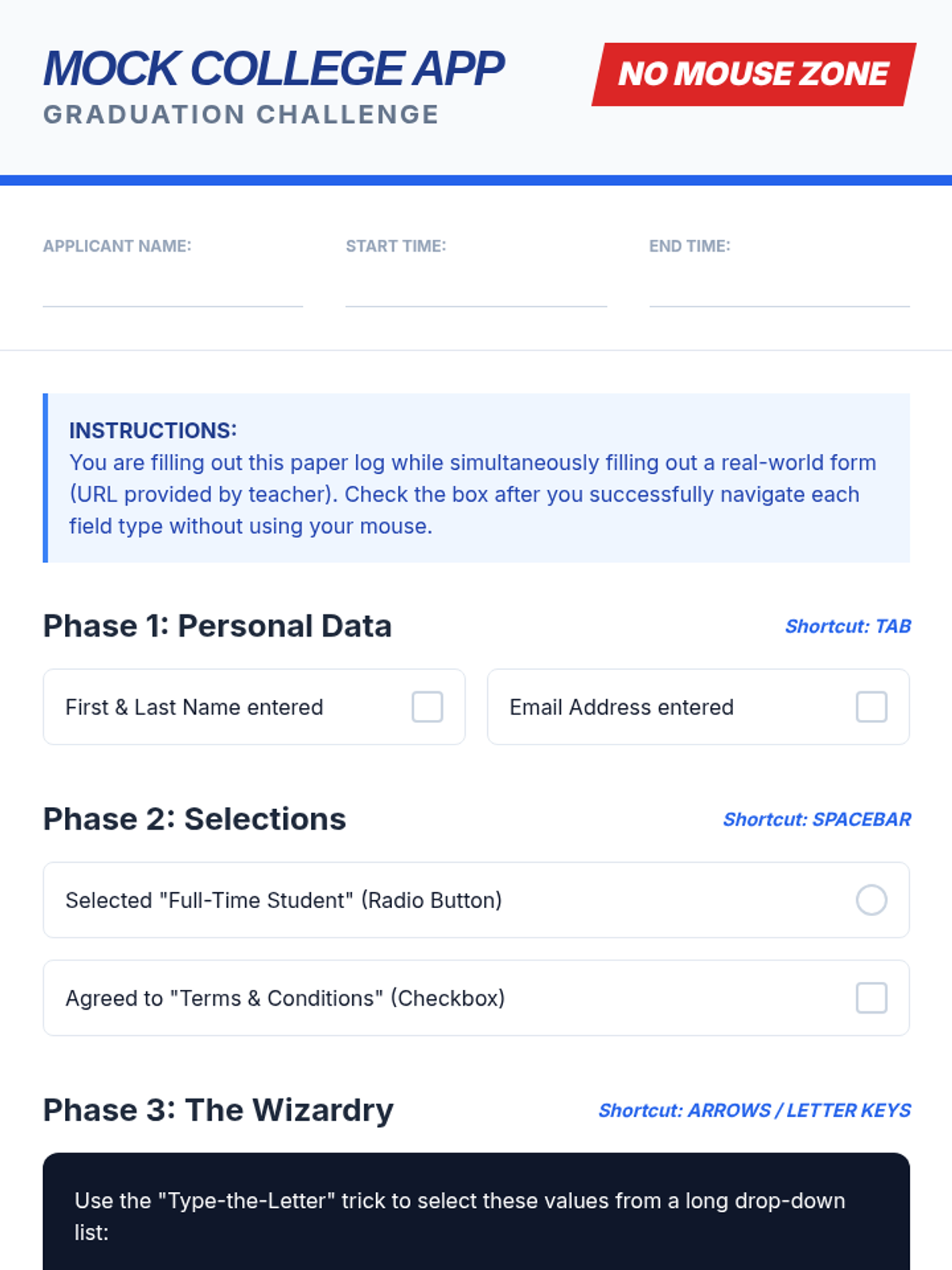A comprehensive sequence designed for 11th-grade students to master keyboard-only web navigation, focusing on browser interface, tab management, content interaction, and form completion to prepare for college and career independence.