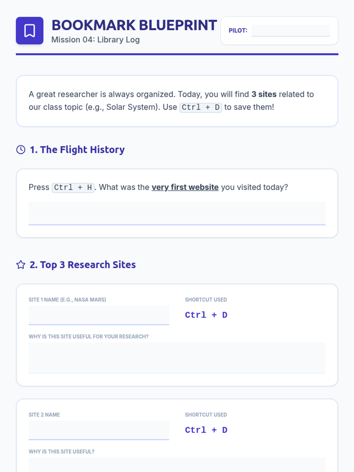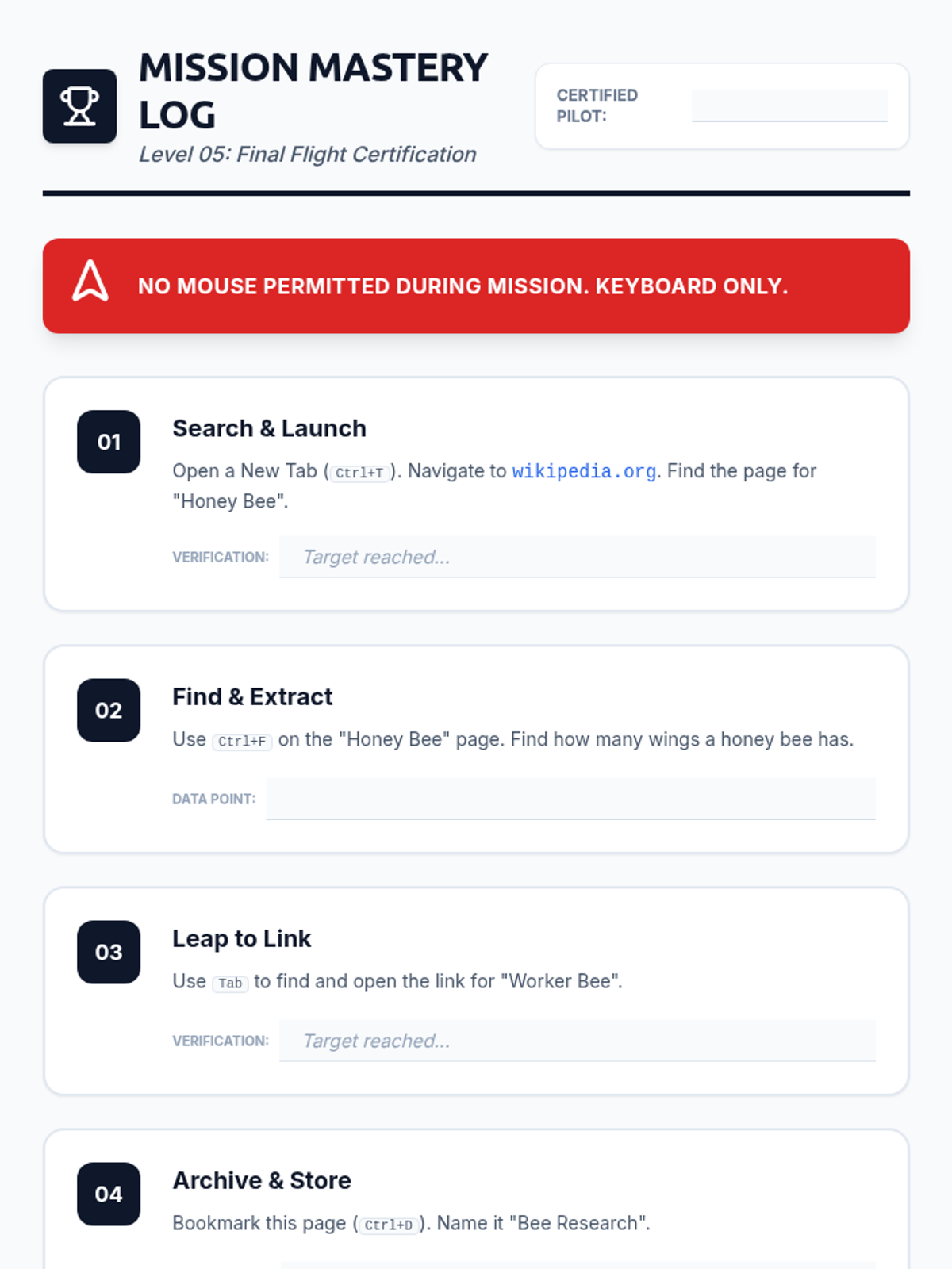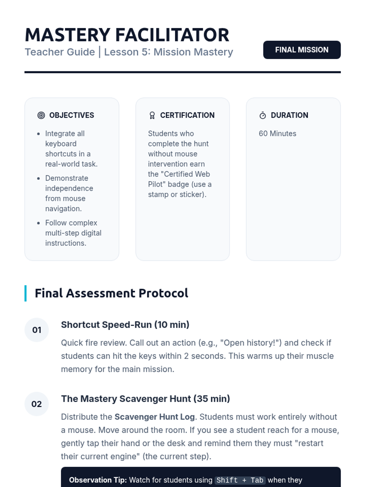 A comprehensive 5-lesson sequence for 5th-grade students on keyboard shortcut navigation for web browsing and research. This series transforms students into 'Web Pilots,' teaching them to navigate, search, and manage web content entirely through keyboard commands to foster independence and efficiency.