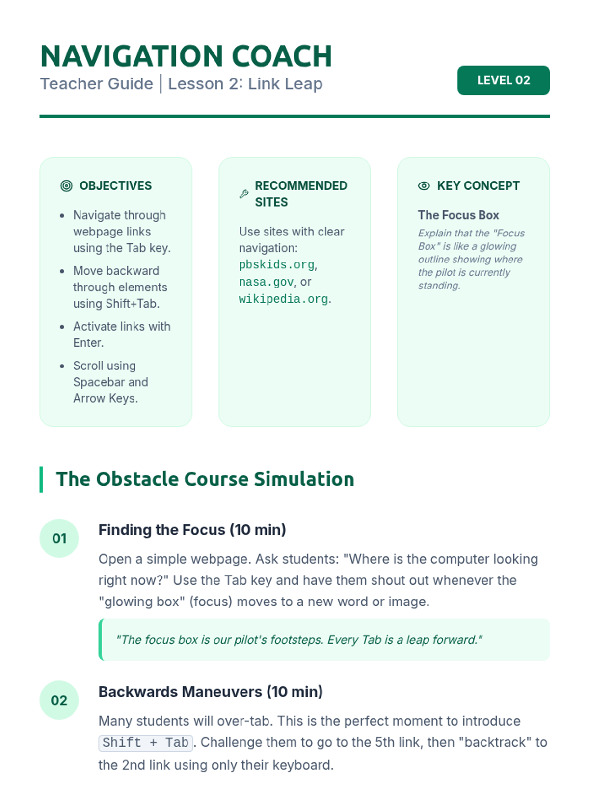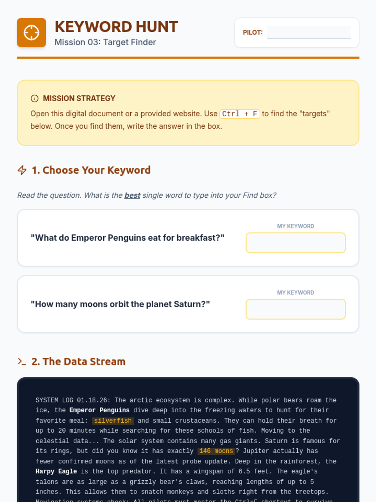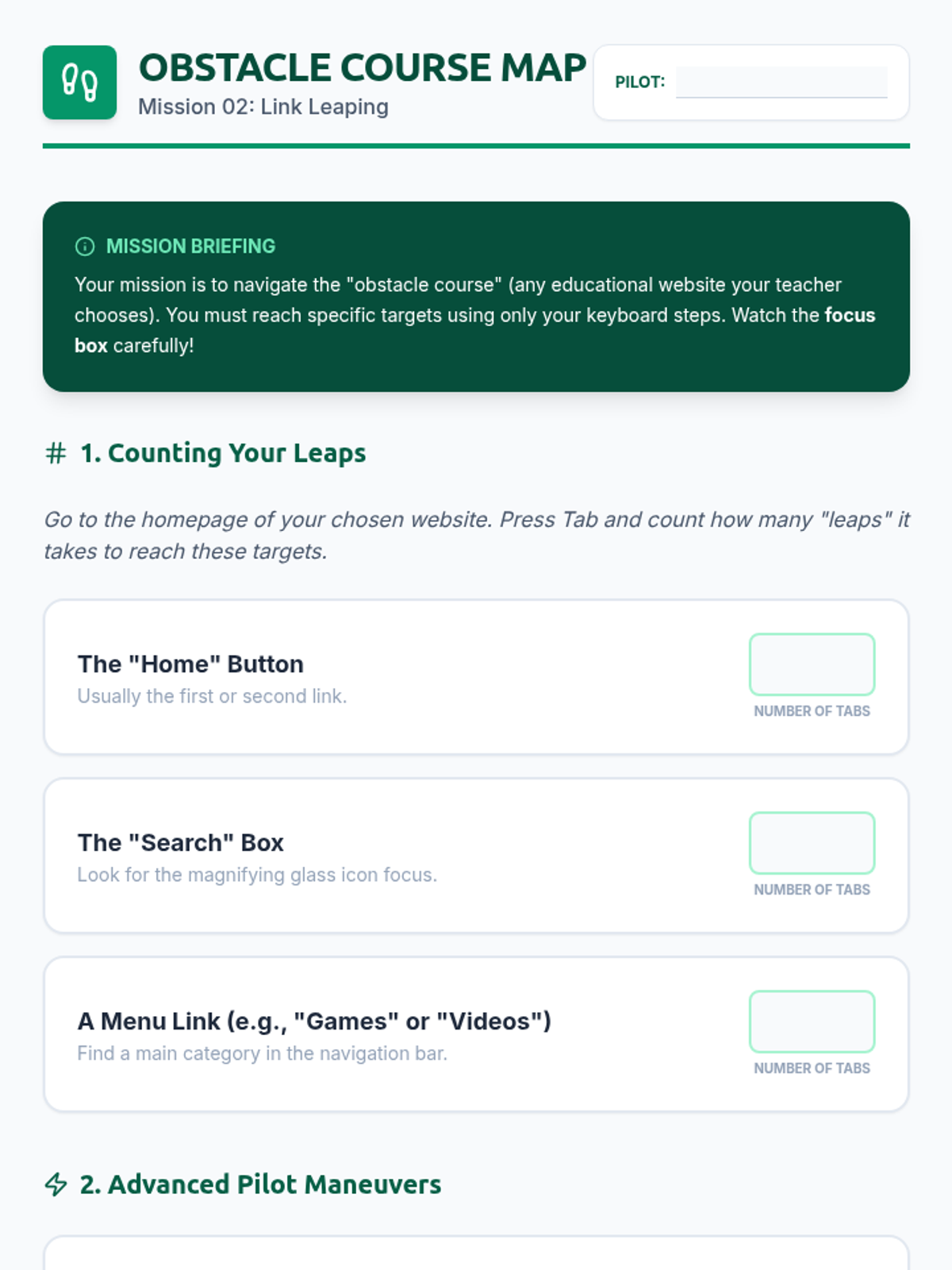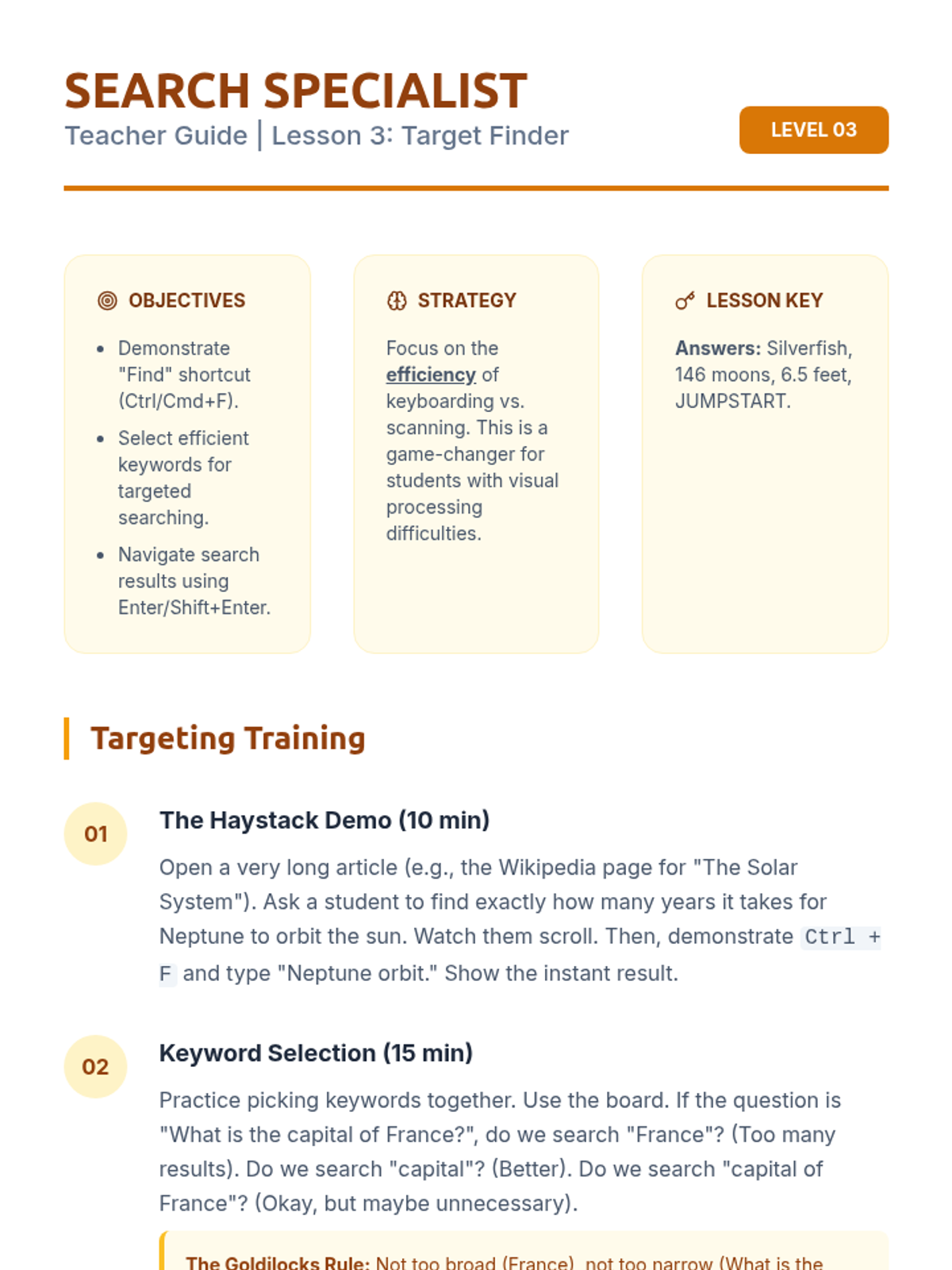 A comprehensive 5-lesson sequence for 5th-grade students on keyboard shortcut navigation for web browsing and research. This series transforms students into 'Web Pilots,' teaching them to navigate, search, and manage web content entirely through keyboard commands to foster independence and efficiency.