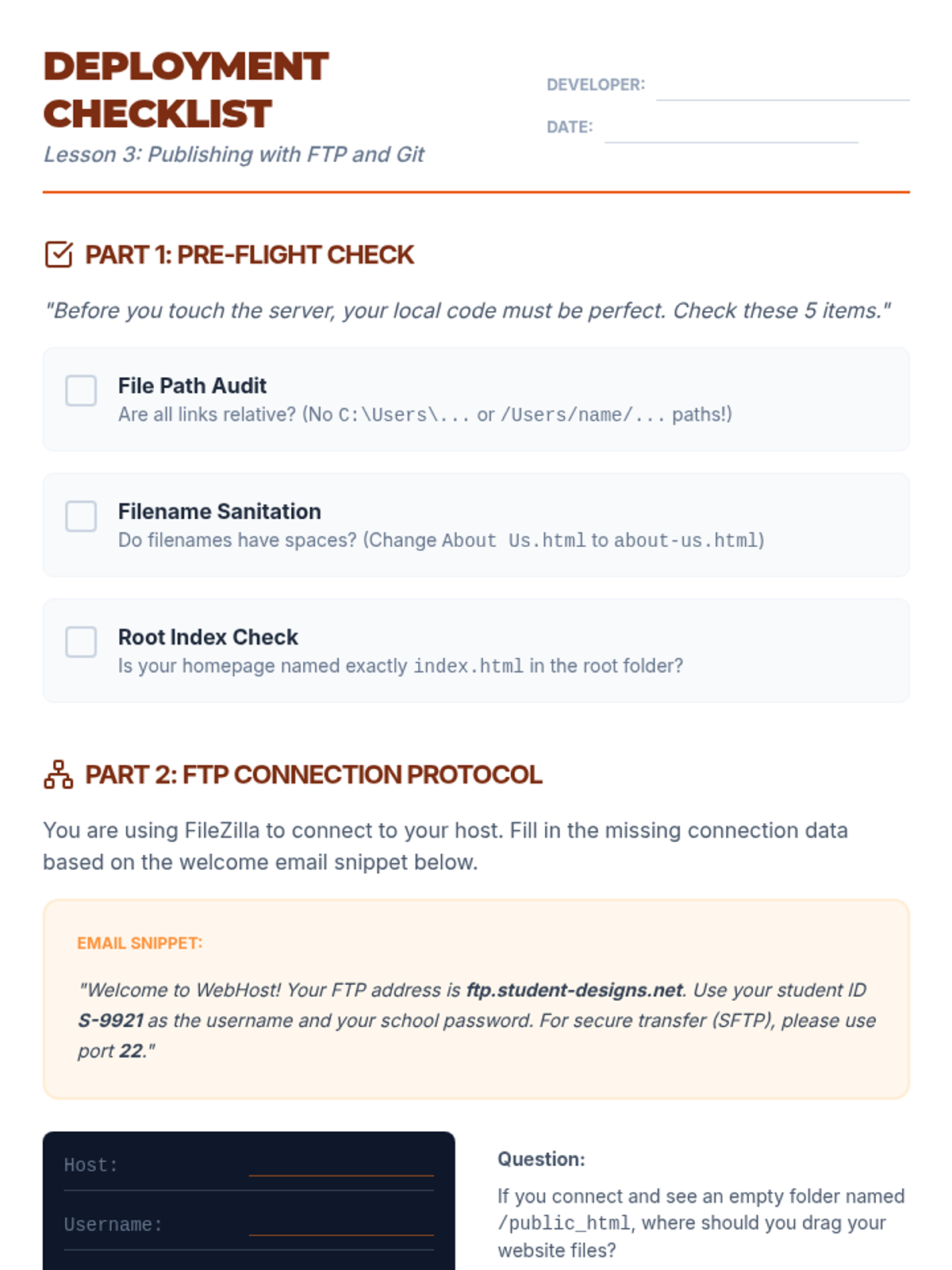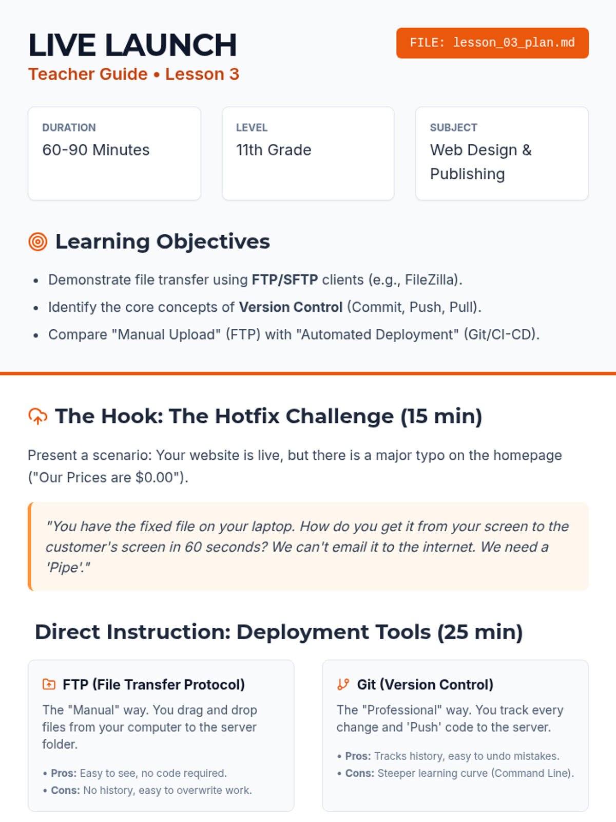 A comprehensive deep dive into the technical infrastructure of the web, covering file management, hosting, deployment, SEO, and optimization for high school seniors. Students will transition from local development to public web publishing.
