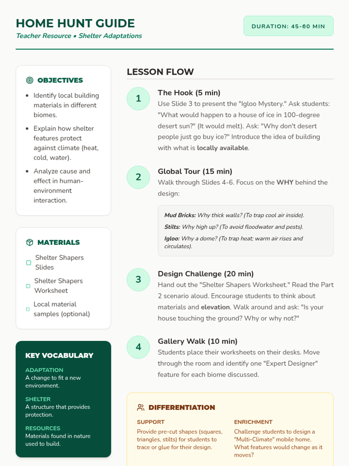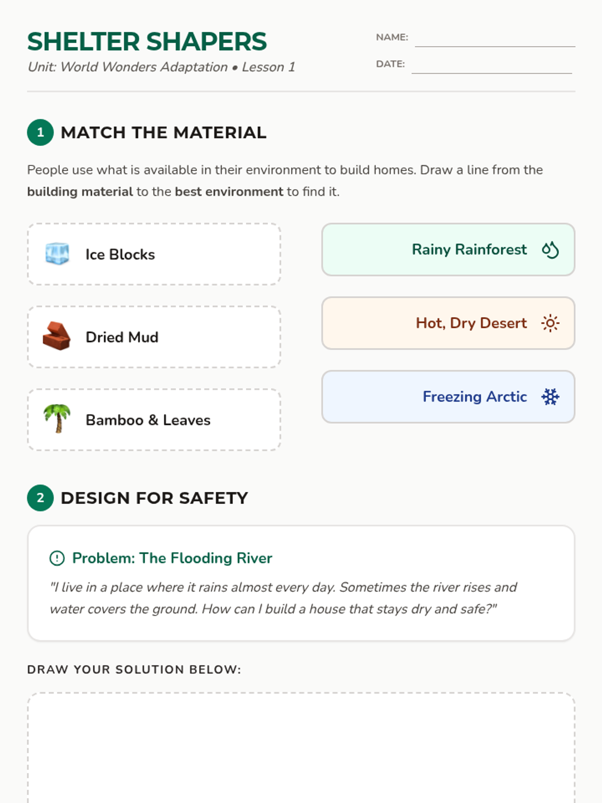 A 2nd-grade geography sequence where students explore how human shelter, clothing, food, and traditions adapt to different climates and environments around the world. The journey ends with a hands-on project designing a climate-appropriate home.