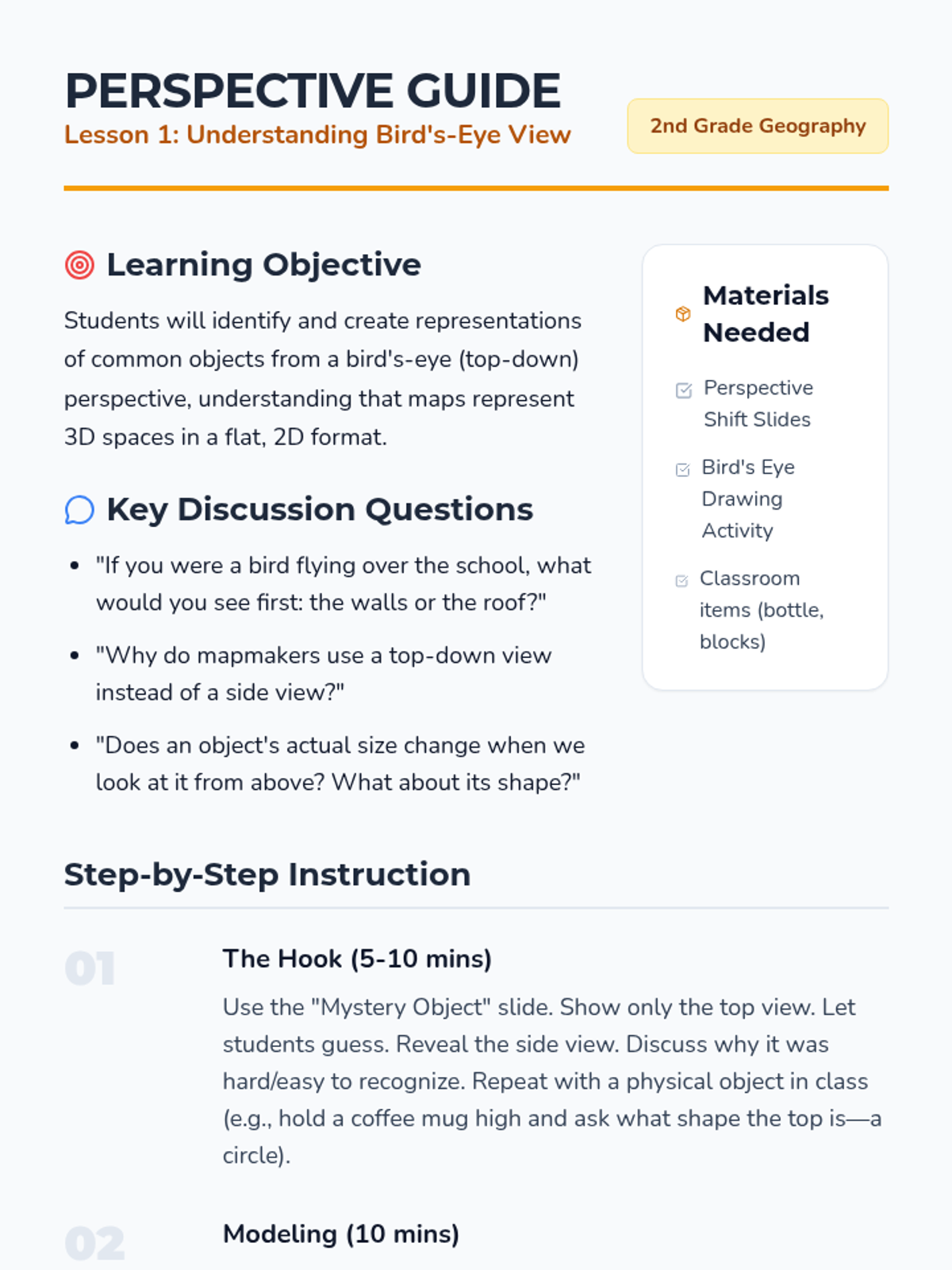 A foundational geography sequence for 2nd graders focusing on bird's-eye perspective, map symbols, legends, and cardinal directions through interactive workshops and activities.