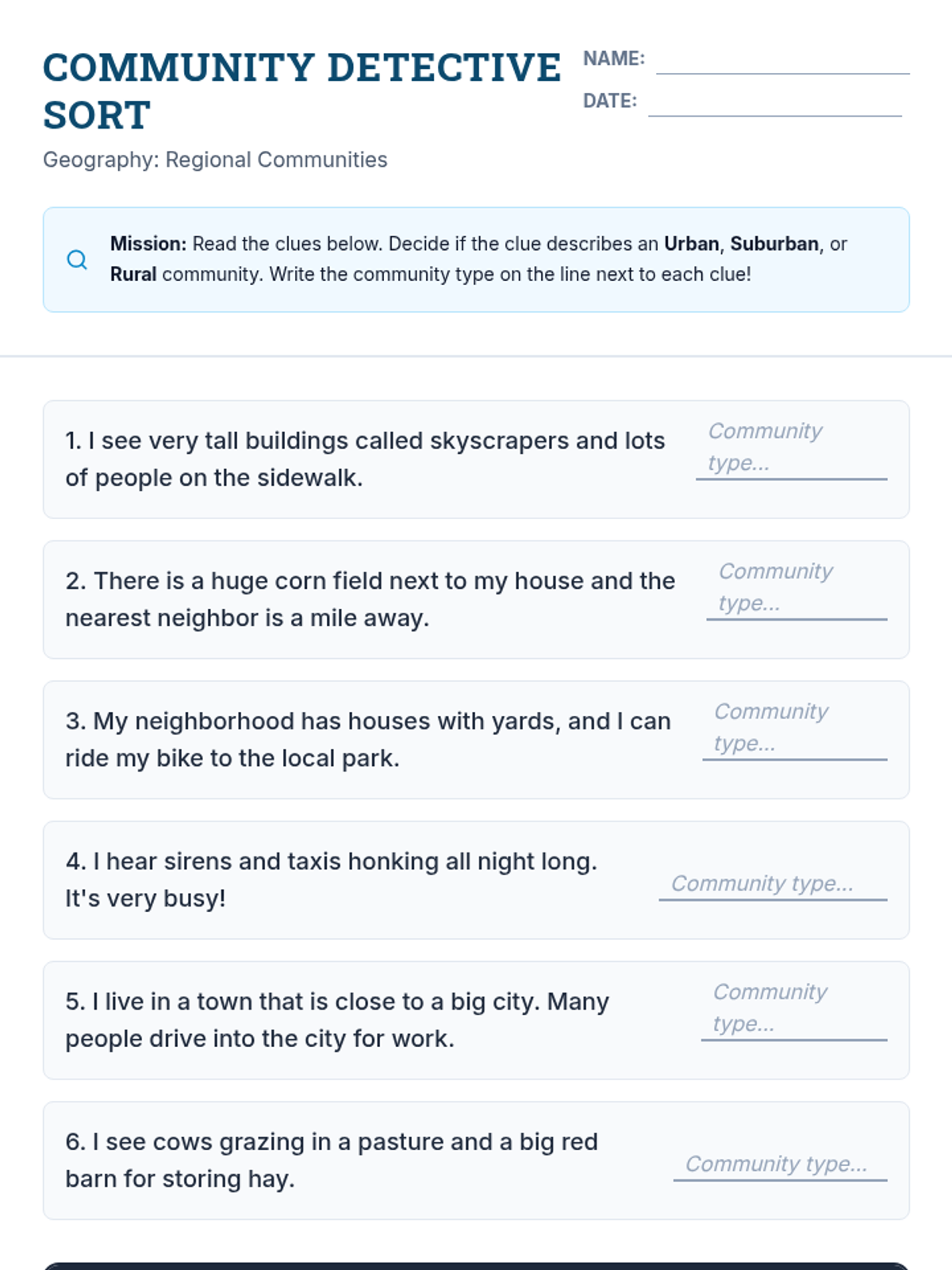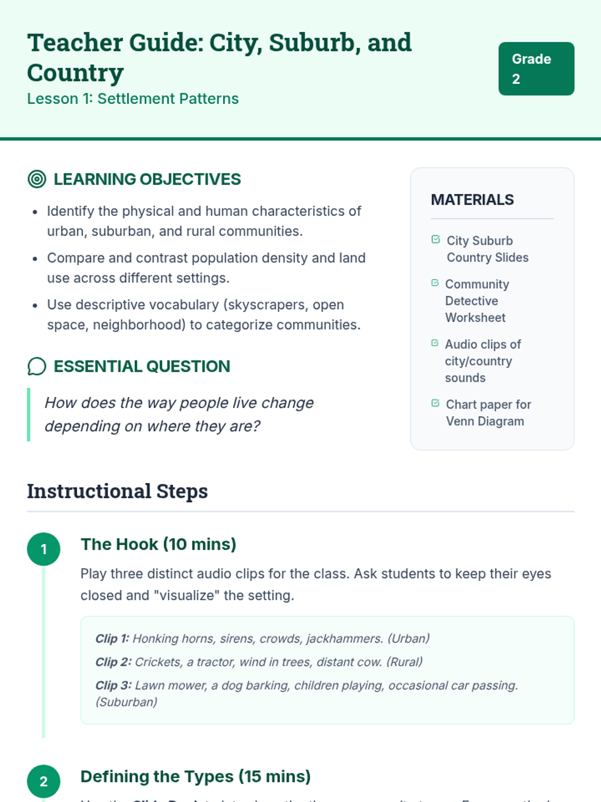 Students examine the complex interaction between humans and their environments, specifically looking at how people modify the land to meet their needs. The sequence distinguishes between rural, urban, and suburban settlement patterns and explores infrastructure like roads, bridges, and farms.