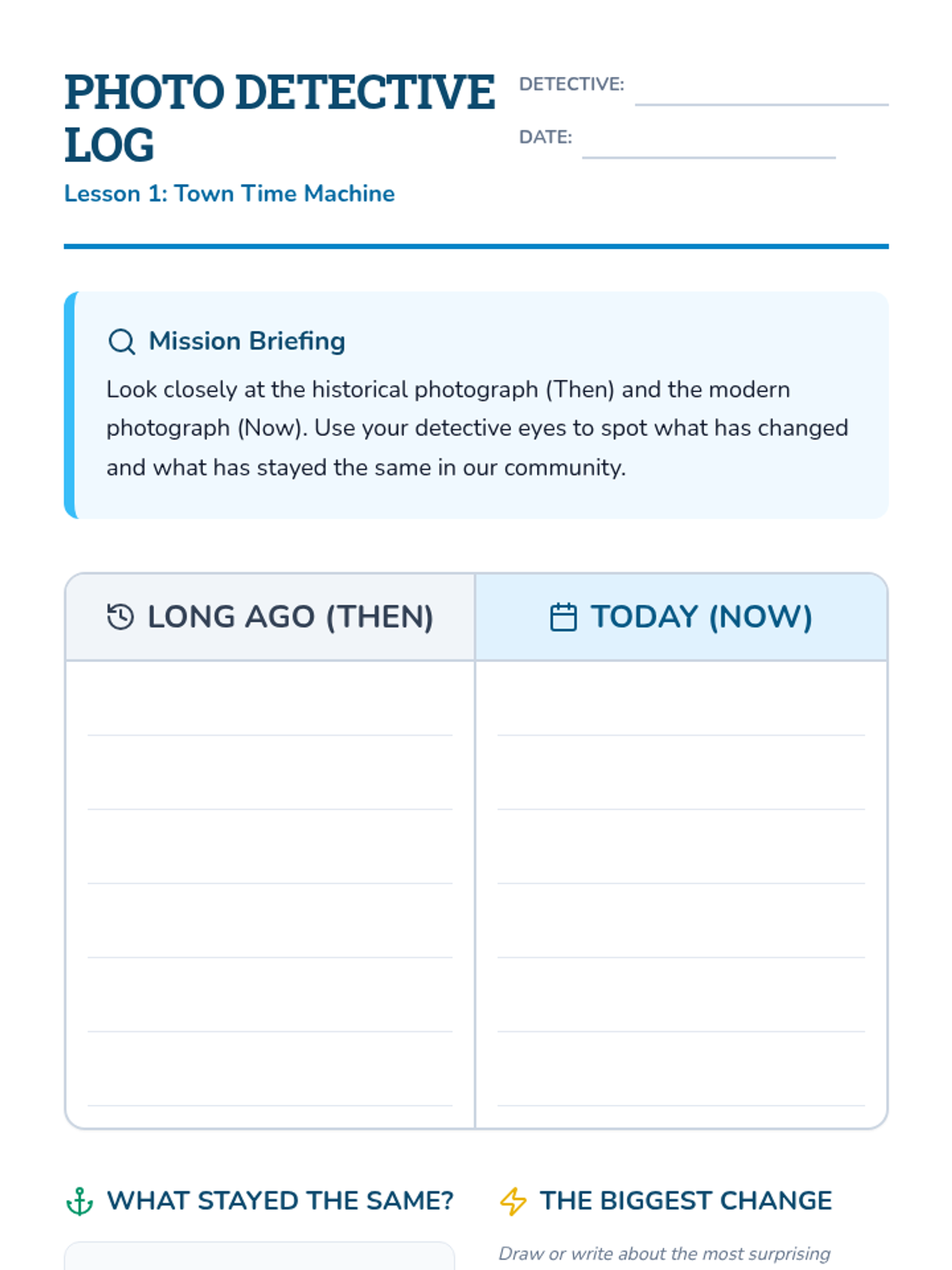 Students explore how and why communities change over time by analyzing historical photographs, investigating 'triggers' of change like technology and population growth, and mapping causal chains in community development.
