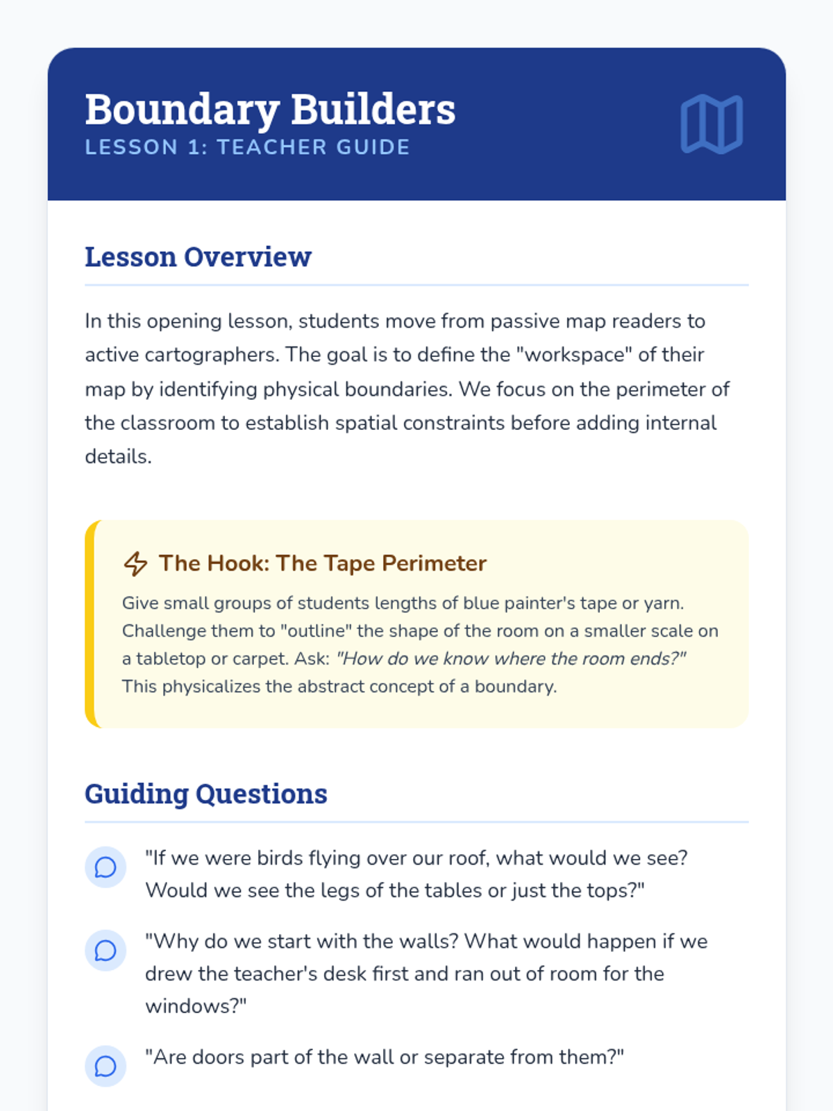 A project-based unit where 2nd-grade students become cartographers, learning to map their classroom by exploring boundaries, scale, symbols, and spatial organization.