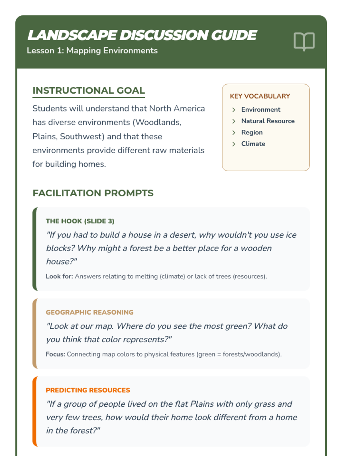 A 2nd-grade history sequence exploring how Native American nations adapted to their environments by building shelters from local natural resources across North America.