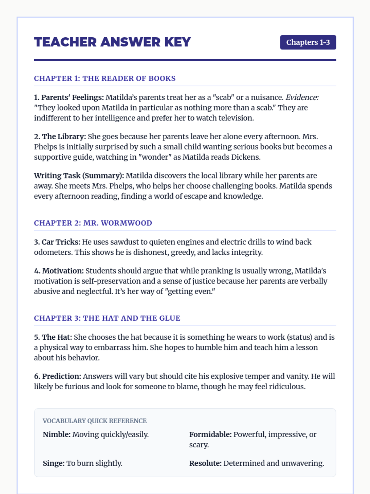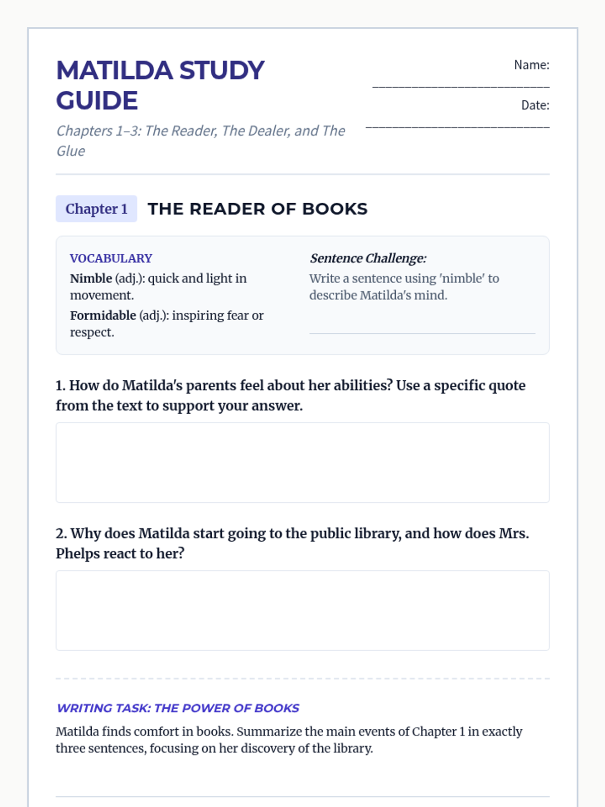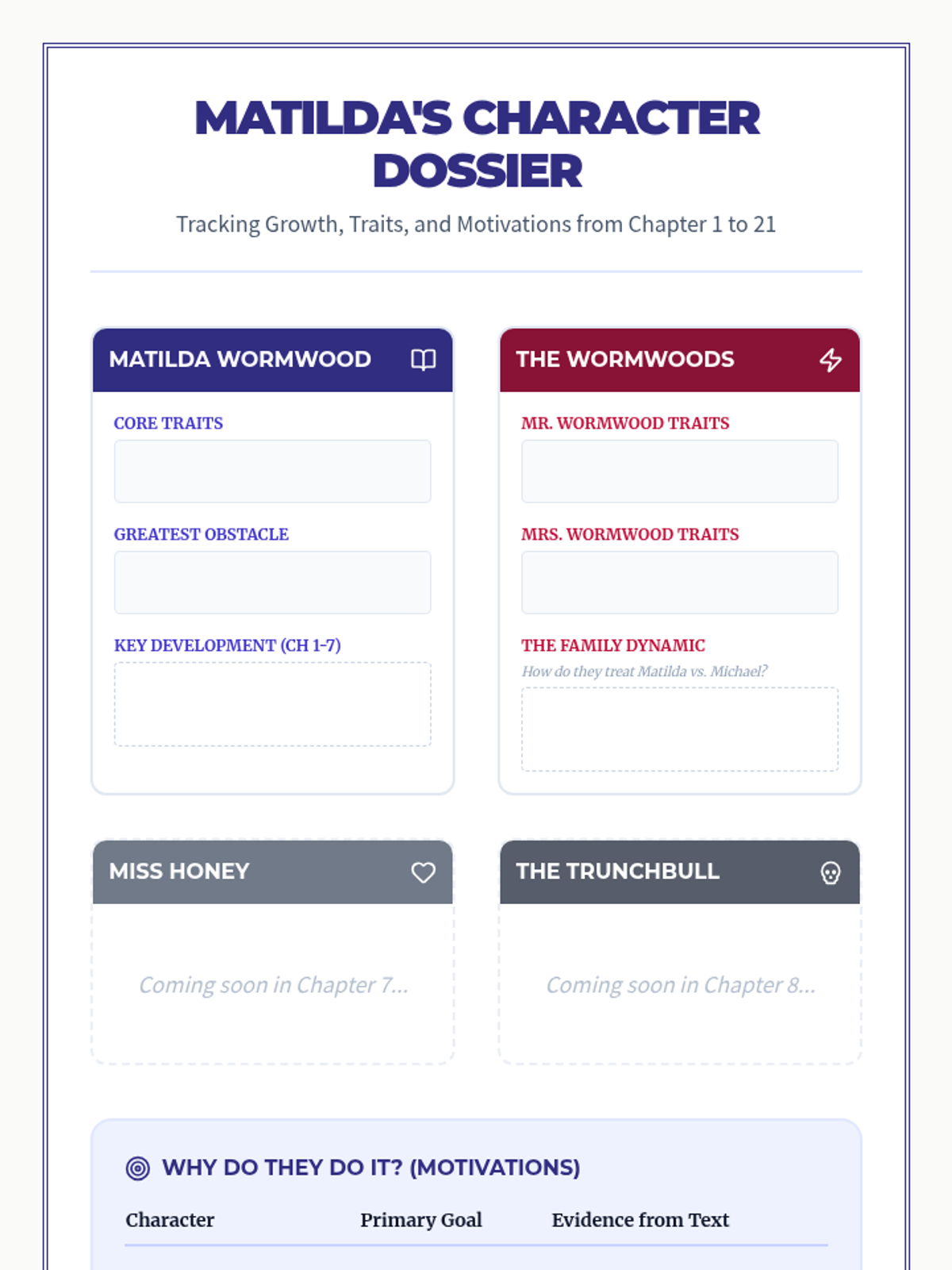 A comprehensive novel study for Roald Dahl's 'Matilda', focusing on character development, text evidence, and creative writing across 21 chapters.