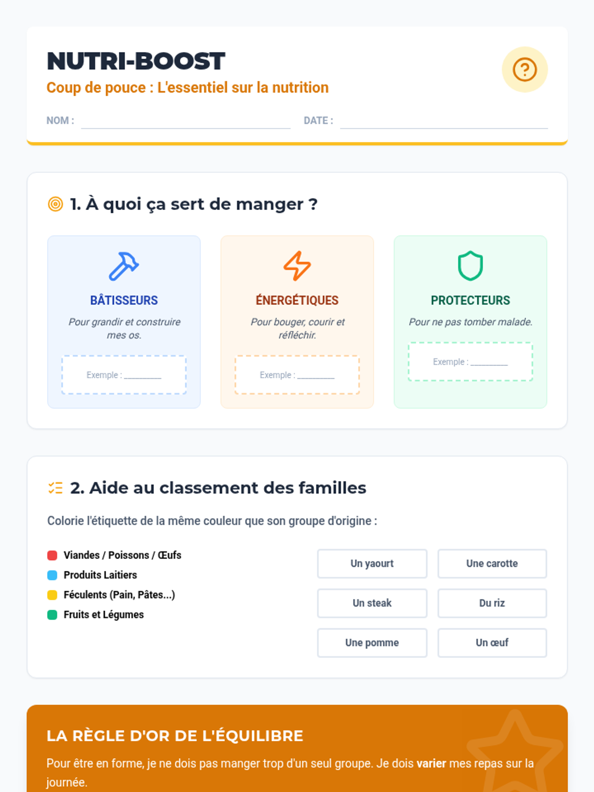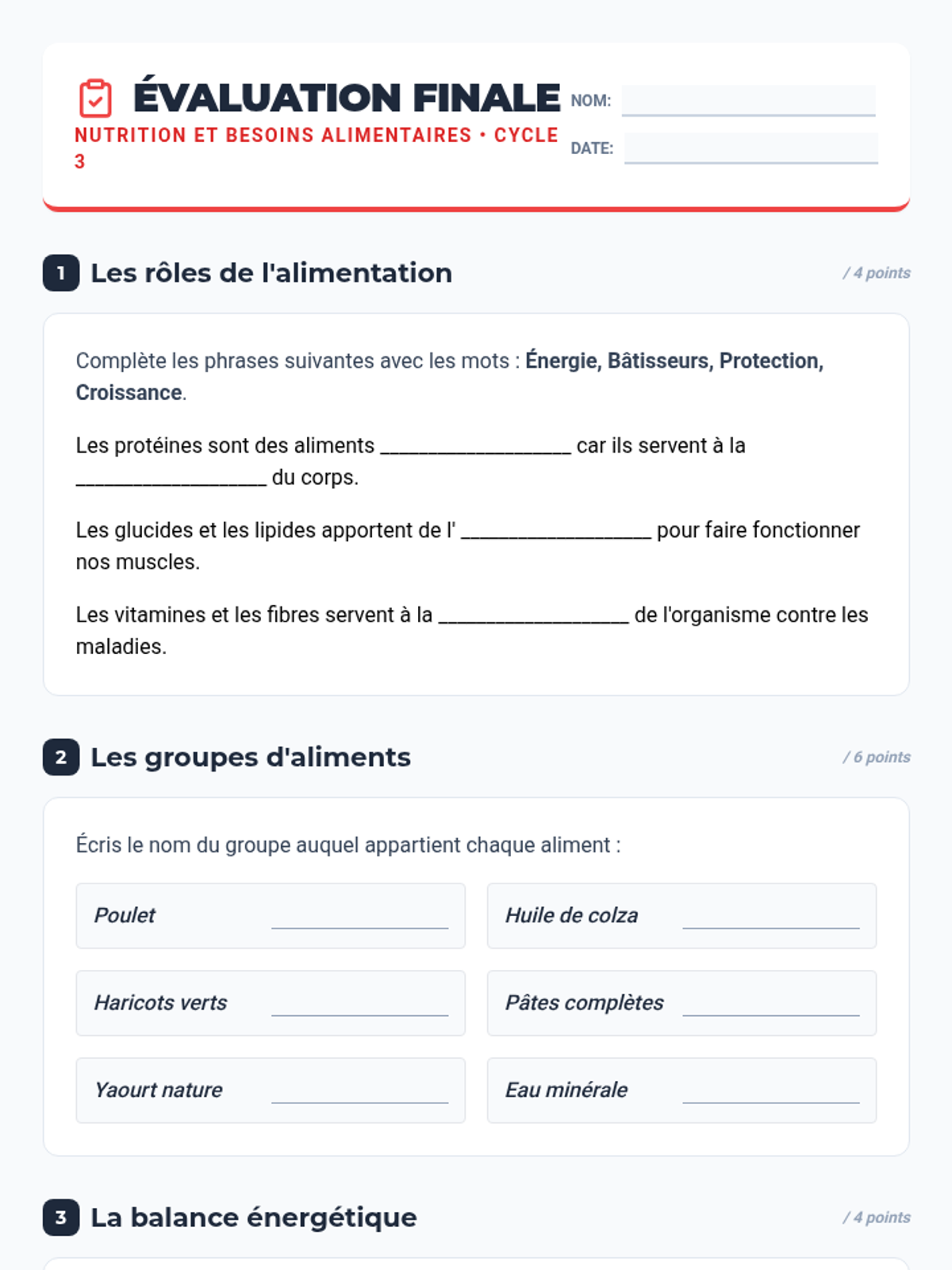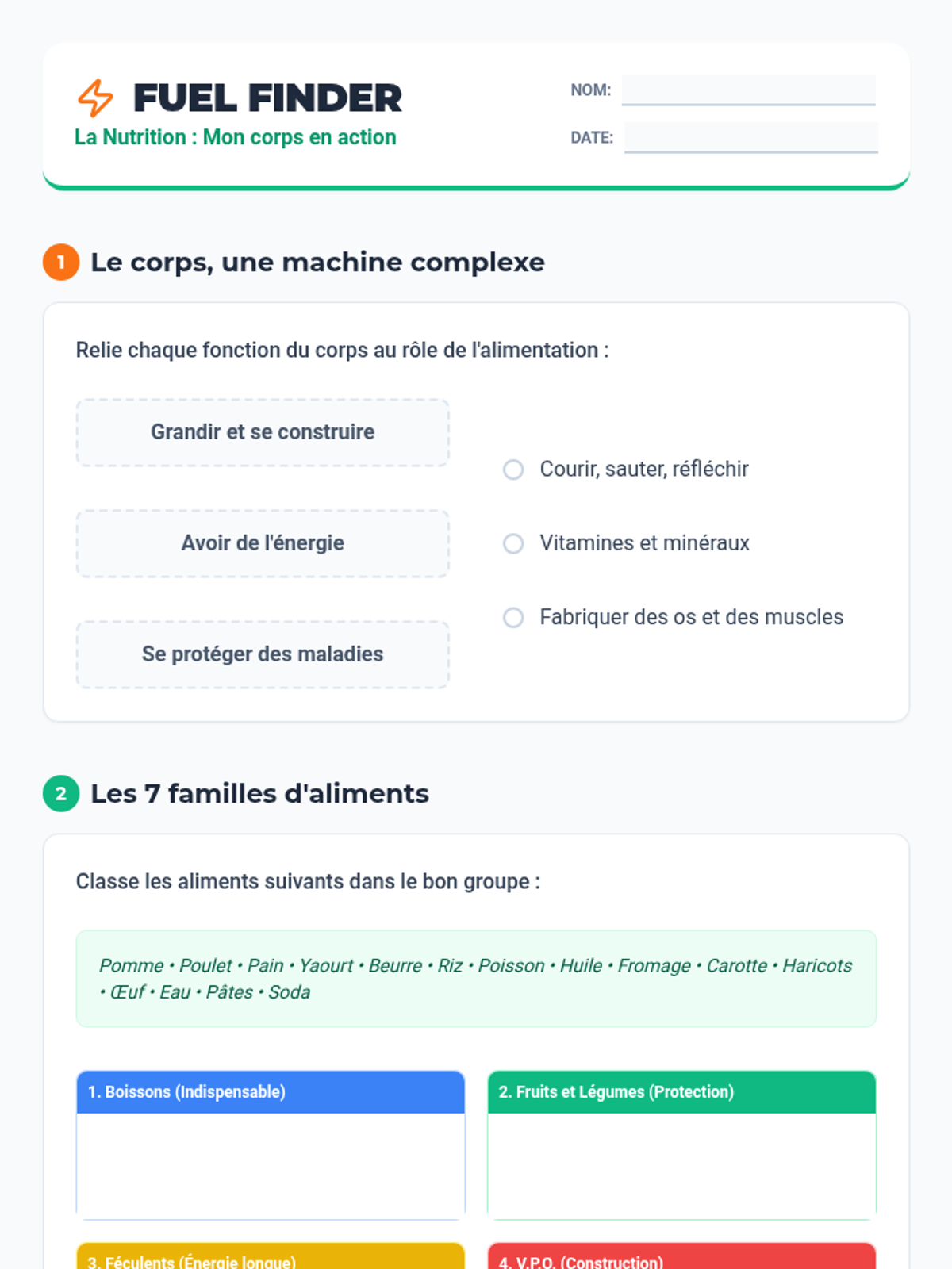 Unité complète sur le fonctionnement du corps humain, se concentrant sur la nutrition, la digestion et l'importance d'une alimentation saine pour la croissance et l'activité.