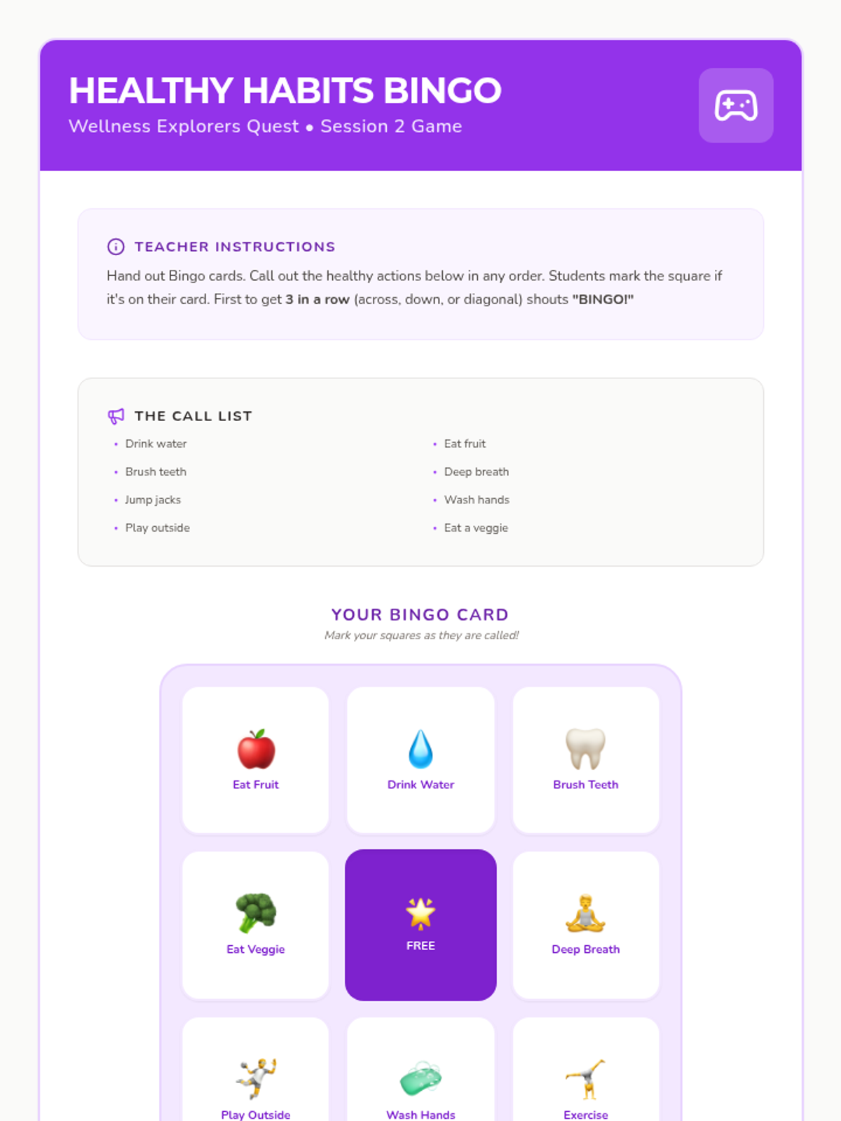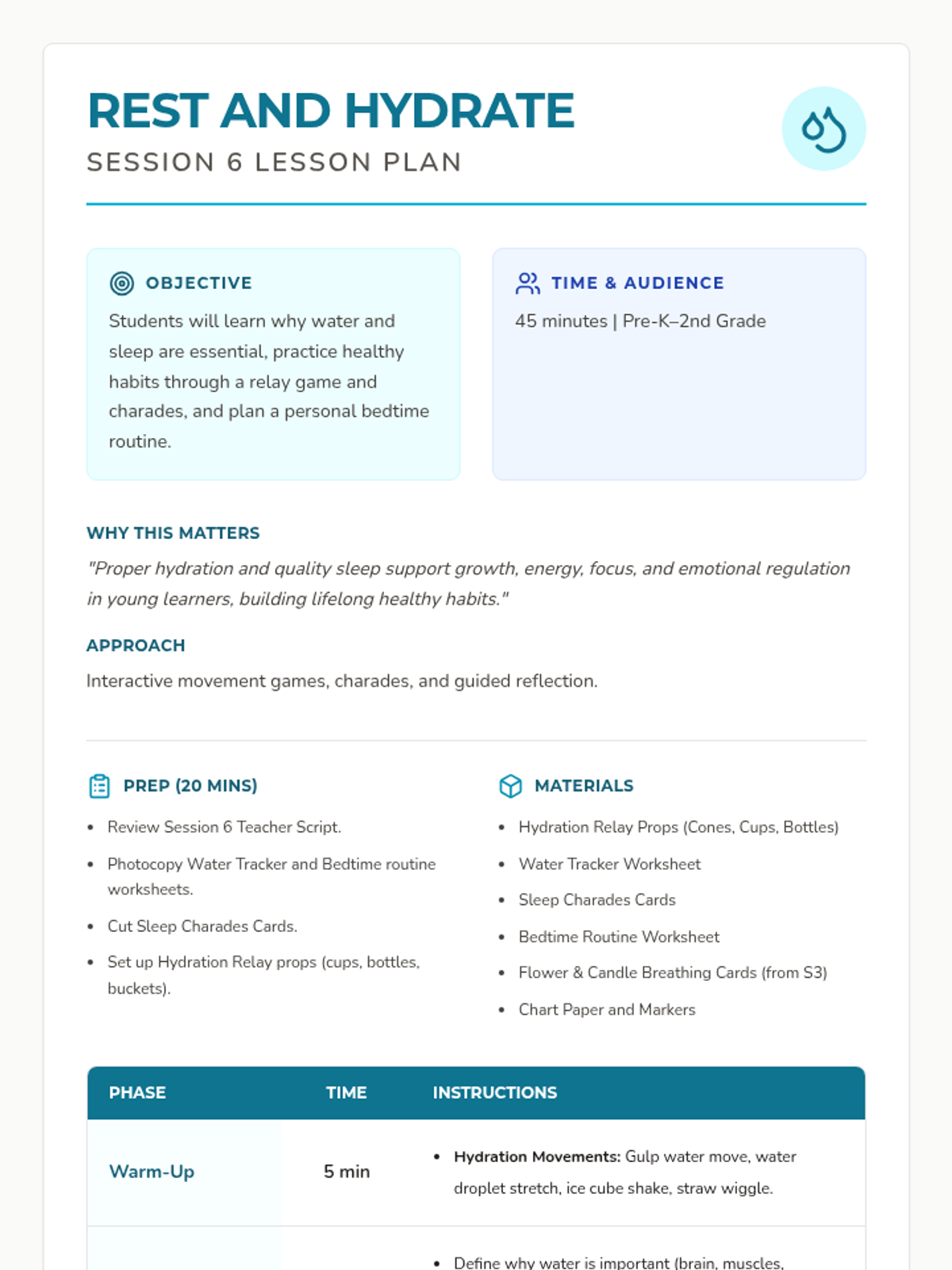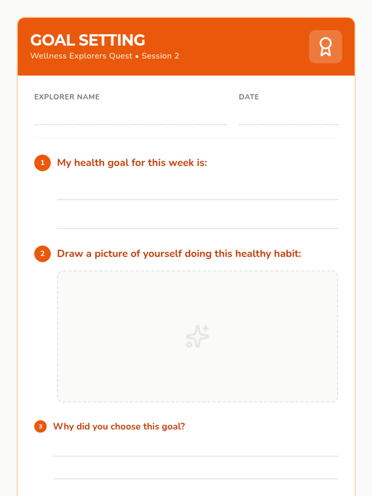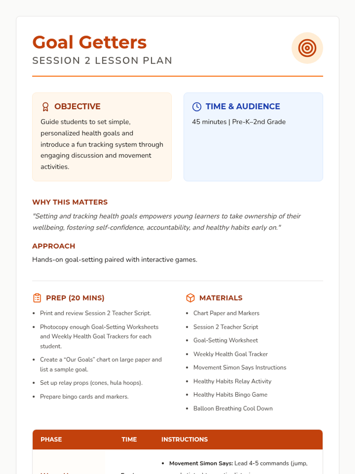 A 12-session group health and wellbeing program for Pre-K–2nd graders exploring functional health, goal-setting, communication, and physical wellness through a 'Quest' theme. This sequence includes the first 8 sessions with complete lesson plans, scripts, and student activities.