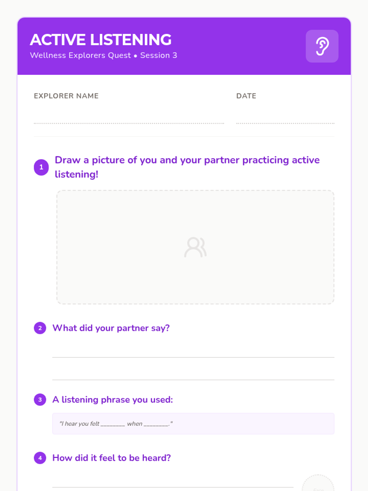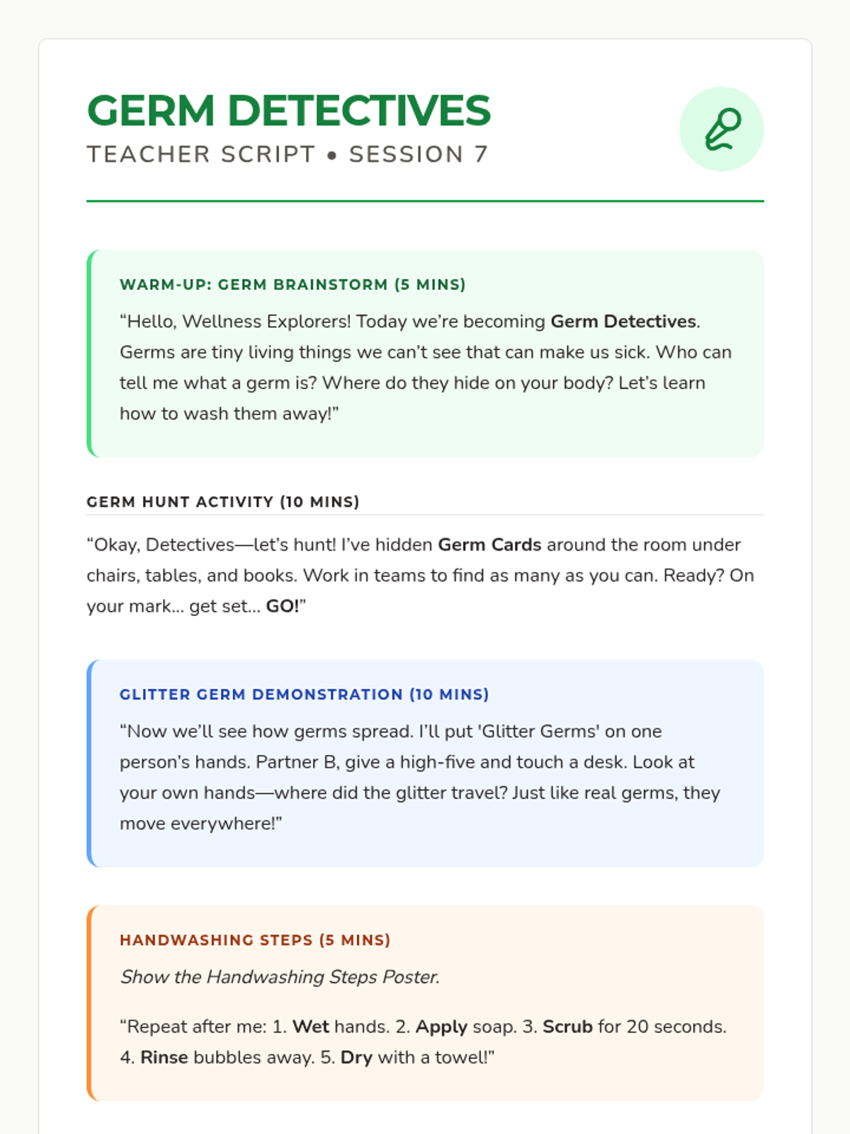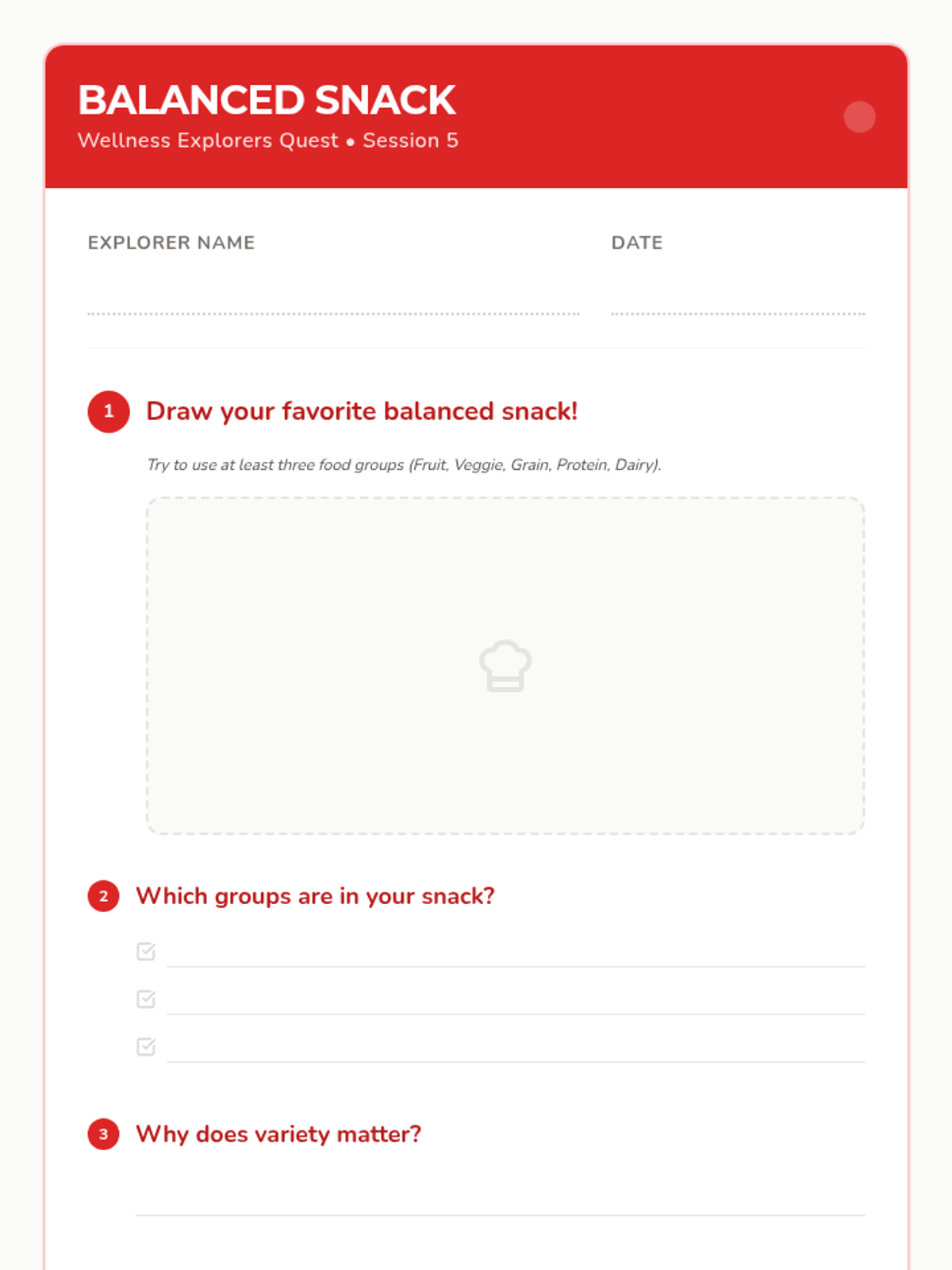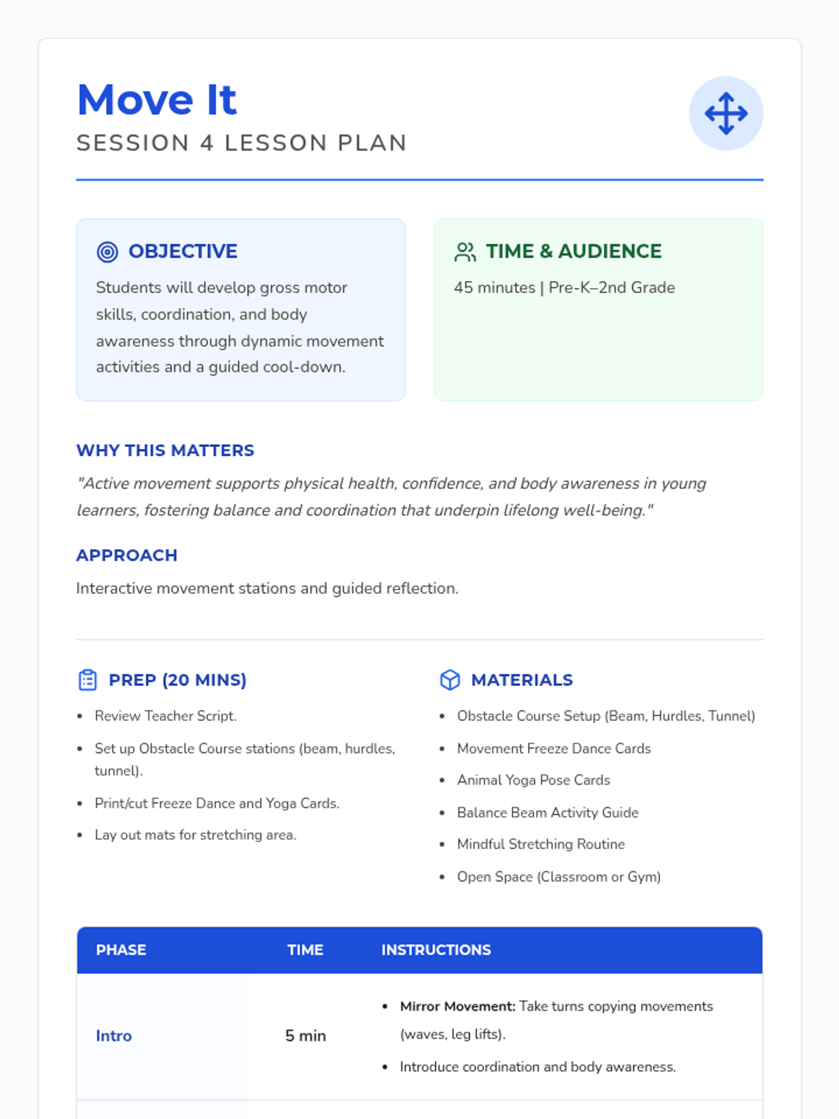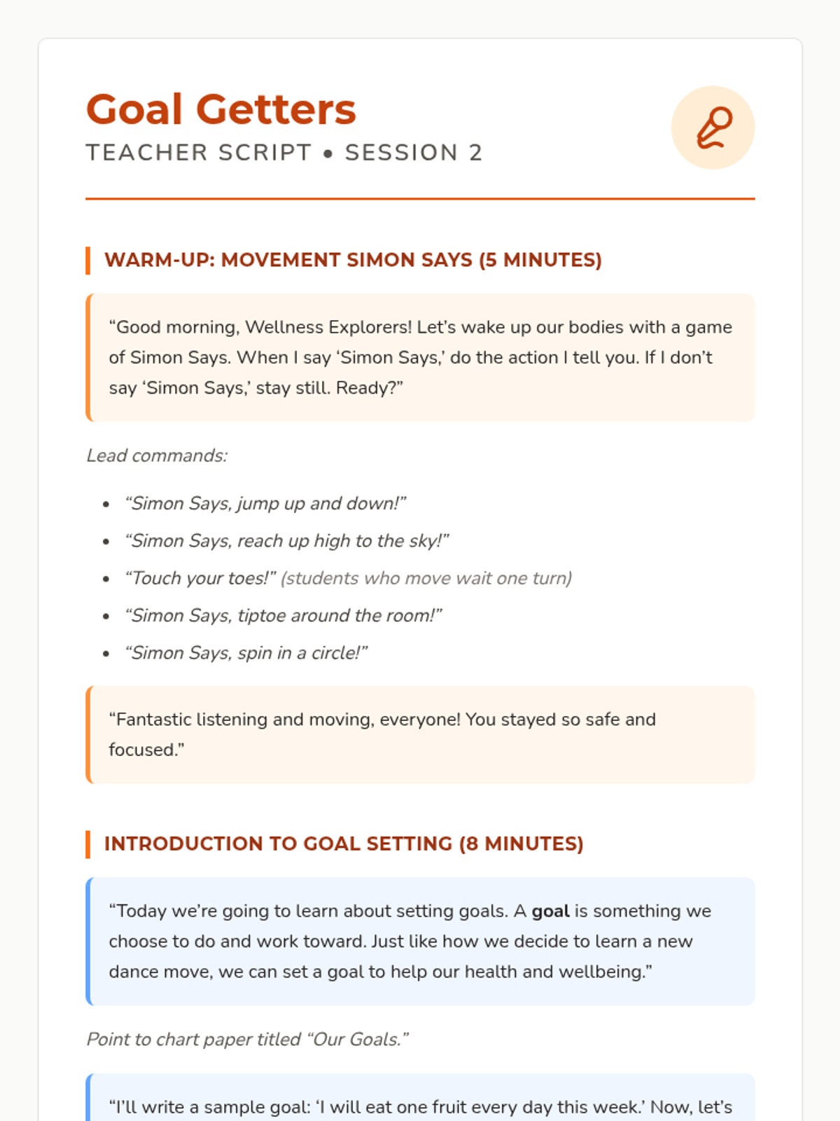 A 12-session group health and wellbeing program for Pre-K–2nd graders exploring functional health, goal-setting, communication, and physical wellness through a 'Quest' theme. This sequence includes the first 8 sessions with complete lesson plans, scripts, and student activities.