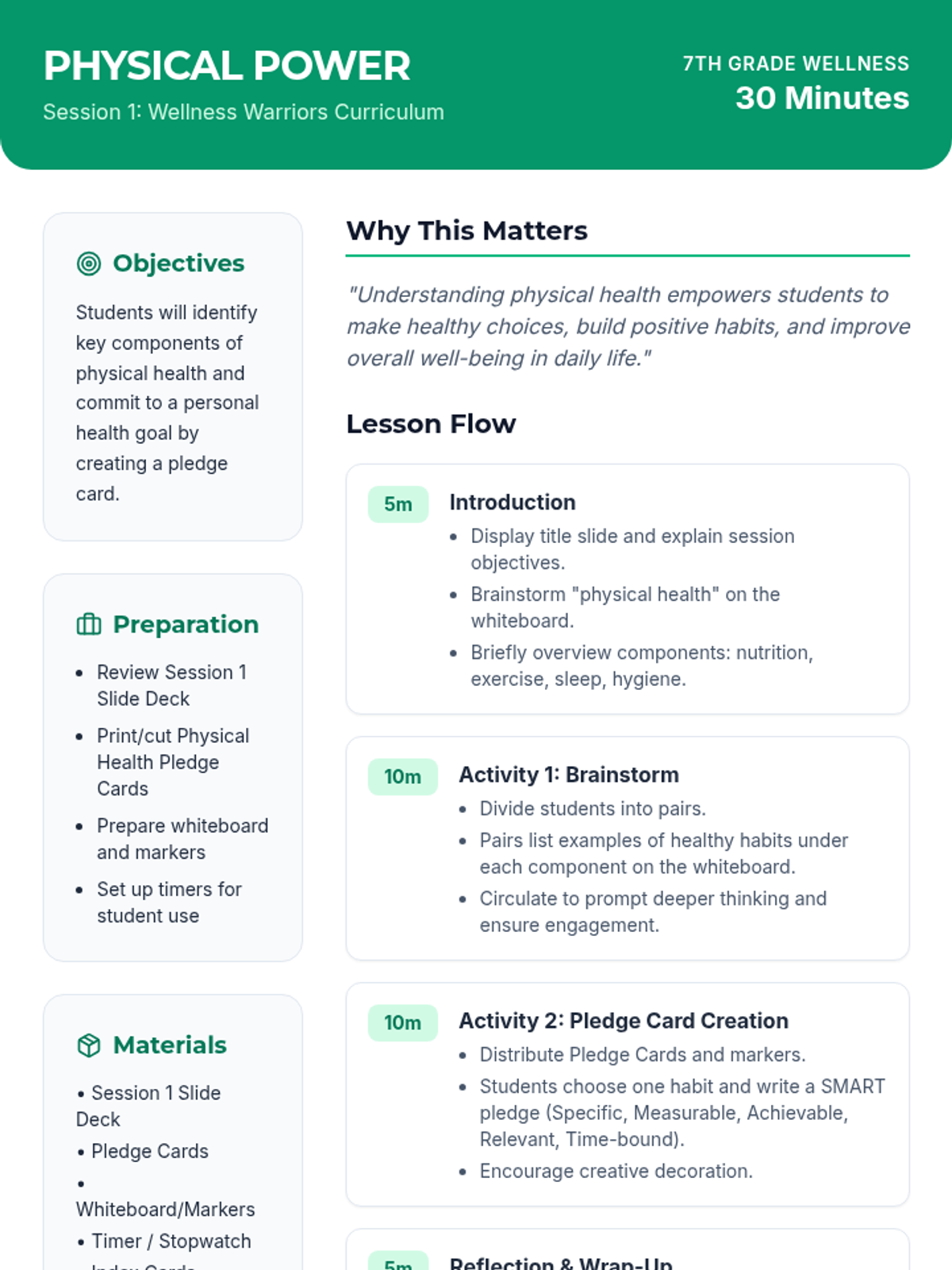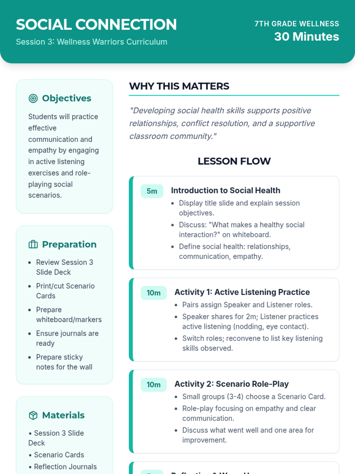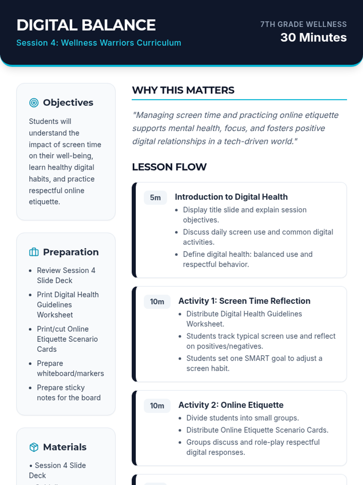 A 4-session wellness curriculum for 7th graders covering physical, emotional, social, and digital well-being through interactive activities and goal-setting.