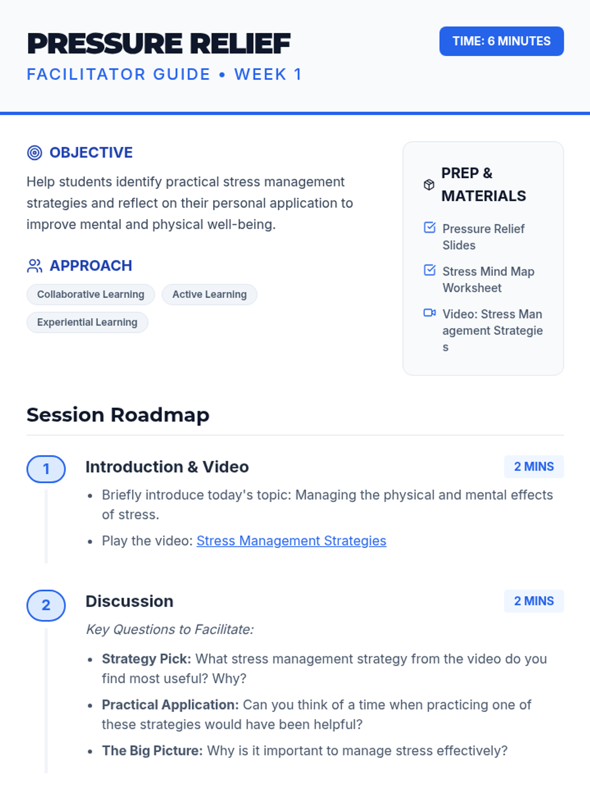 A weekly series of wellness sessions for high school students focusing on building practical stress and time management skills through video analysis, discussion, and experiential activities.