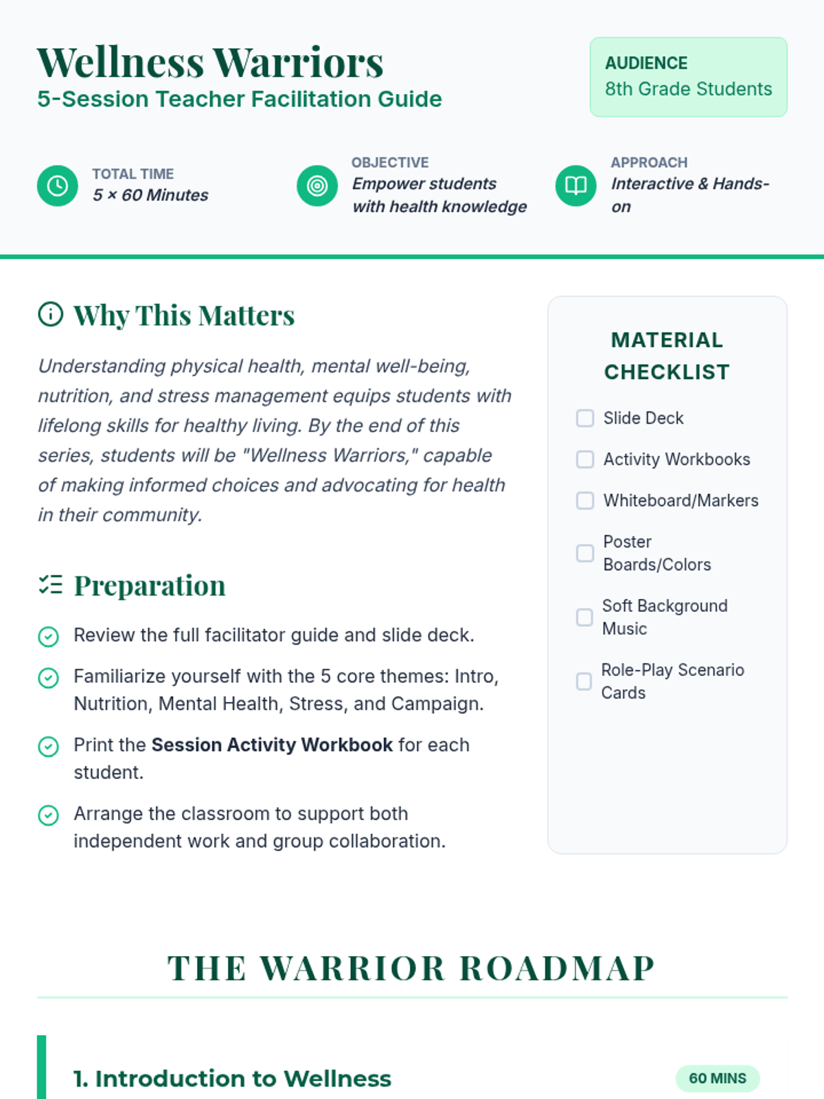 A 5-session wellness series for 8th graders covering physical health, mental well-being, nutrition, and stress management.