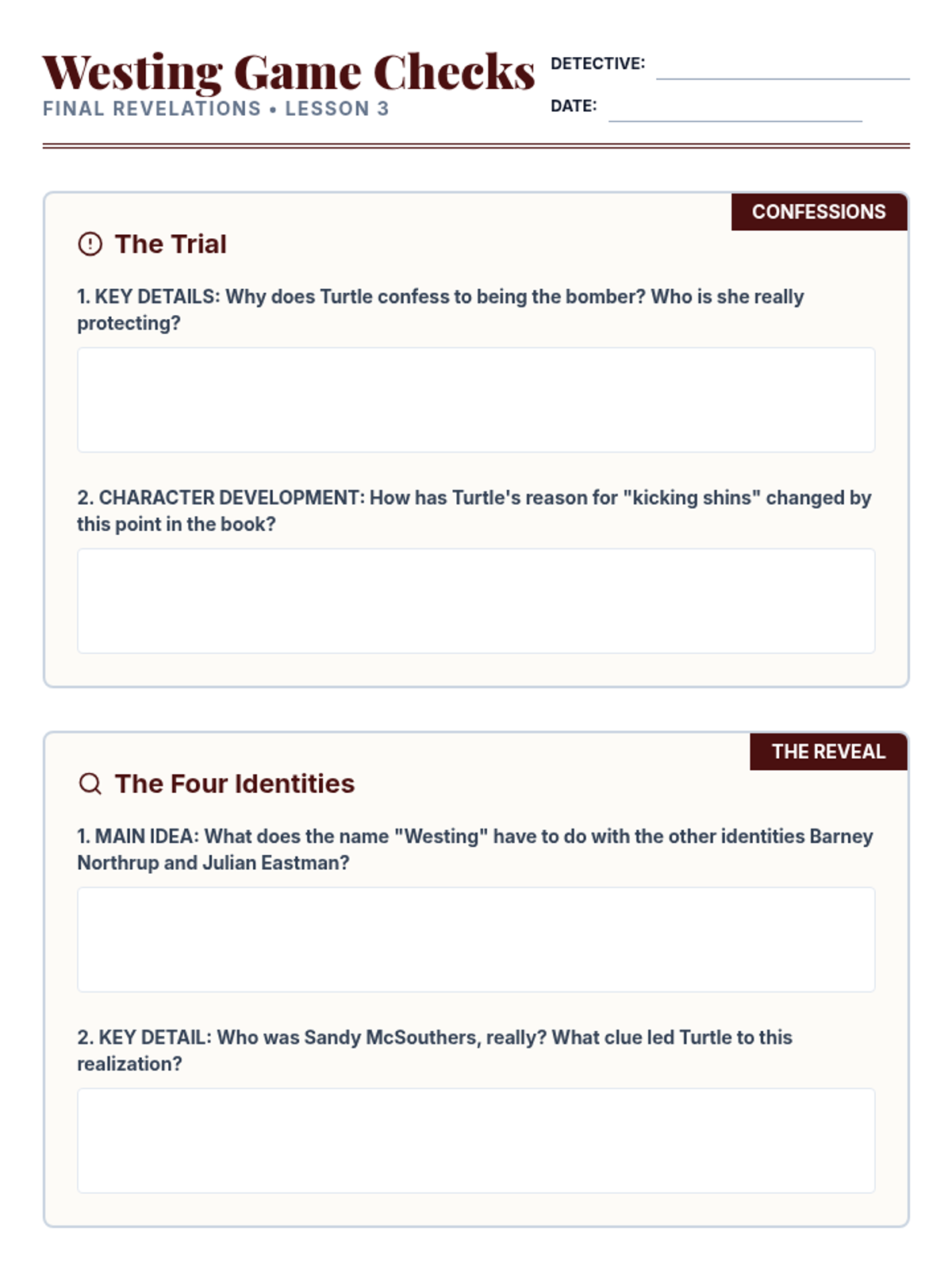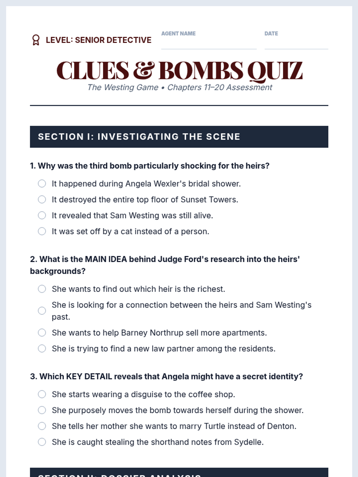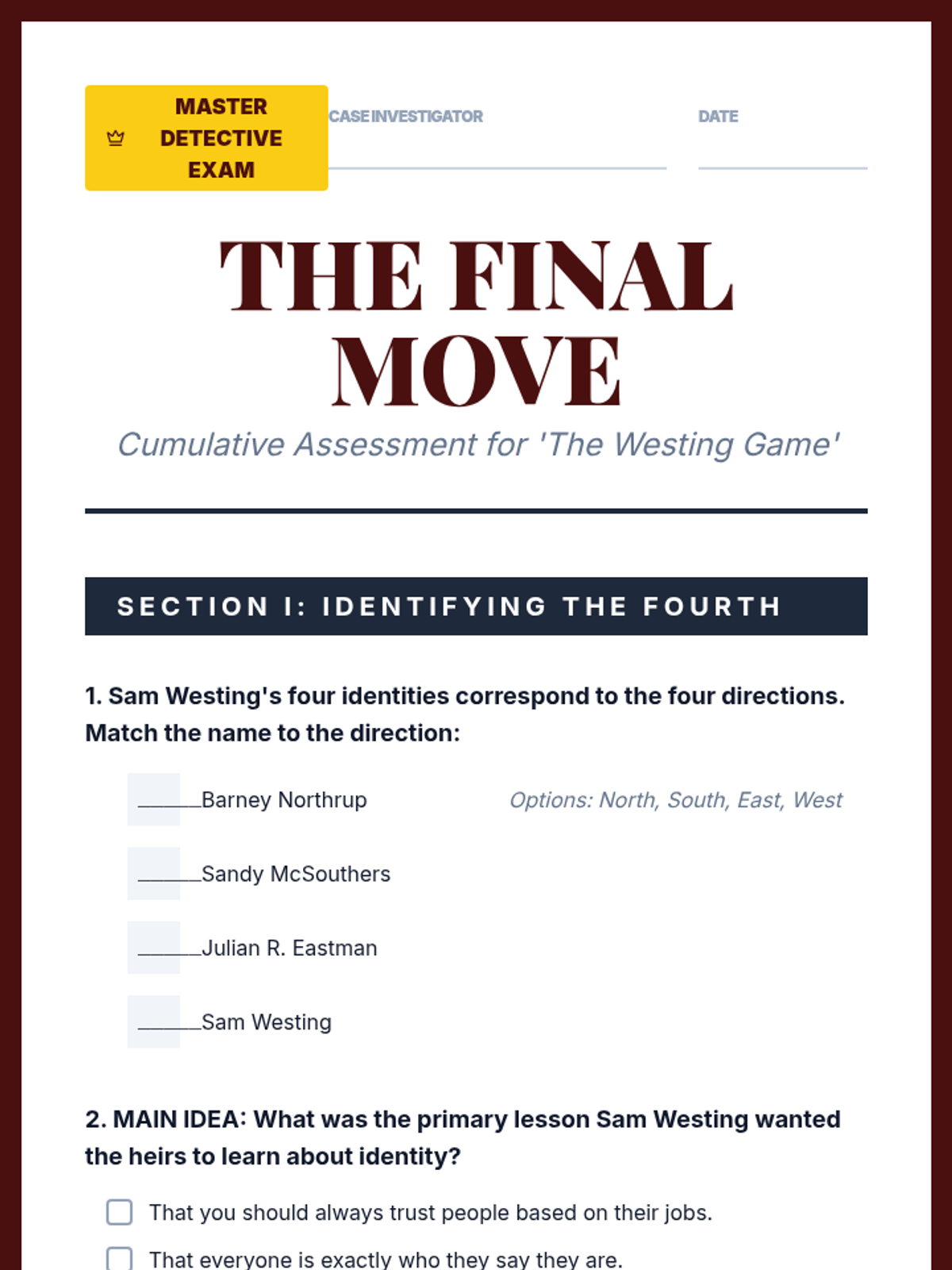 A comprehensive unit for Ellen Raskin's 'The Westing Game', focusing on character analysis, main idea, and key details through a mystery-themed lens. Includes slide decks for instruction, chapter-by-chapter exit tickets, and cumulative quizzes for each section of the novel.