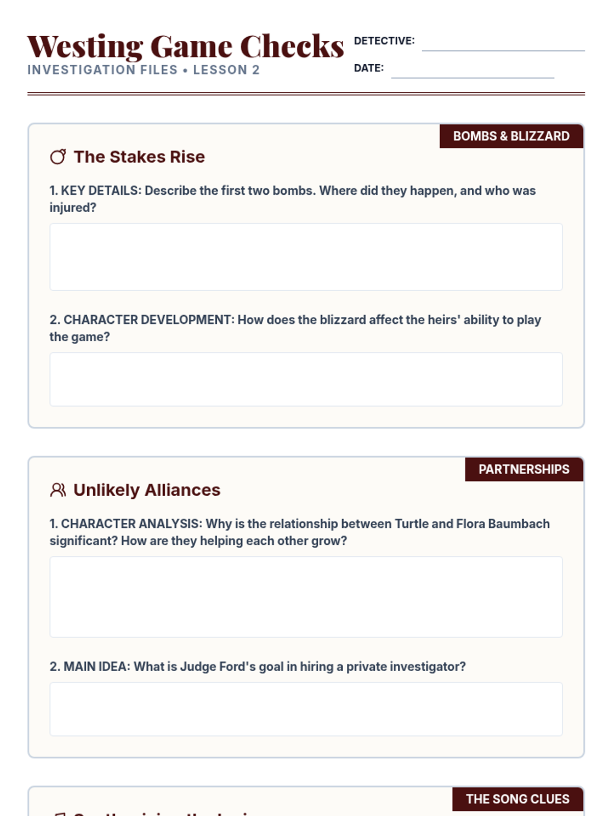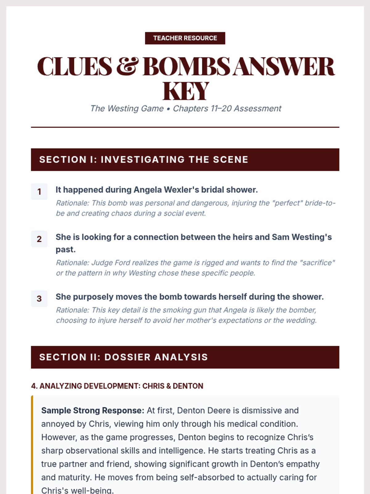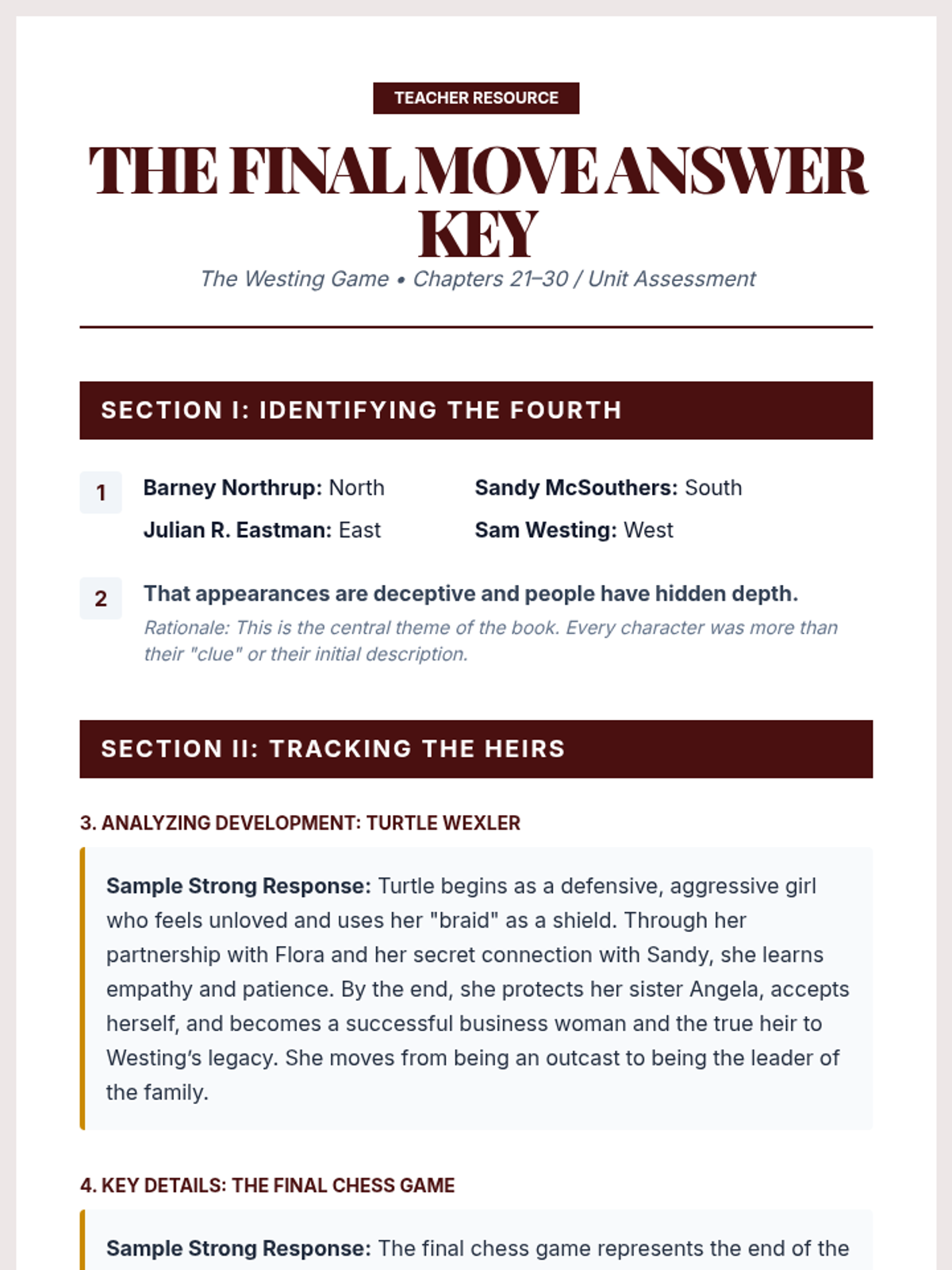 A comprehensive unit for Ellen Raskin's 'The Westing Game', focusing on character analysis, main idea, and key details through a mystery-themed lens. Includes slide decks for instruction, chapter-by-chapter exit tickets, and cumulative quizzes for each section of the novel.