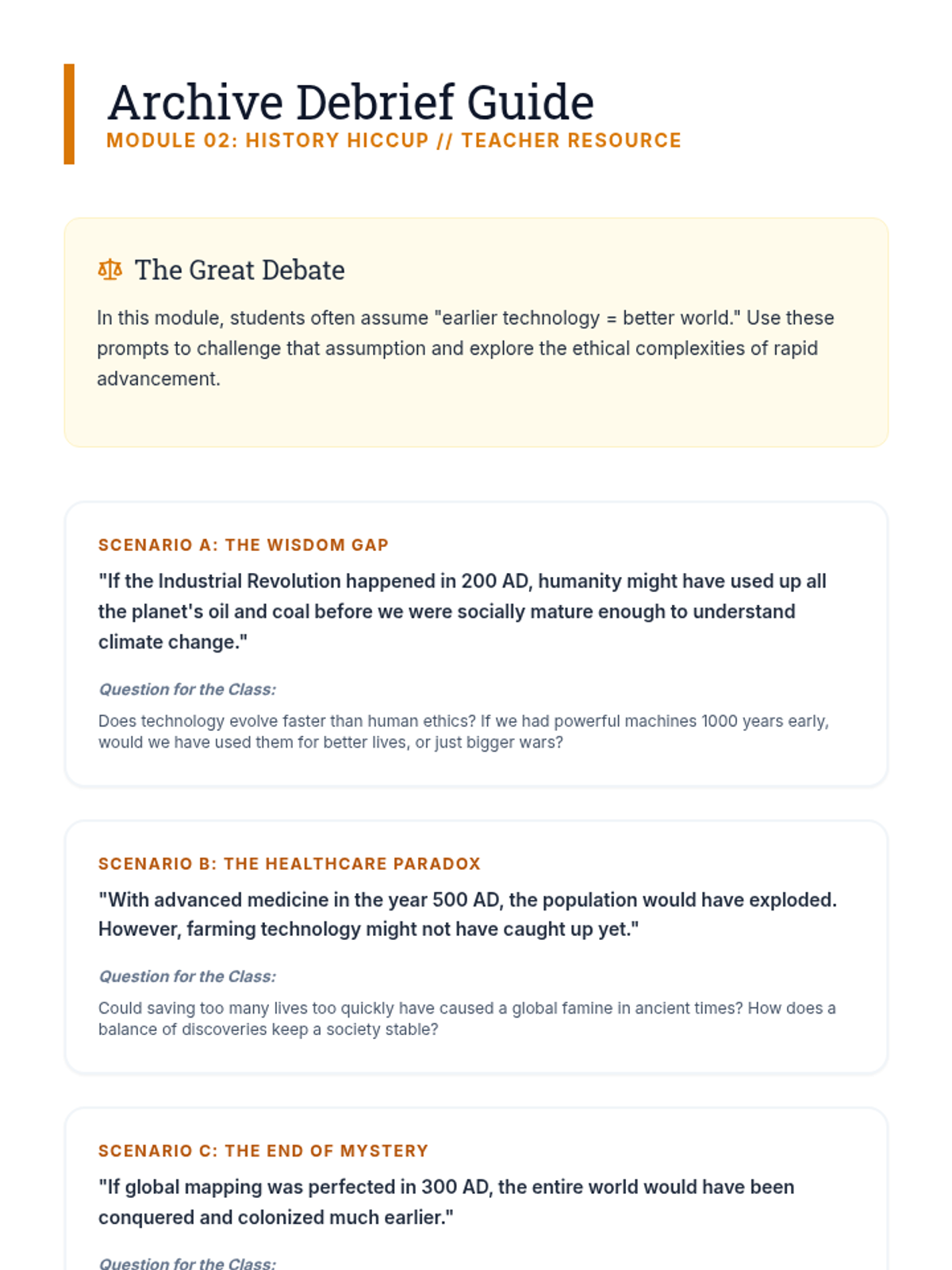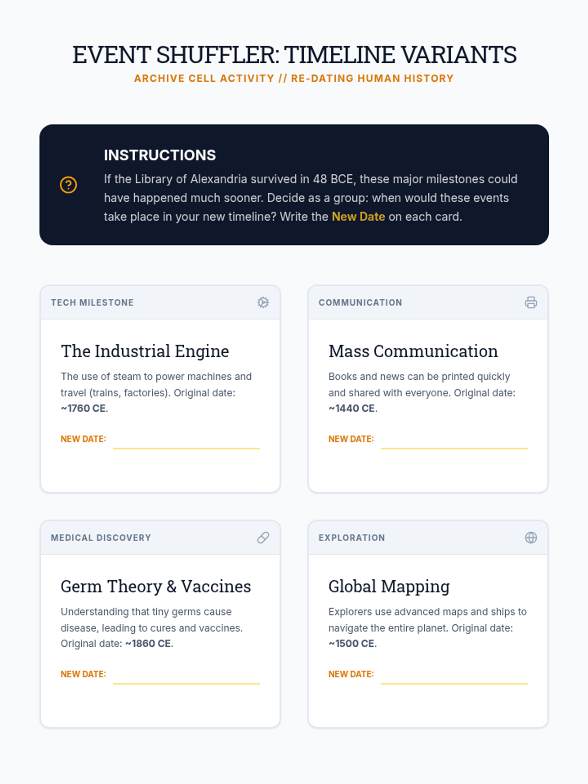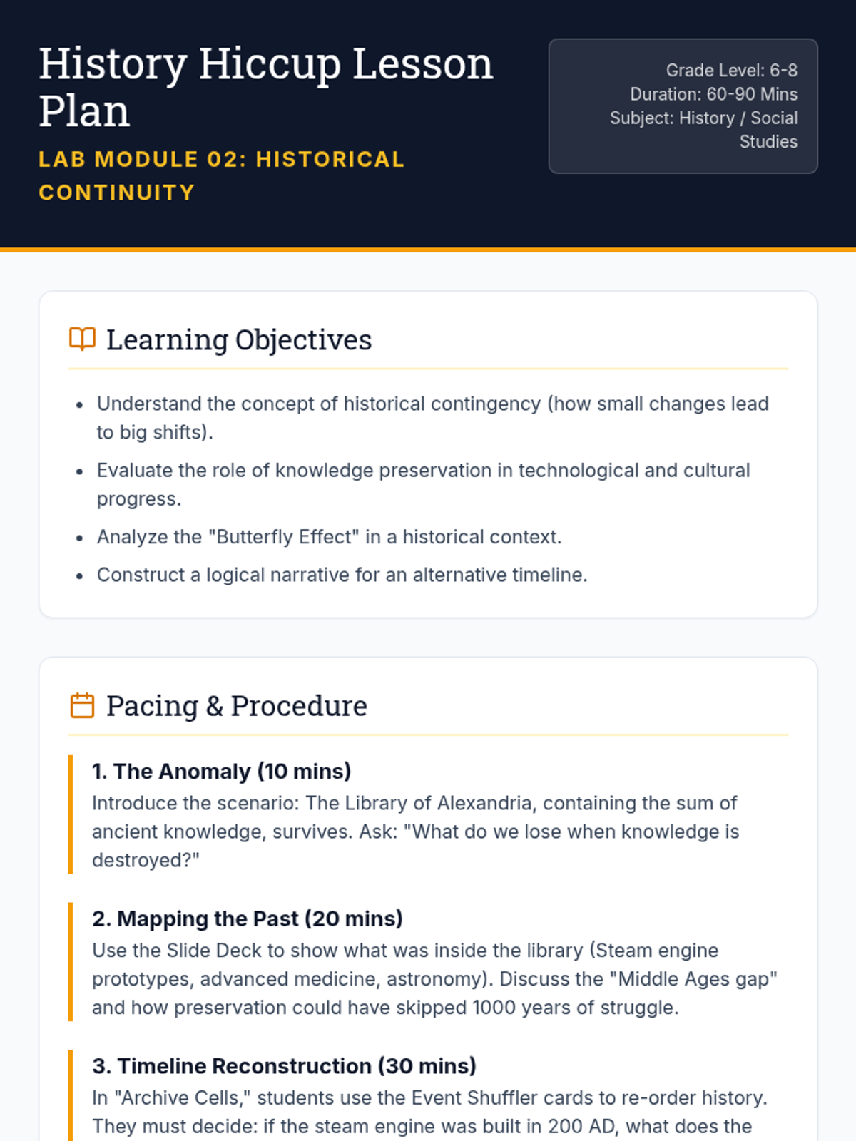 A series of three investigative modules where middle school students analyze hypothetical disruptions to science, history, and society to develop critical cause-and-effect reasoning skills.