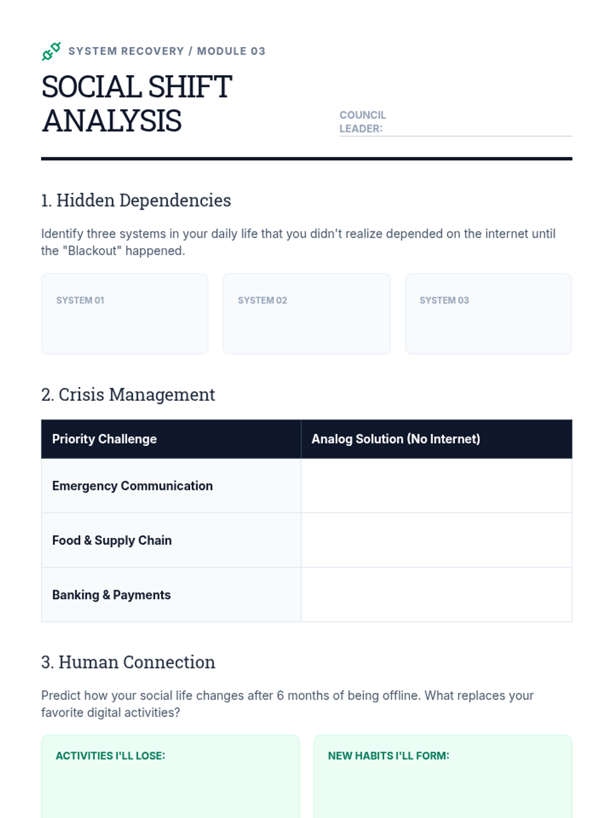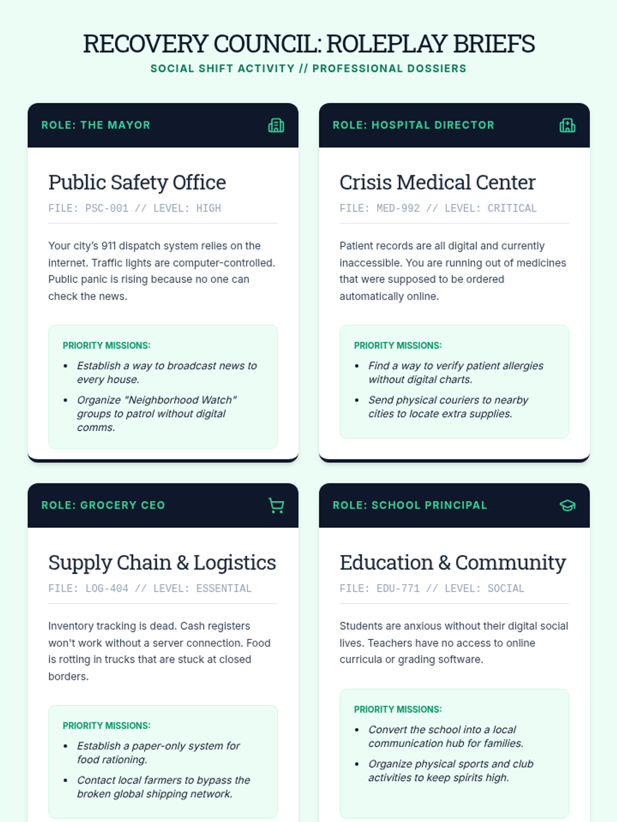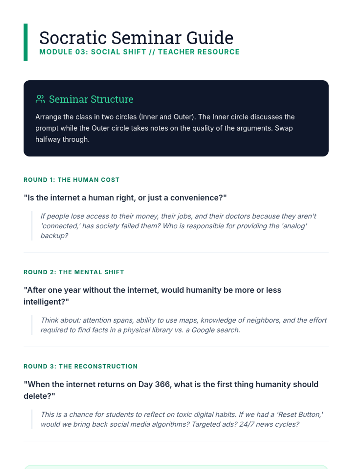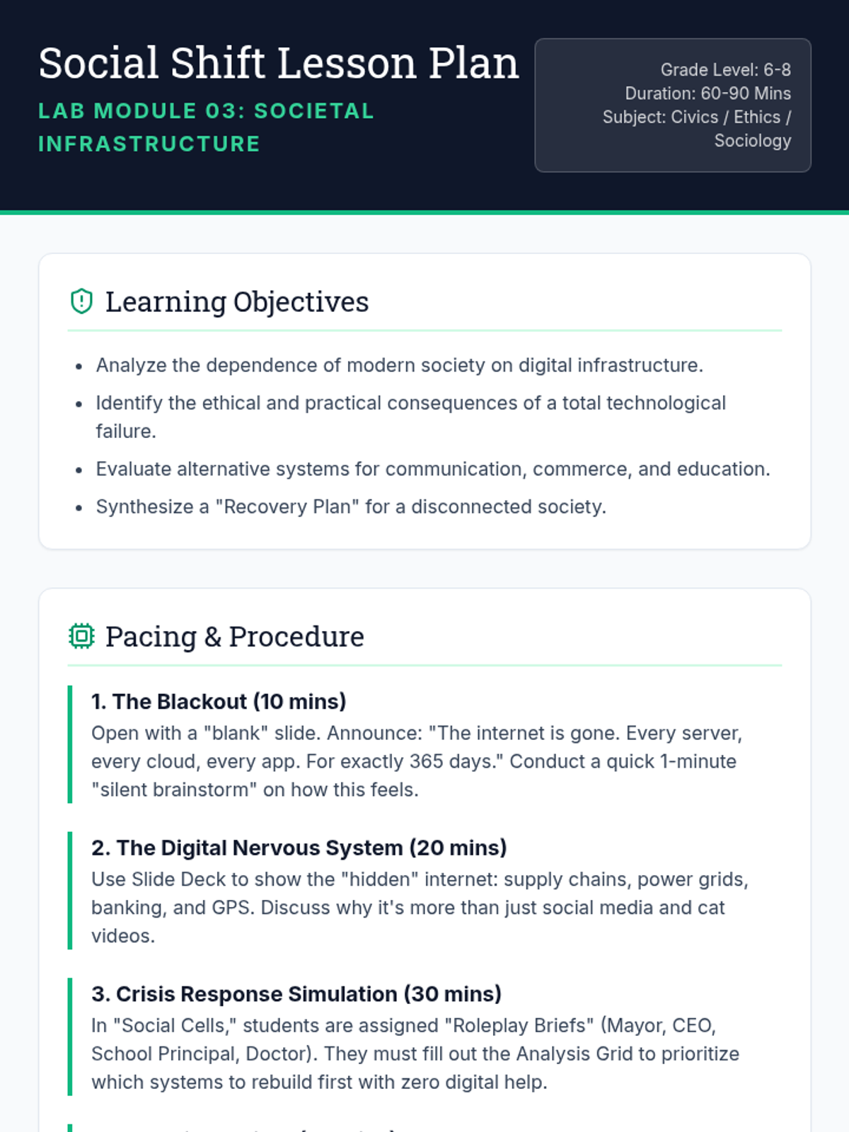 A series of three investigative modules where middle school students analyze hypothetical disruptions to science, history, and society to develop critical cause-and-effect reasoning skills.